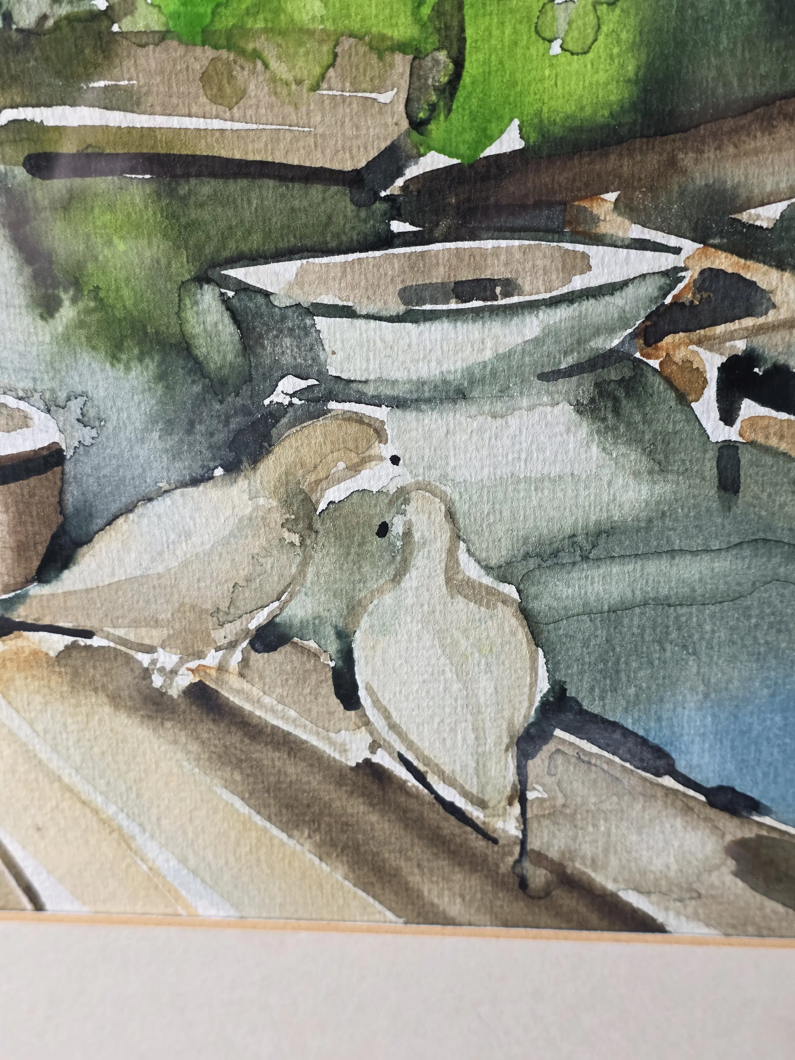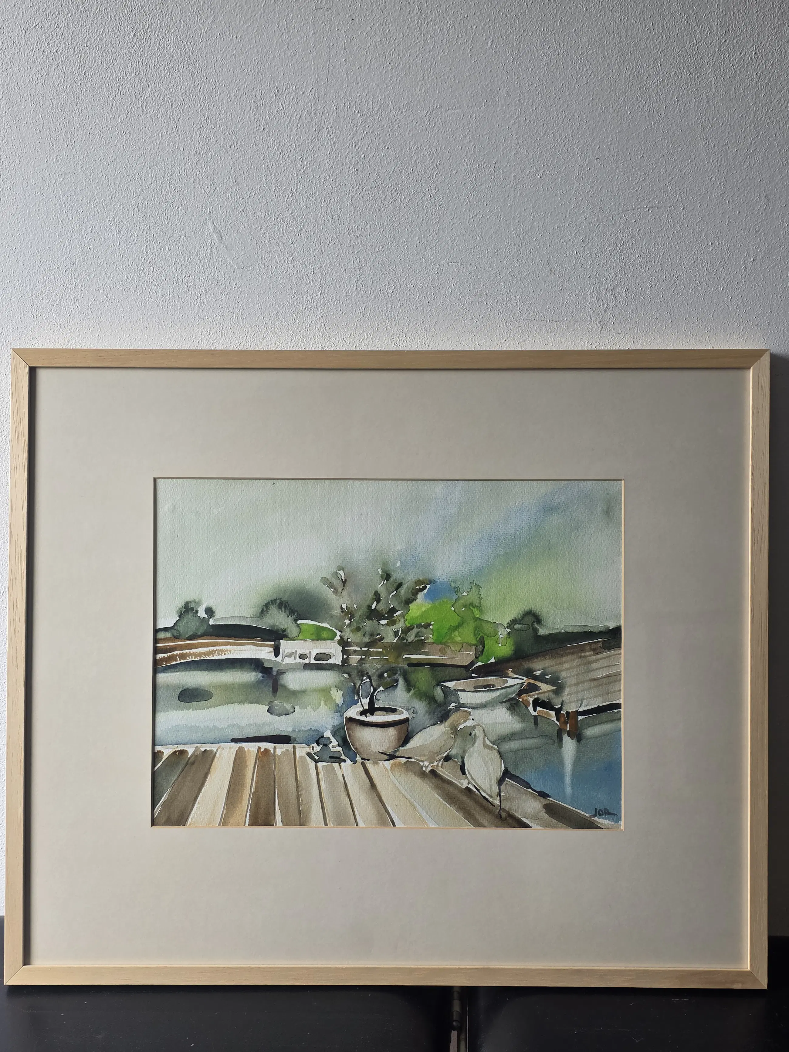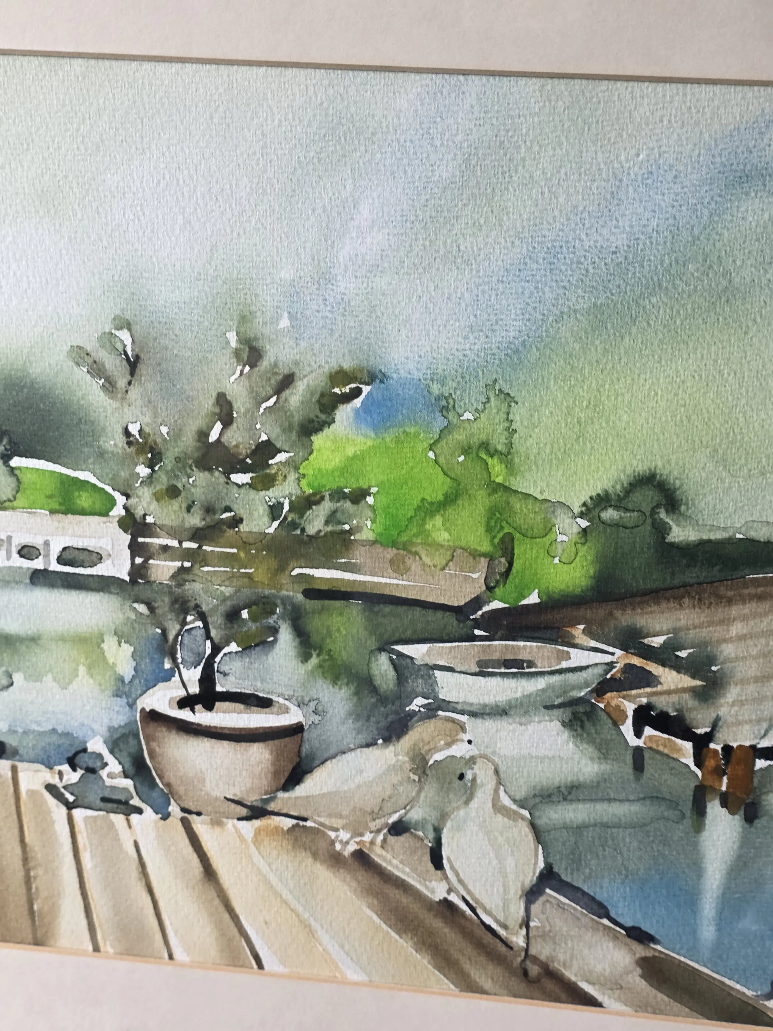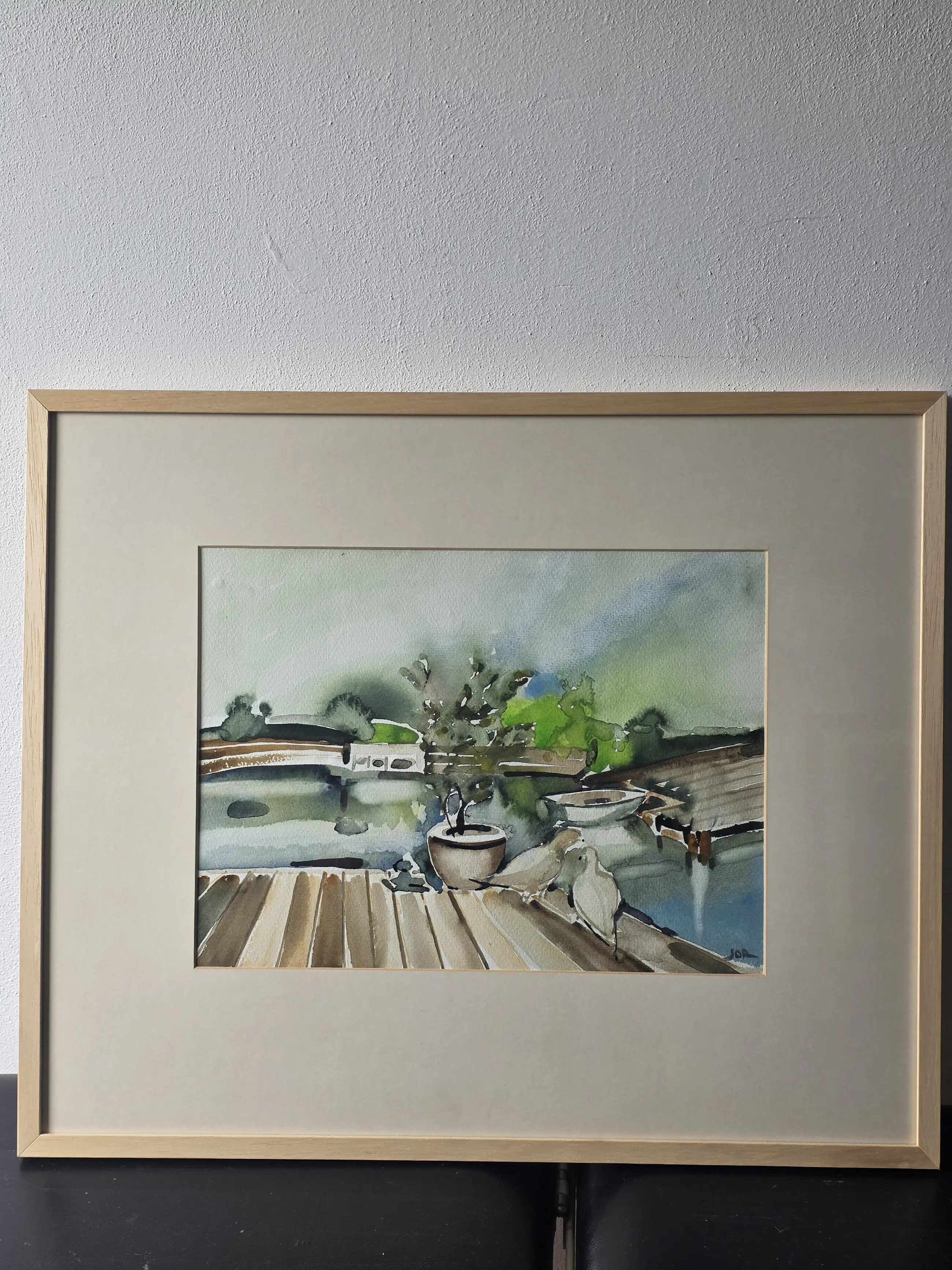 Duiven in de tuin, aquarel van Jan Jordens in zeer goede staat, 24x34 met lijst 47x37 word zorgvuldig verpakt en verzekerd verzonden.