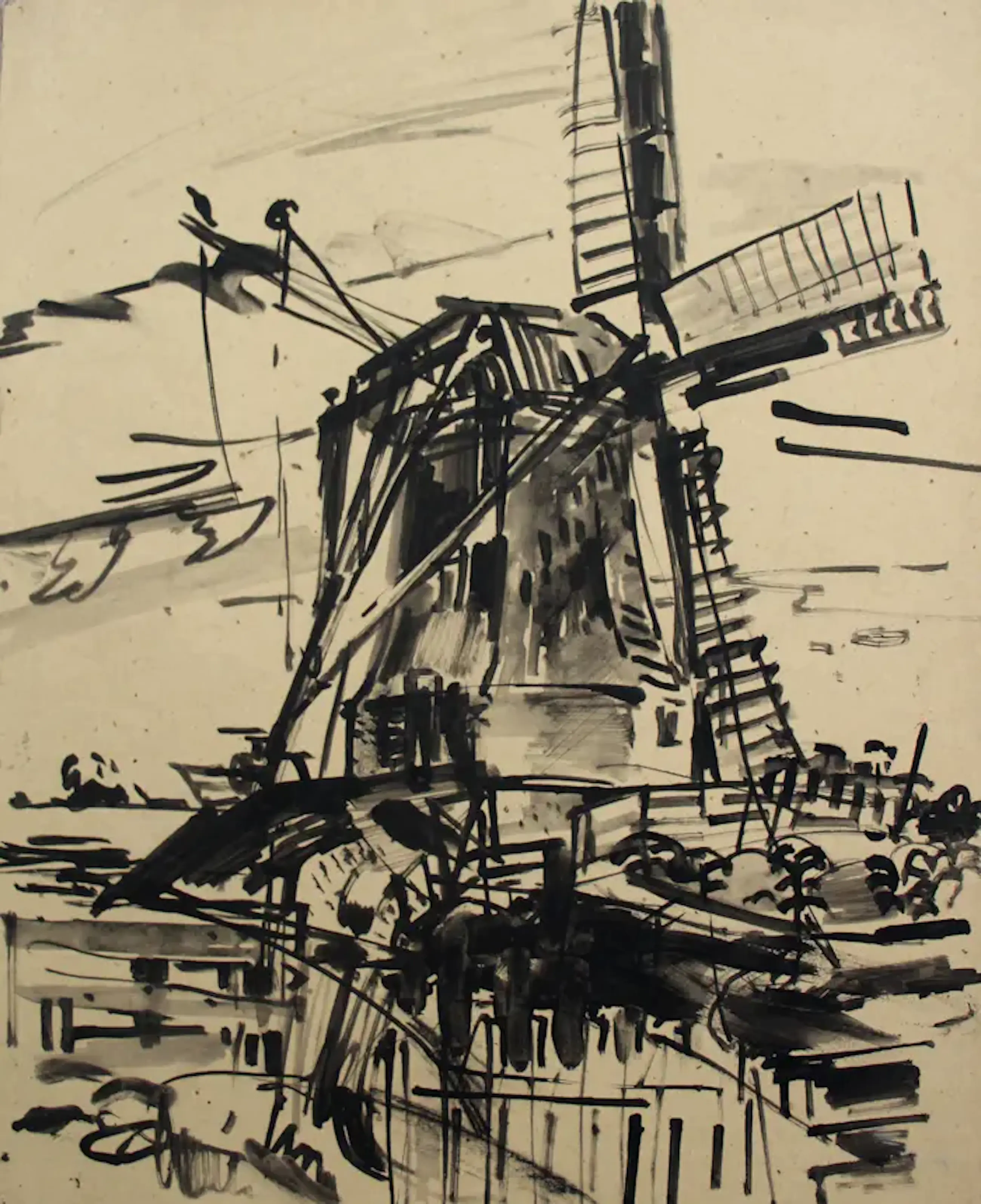 Gemengde techniek van Jan Jordens. Voorstelling van een molen. Afmetingen blad: H43 x b35cm. Het werk is niet gesigneerd door de kunstenaar.
