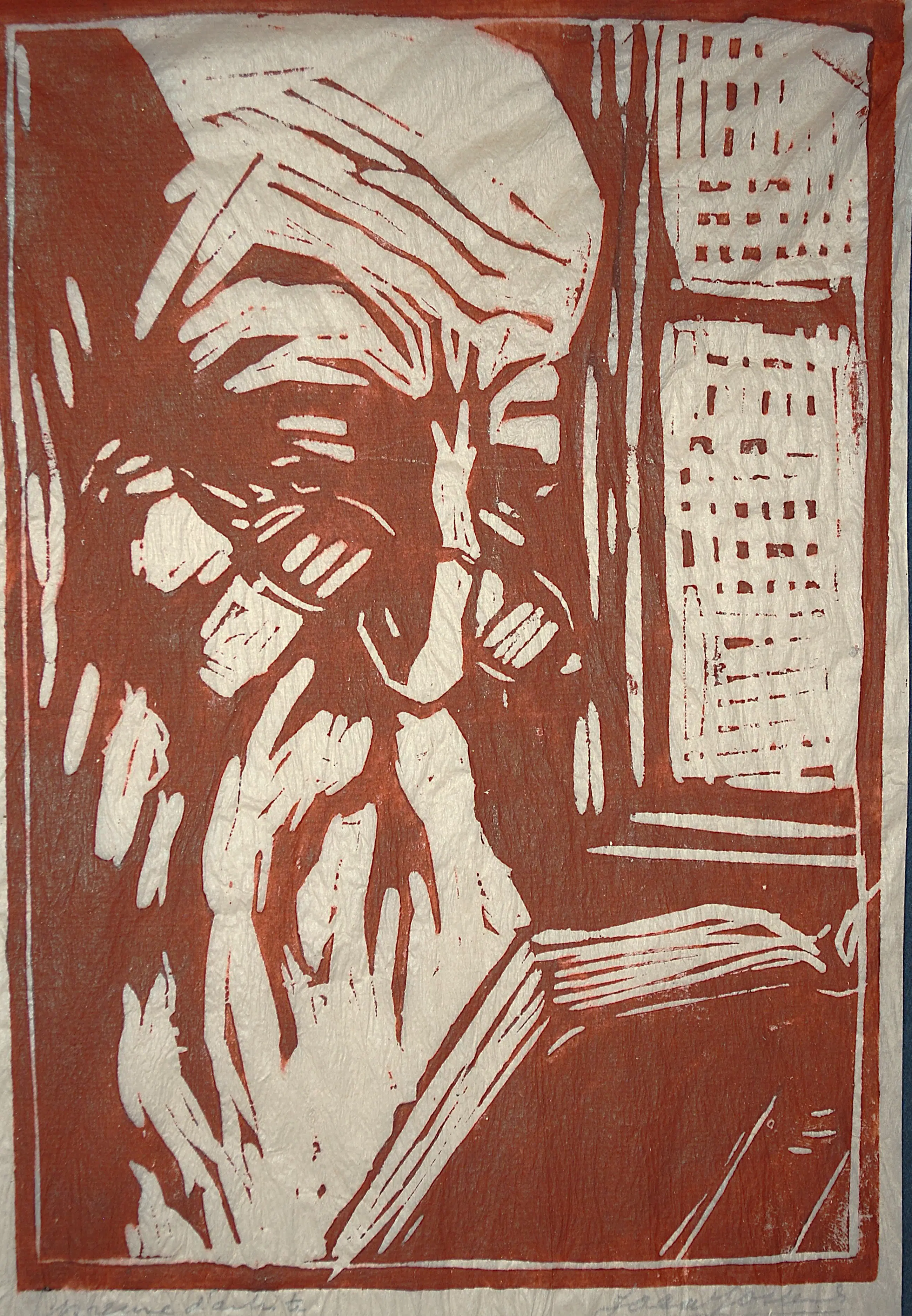 Epreuve exemplaar. Bladmaat ca 27x21 cm. Het papier is dun en rimpelt daardoor. Aan de bovenrand bevestigd op papier. Achter passepartout en glas. In een fraaie lijst van mooie kwaliteit.
