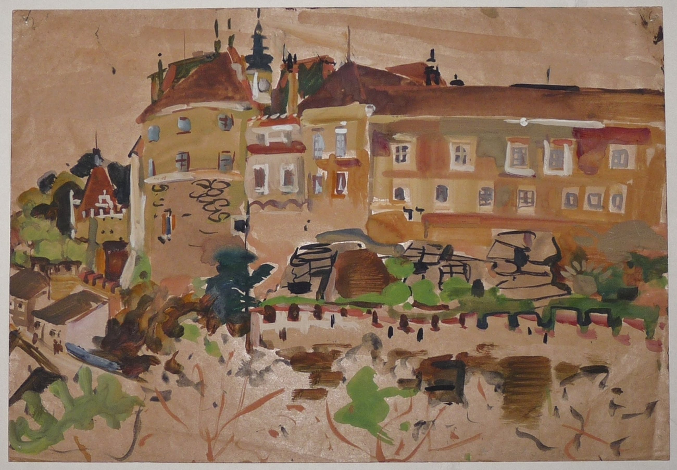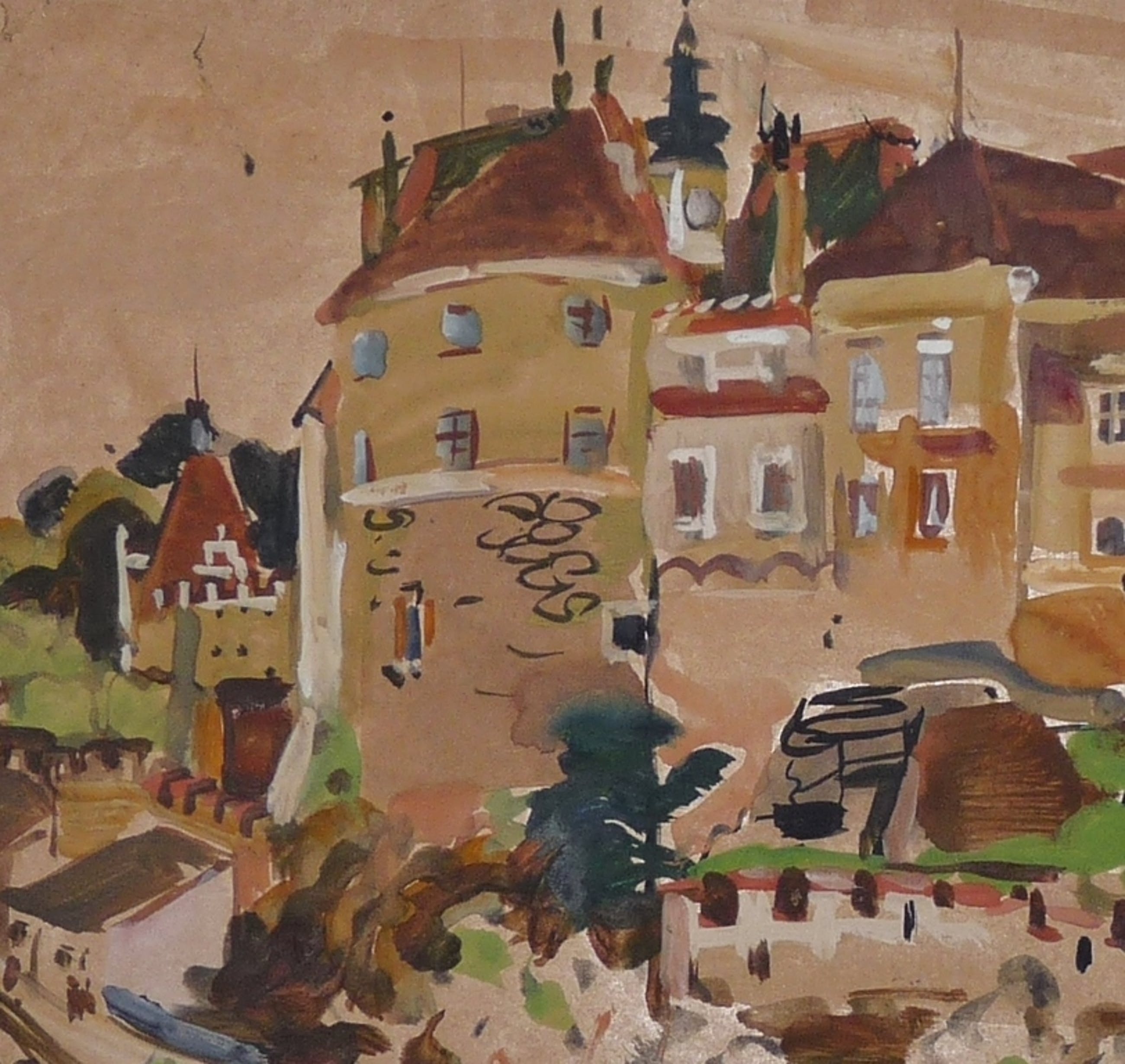 *Fraaie aquarel uit 1936 van een kasteel in Raabs (Oostenrijk), gemaakt door de kunstenaar Jan Gerrit Jordens uit de bekende Groninger kunstenaarsgroep De Ploeg. R.o. in potlood: Raabs '36 . Werk komt uit een kleine collectie met werken van zijn hand en is voor 100% gegarandeerd
