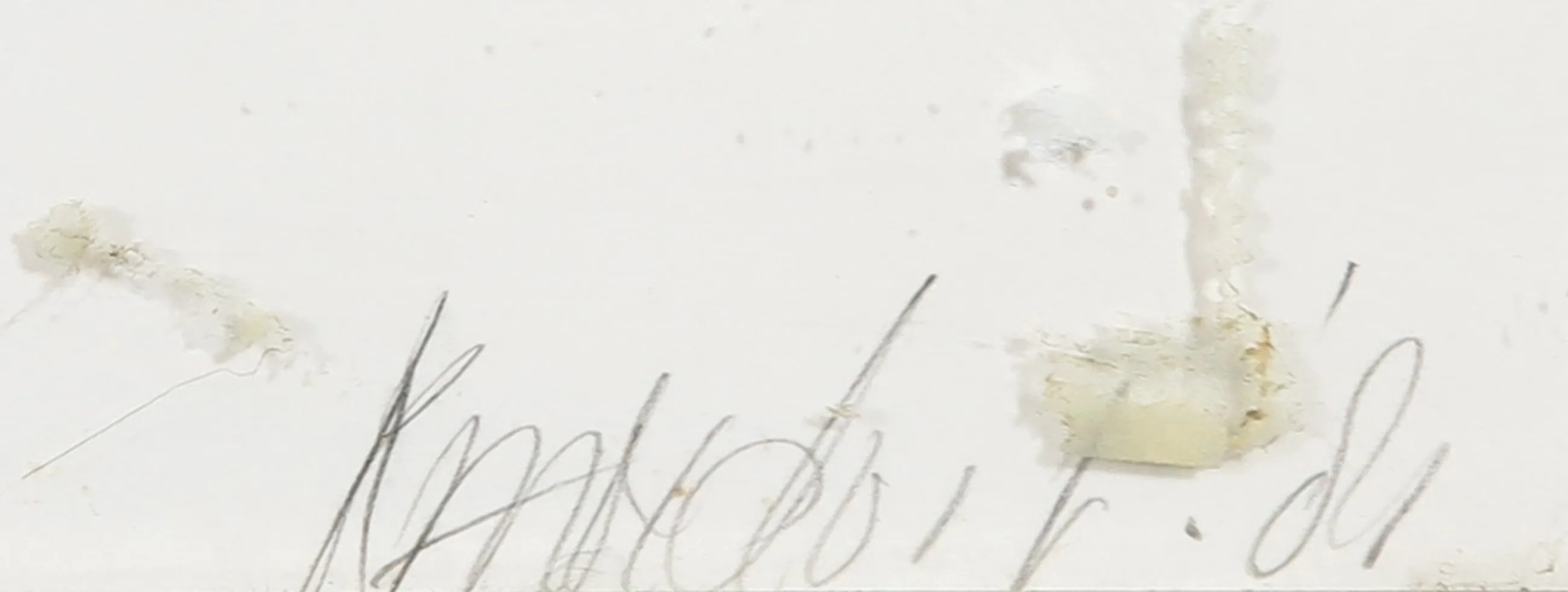Wat vegen en krassen op de compositie zichtbaar, voornamelijk de zwarte partij. Ook is er wat golving in het papier te zien. Wat stickerresten rondom de signatuur. | |
