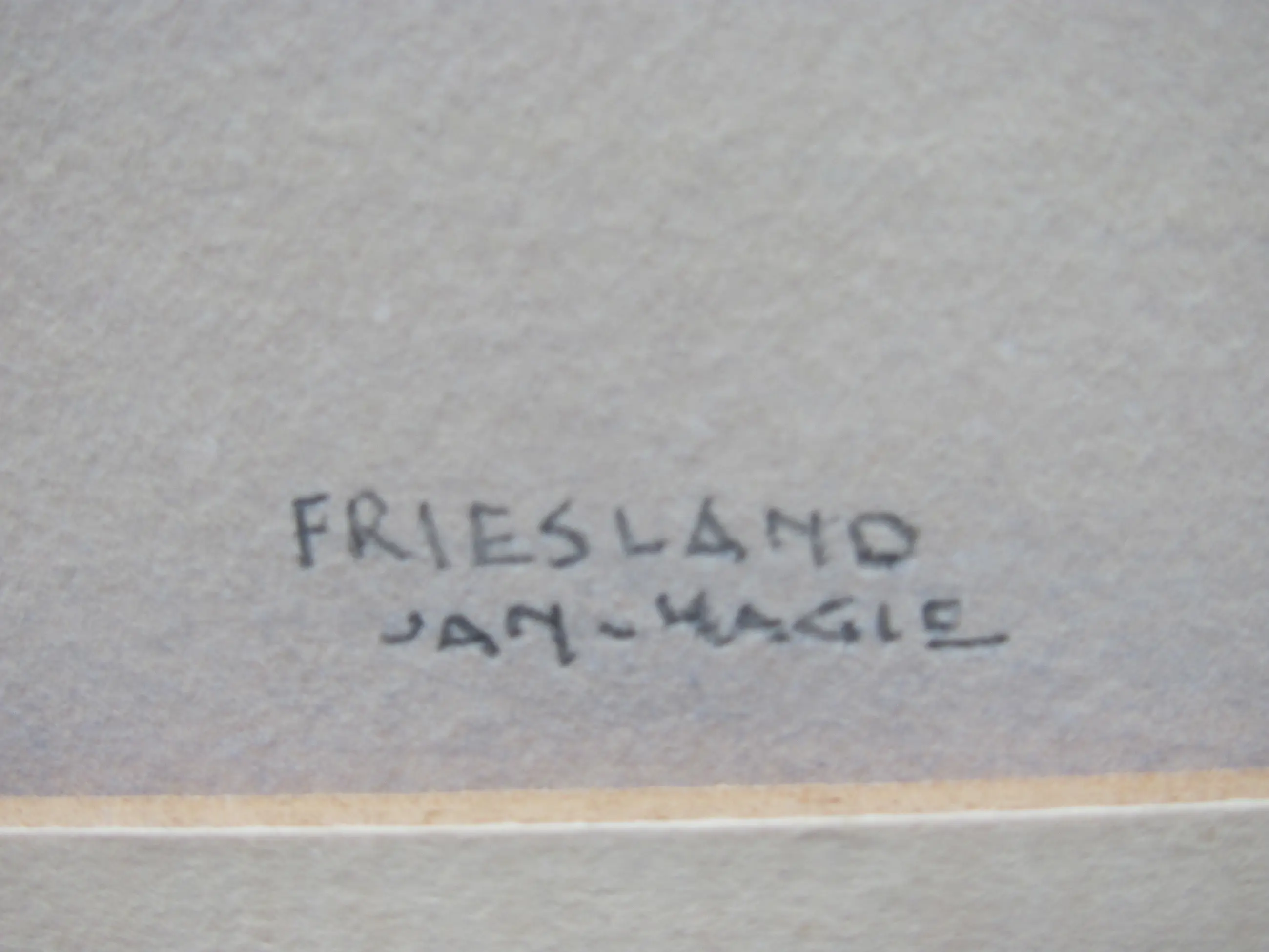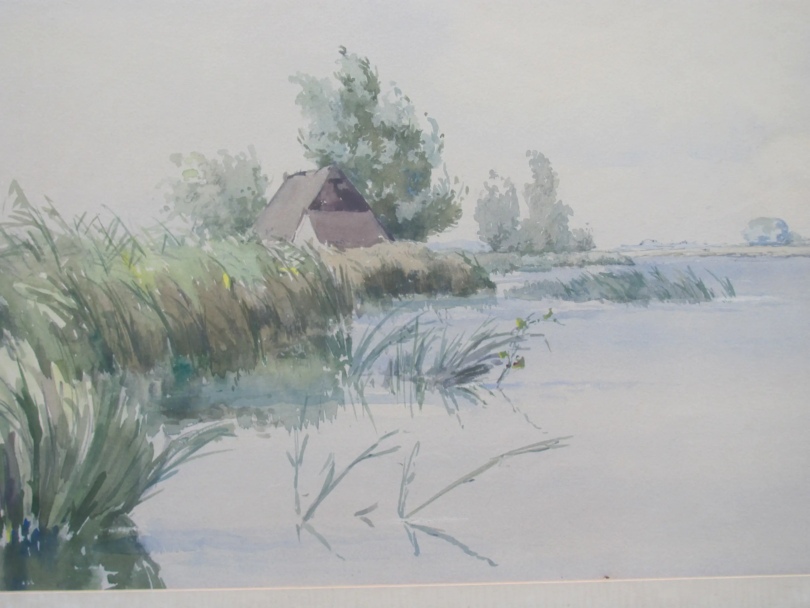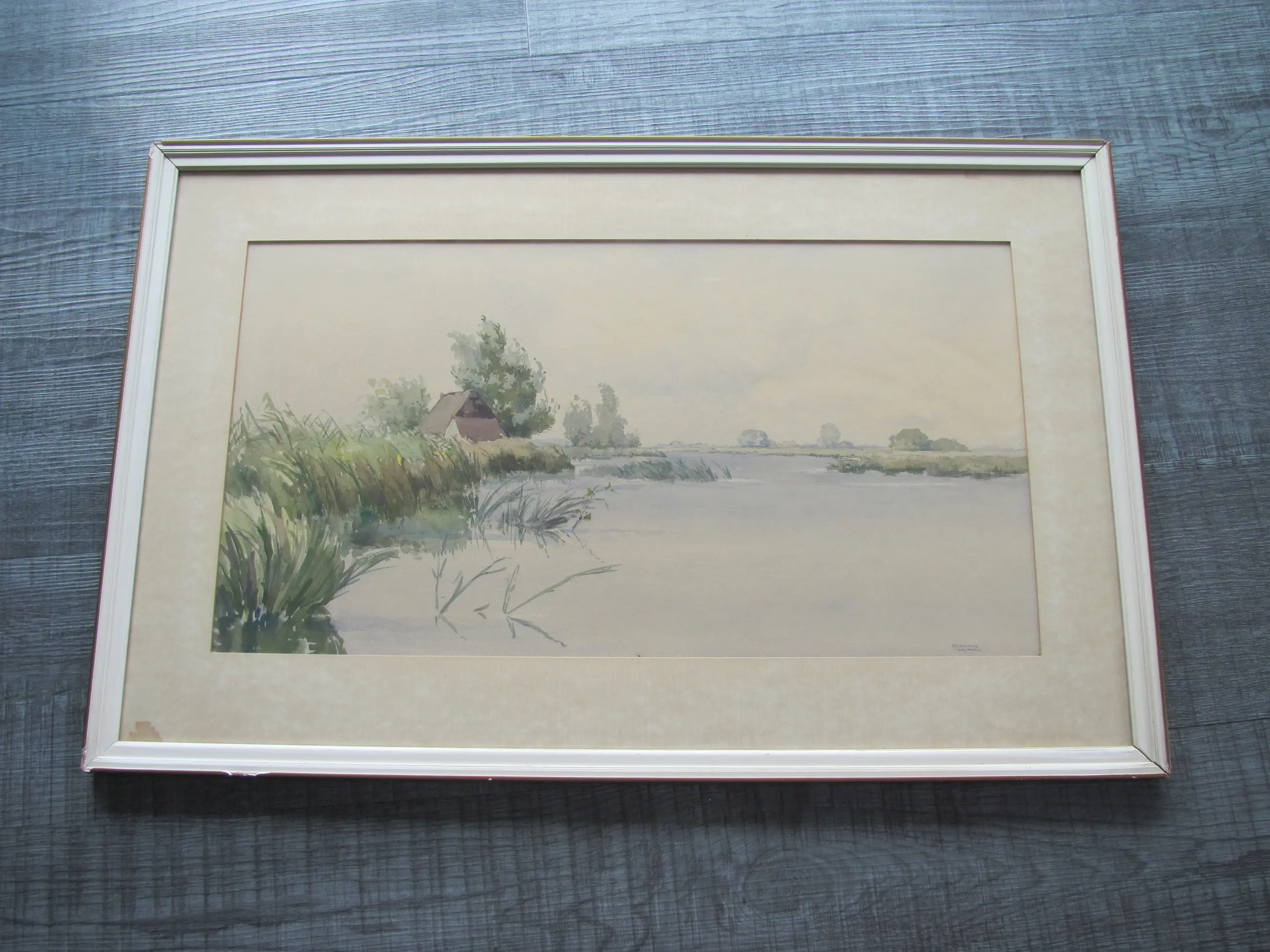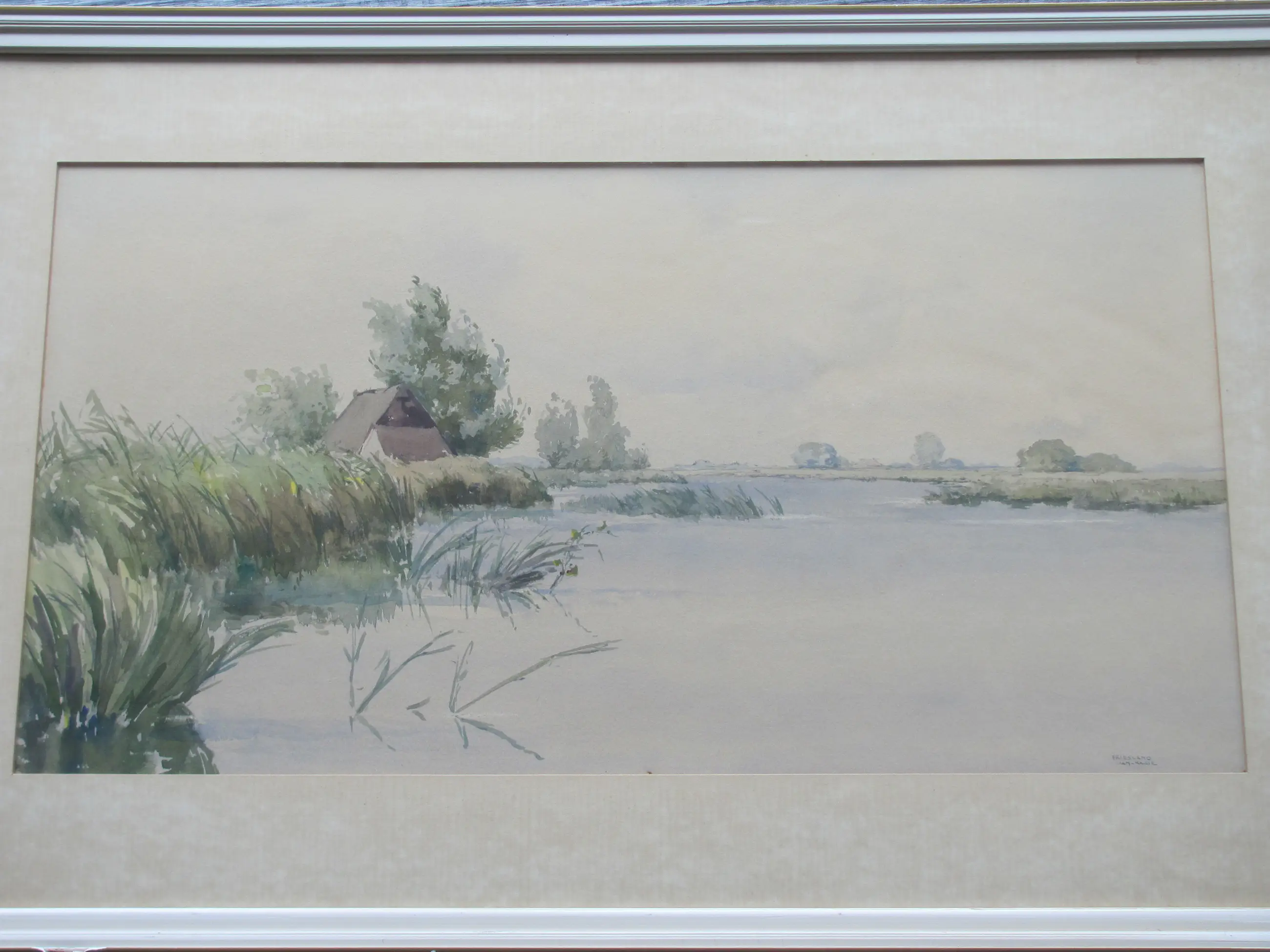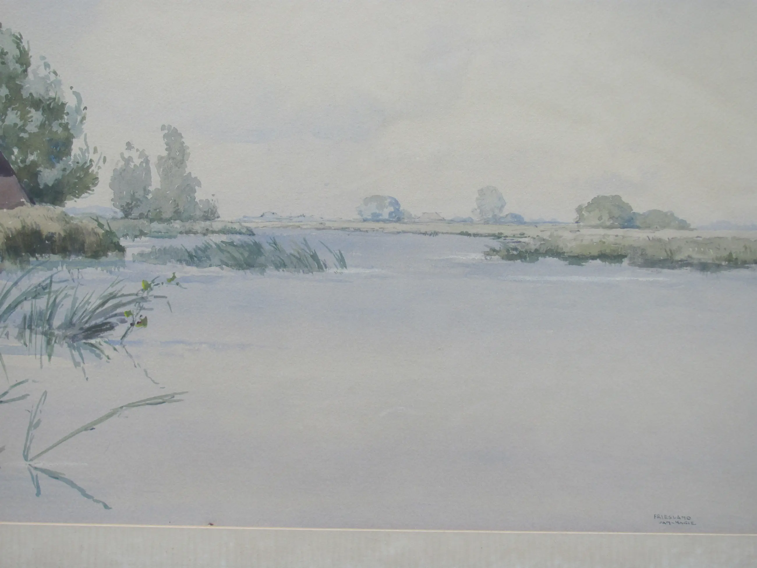 Aquarel van Jan Kagie. Rechtsonder gesigneerd en getiteld "Friesland". Ingelijst achter glas.