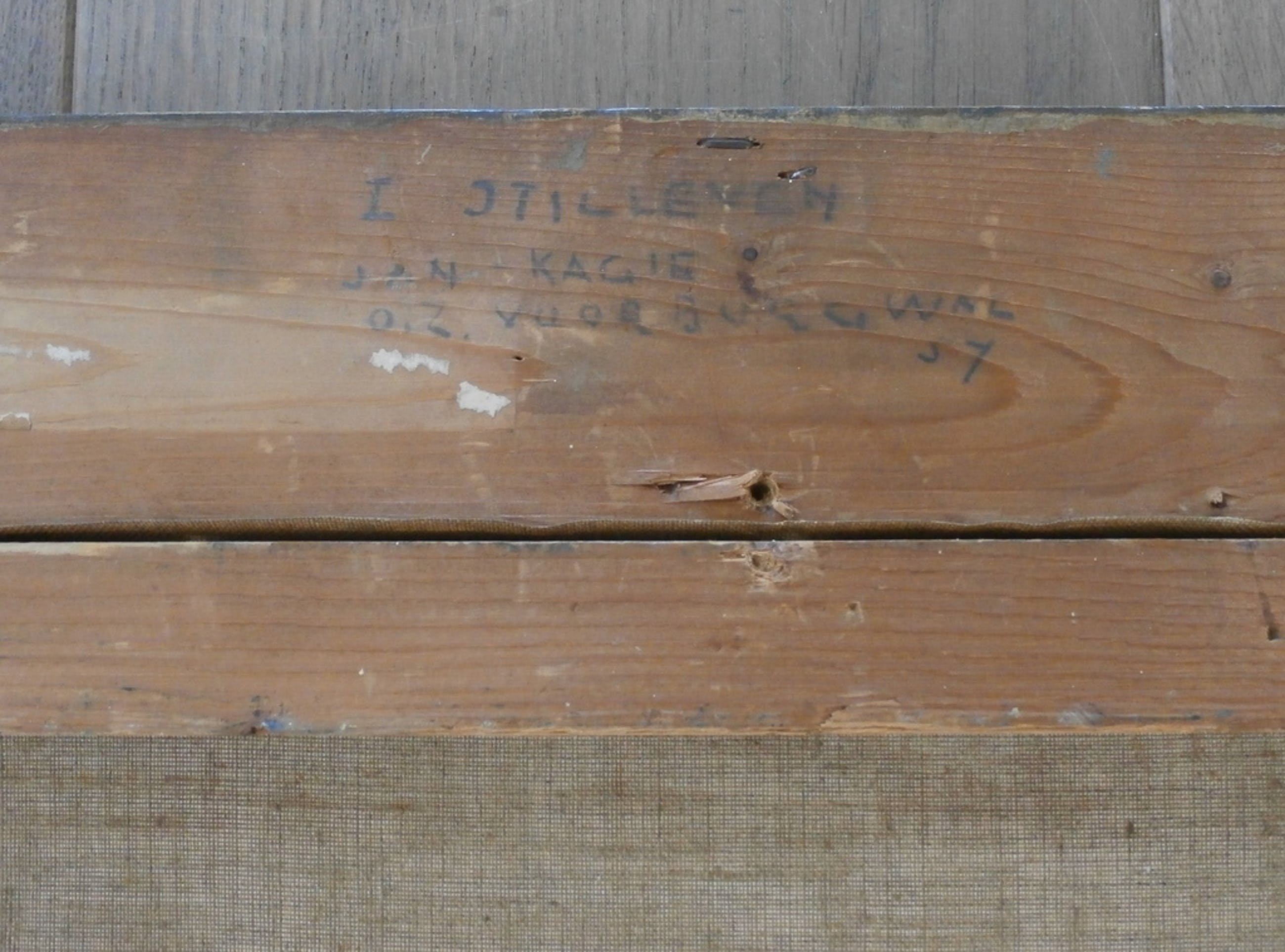 Schilderij (olieverf op doek) van Jan Kagie. Titel: stilleven. Afmetingen schilderij incl. lijst: h85 x b64,5 cm. Afmetingen werk:h 48 x b68 cm Handgesigneerd rechts onder. Op de achterzijde staat ook het adres van de schilder vermeld.