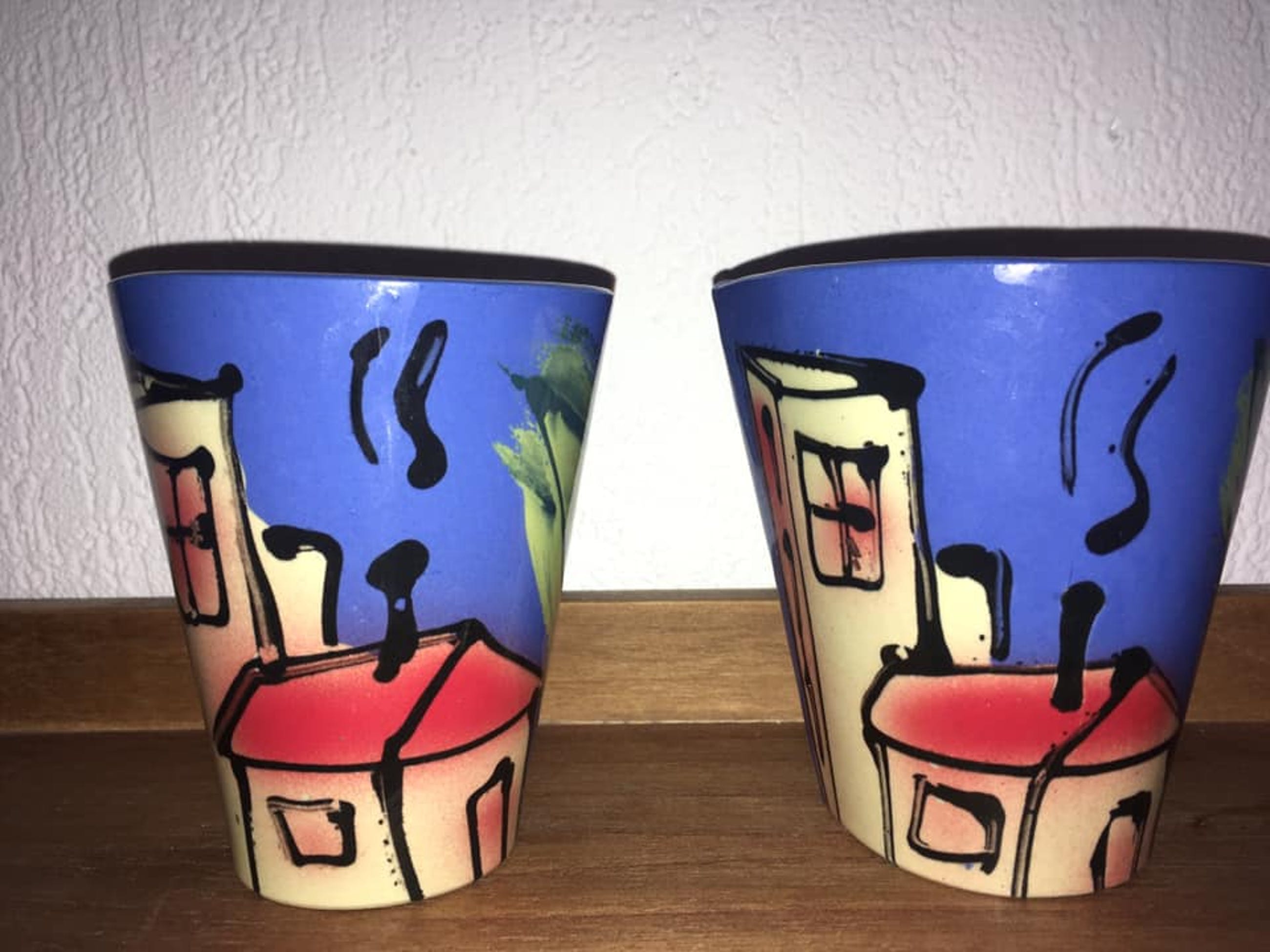 Twee mooie indentieke items van keramist Jan Kamphuis Mooie heldere kleuren met als hoofdkeur blauw Aan de onderkant gesigneerd Apart vorm