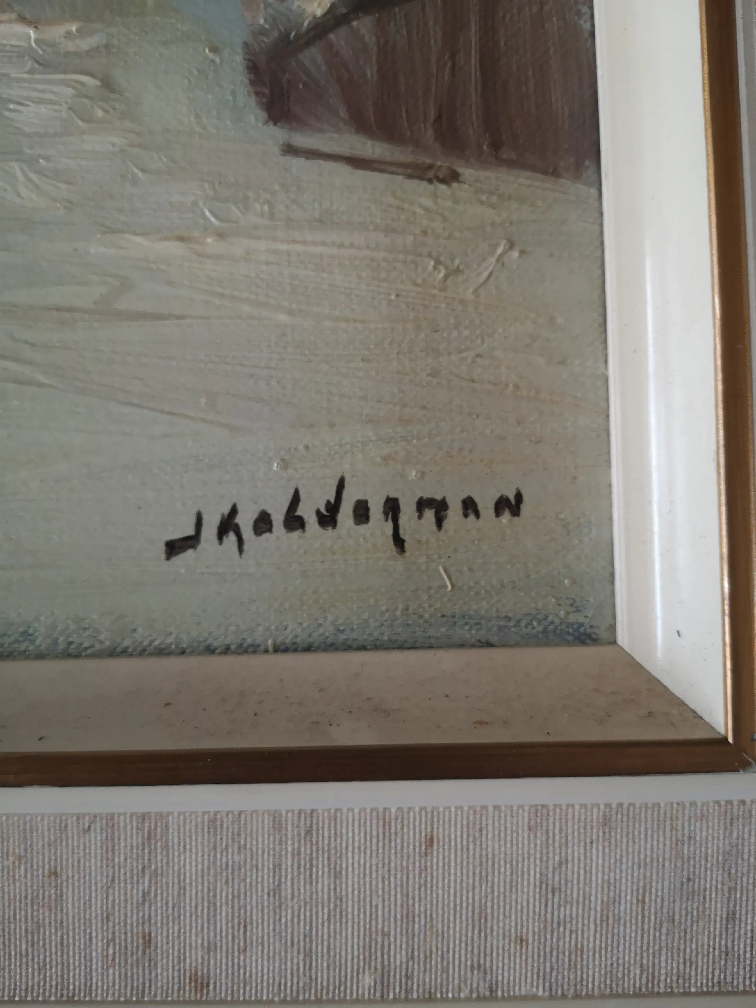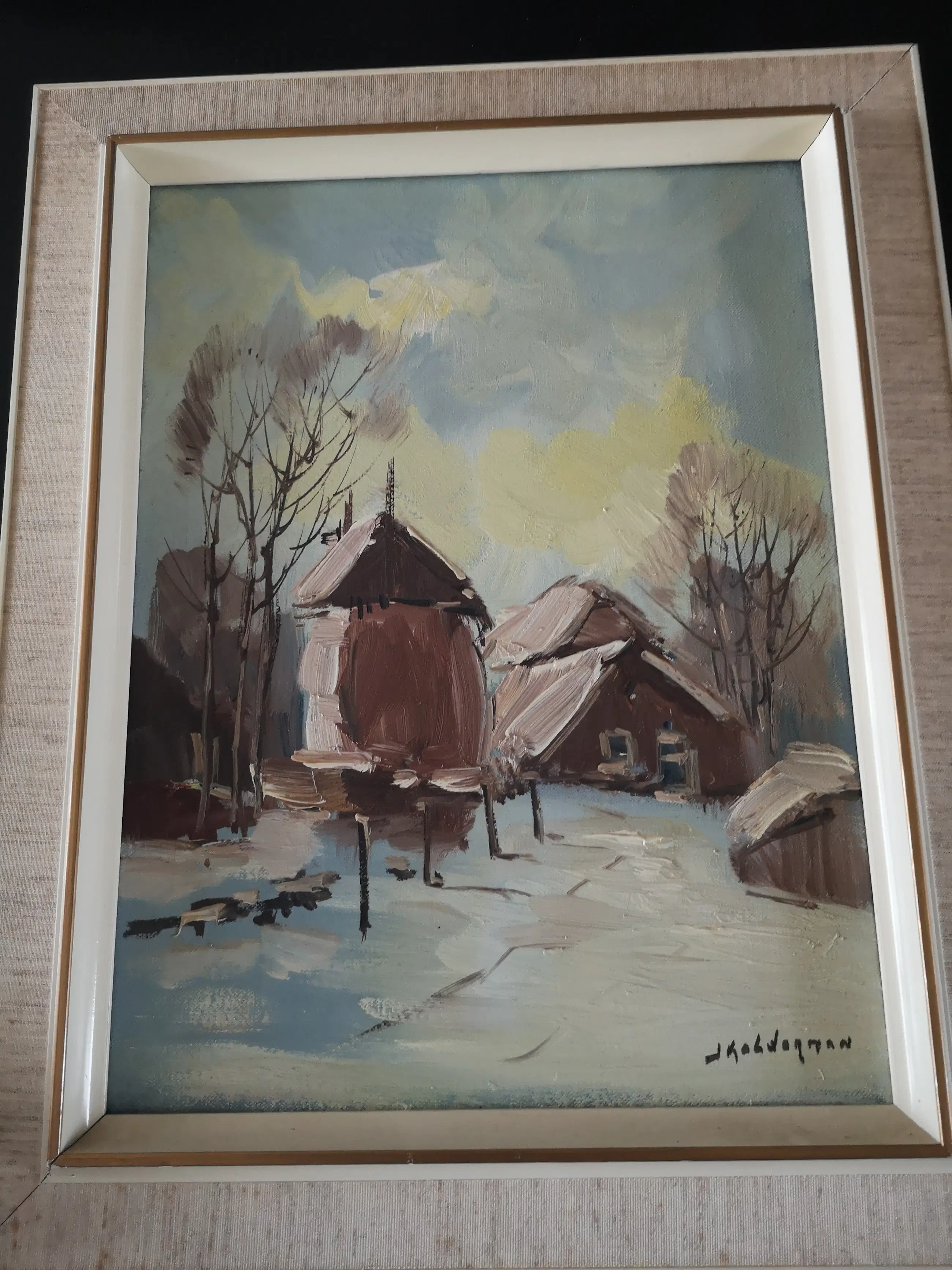Jan kelder, geboren in 1914 en overleden in 1990.Dit betreft een afbeelding van een laarense boerderij in de winter