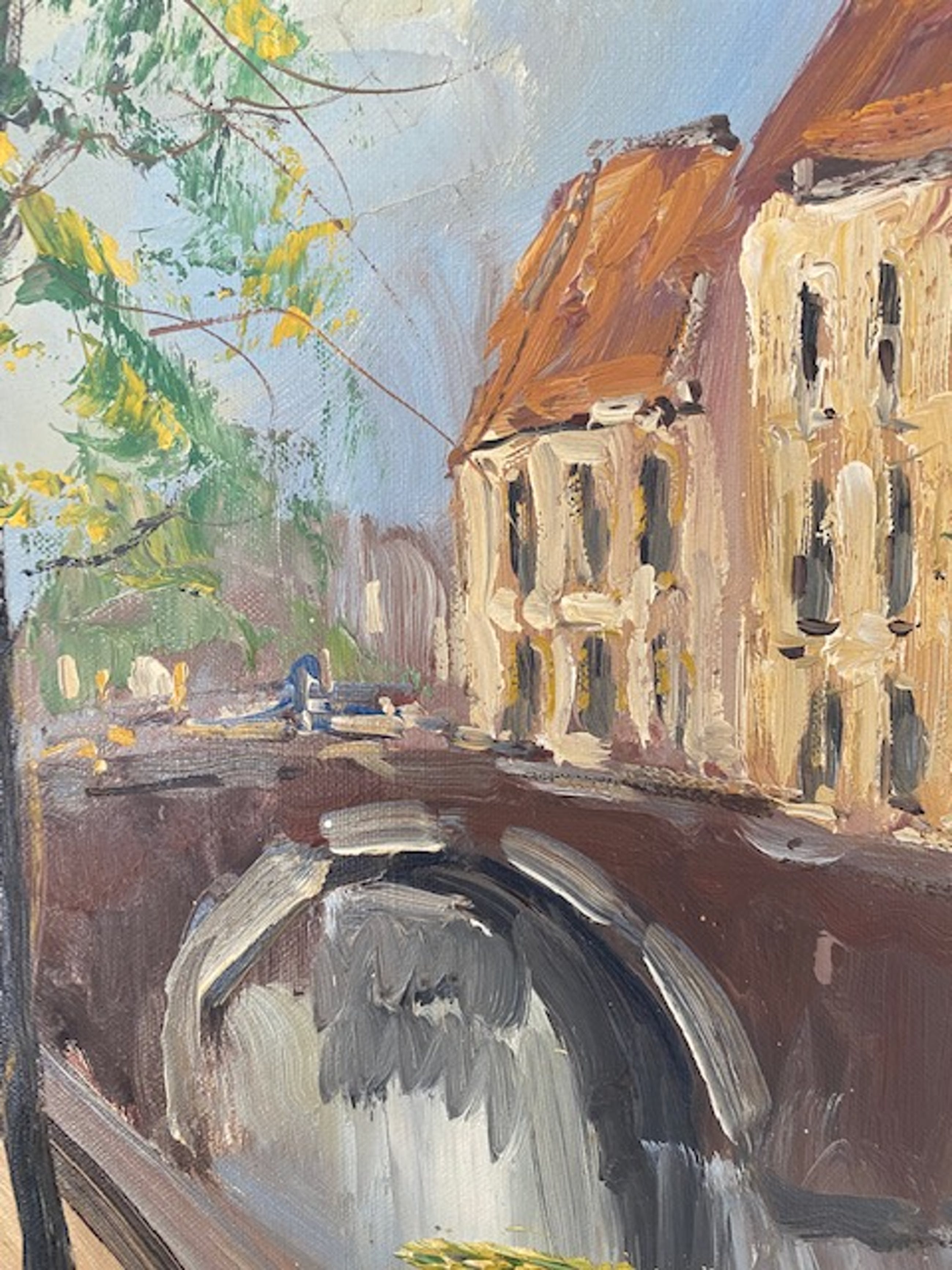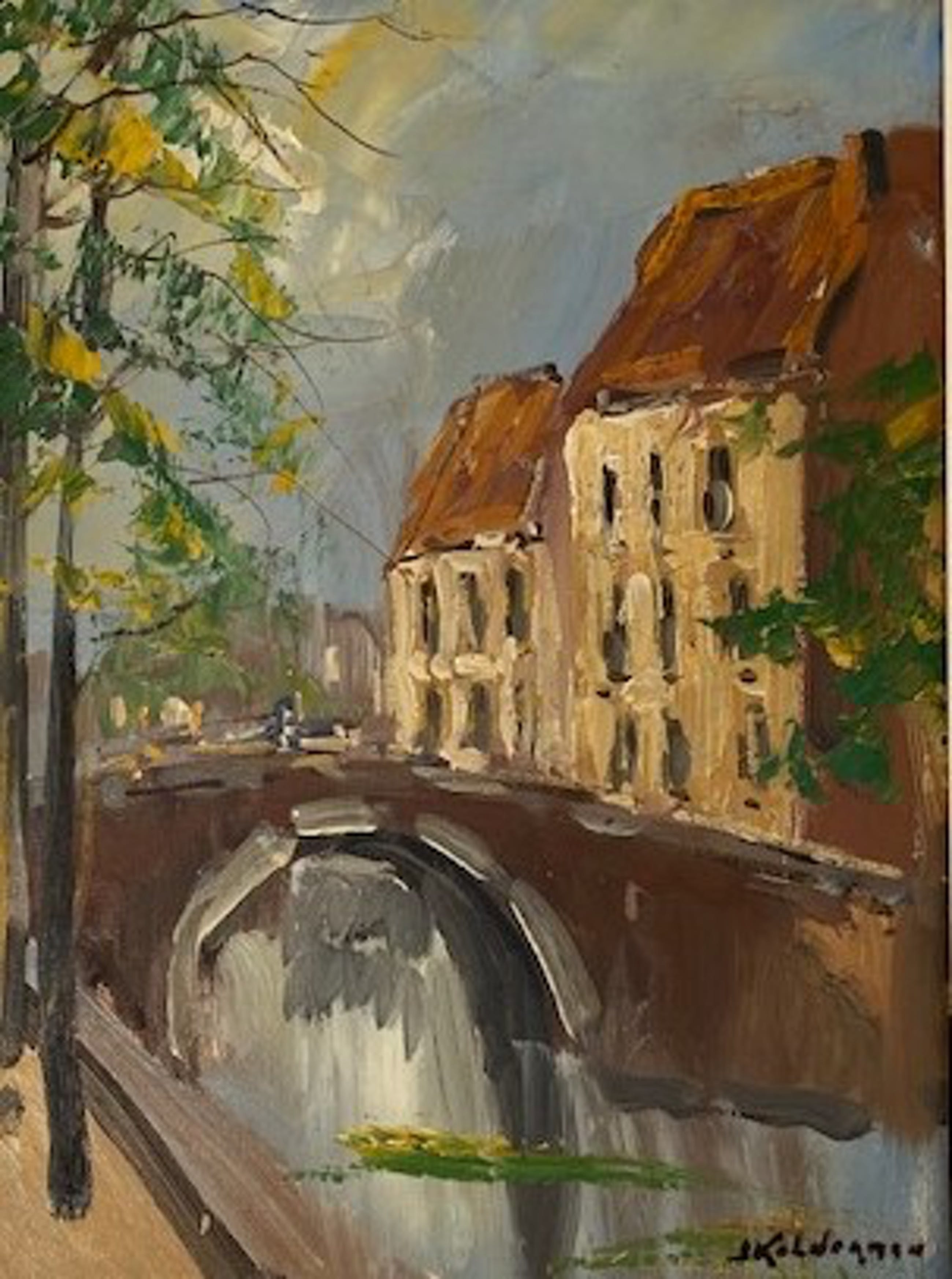 Een impressie van één van de vele gemetselde bruggen binnen de historische binnenstad van het Belgische Brugge. Jan Kelderman was een aimabele Nederlandse schilder en handelaar welke bekend staat om zijn typisch Nederlandse en Franse landschappen, zee- en stadsgezichten. Hij was een autodidact welke op latere leeftijd nog een opleiding genoot. Hij verkocht zijn schilderijen aan bedrijven, op tentoonstellingen en markten, in hotels en in zijn stamcafé.