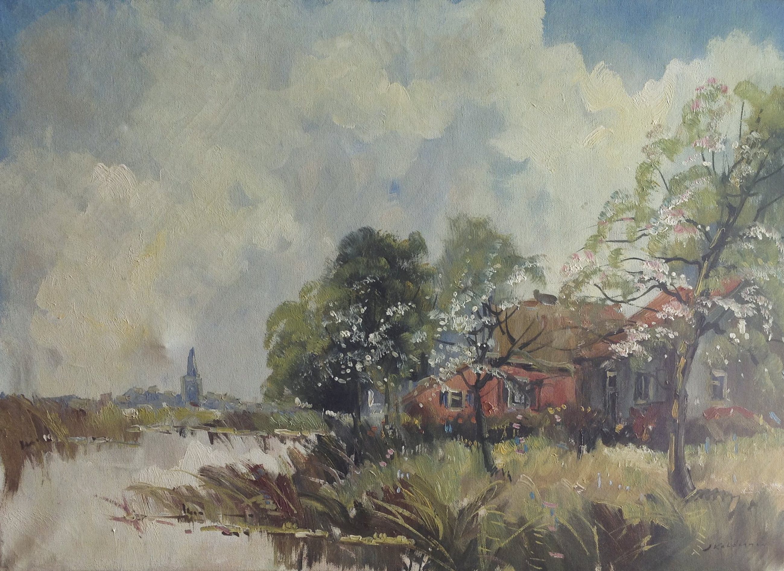 Doek bevat oppervlaktevuil en verkleurde vernis door de tijd, craquelures en deukje t.h.v. kerktoren. Lijst bevat oppervlaktevuil en slijtschade door de tijd | |