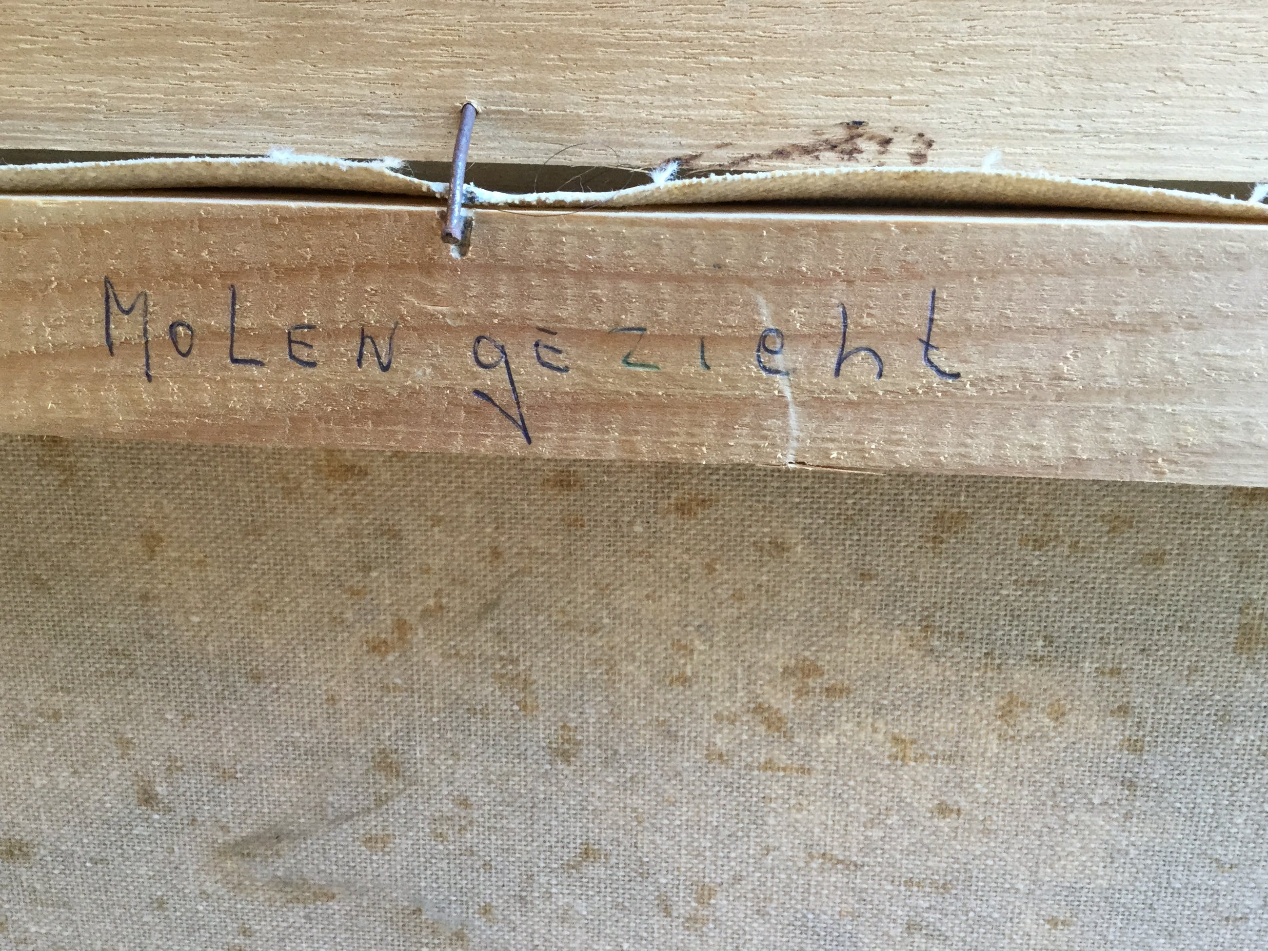 | Doek bevat oppervlaktevuil en verkleurde vernis door de tijd, craquelures onderzijde, lijst bevat oppervlaktevuil en slijtschade door de tijd | |