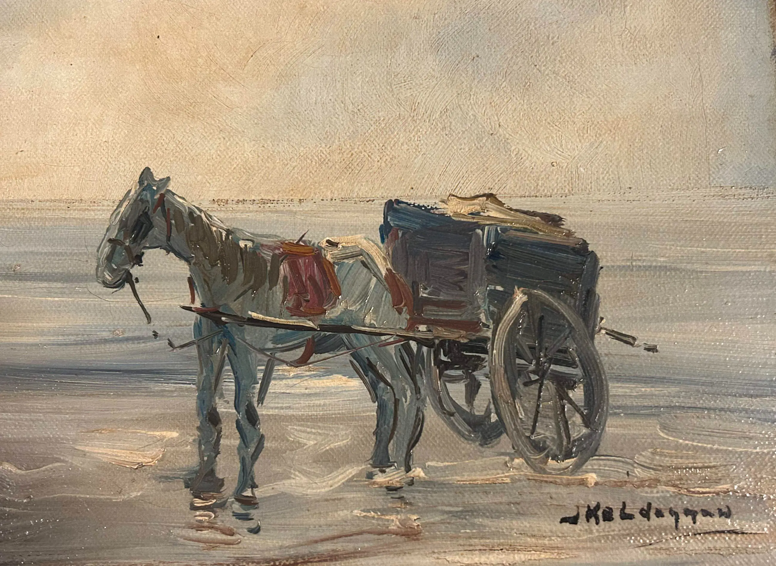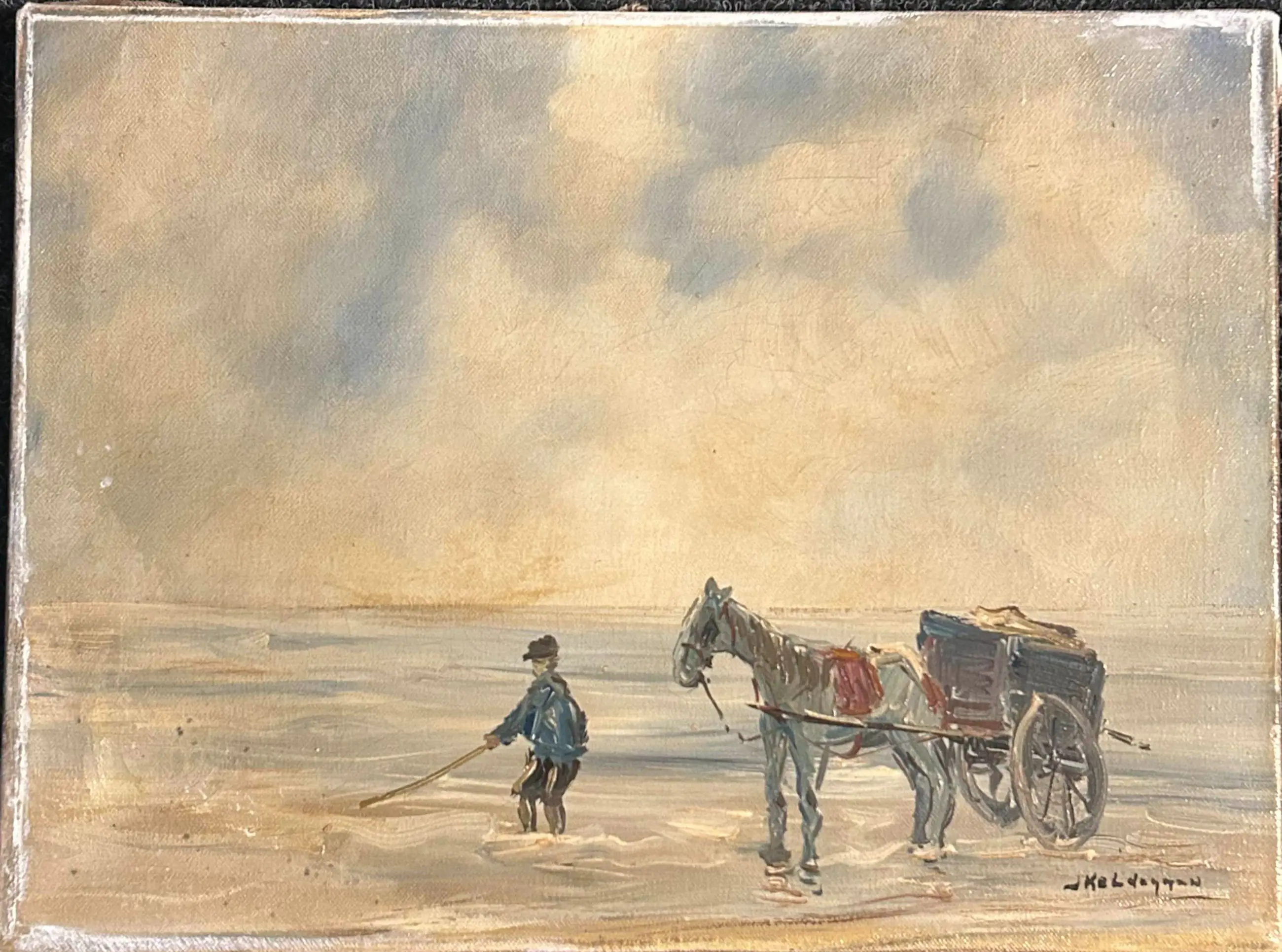 Schilderij van Jan Kelderman – De schelpenvisser Mooi werk van Jan Kelderman met de titel De schelpenvisser. Het werk verkeert over het algemeen in goede staat. Aan de buitenrand is een lichte aanwezigheid van witte verf zichtbaar, vermoedelijk ontstaan doordat het werk eerder ingelijst is geweest. Zie foto’s voor een verdere indruk van het geheel en de staat van het werk.