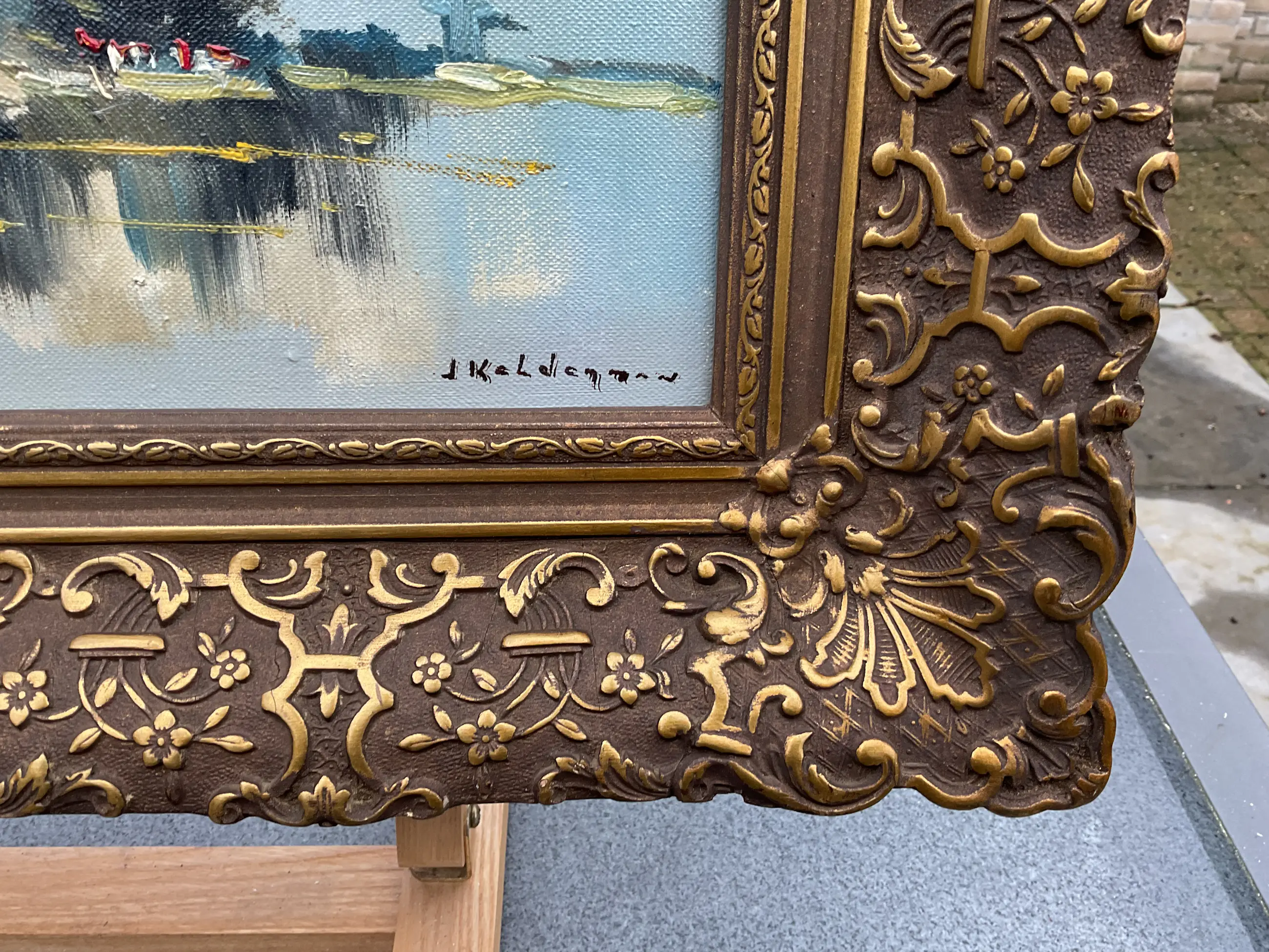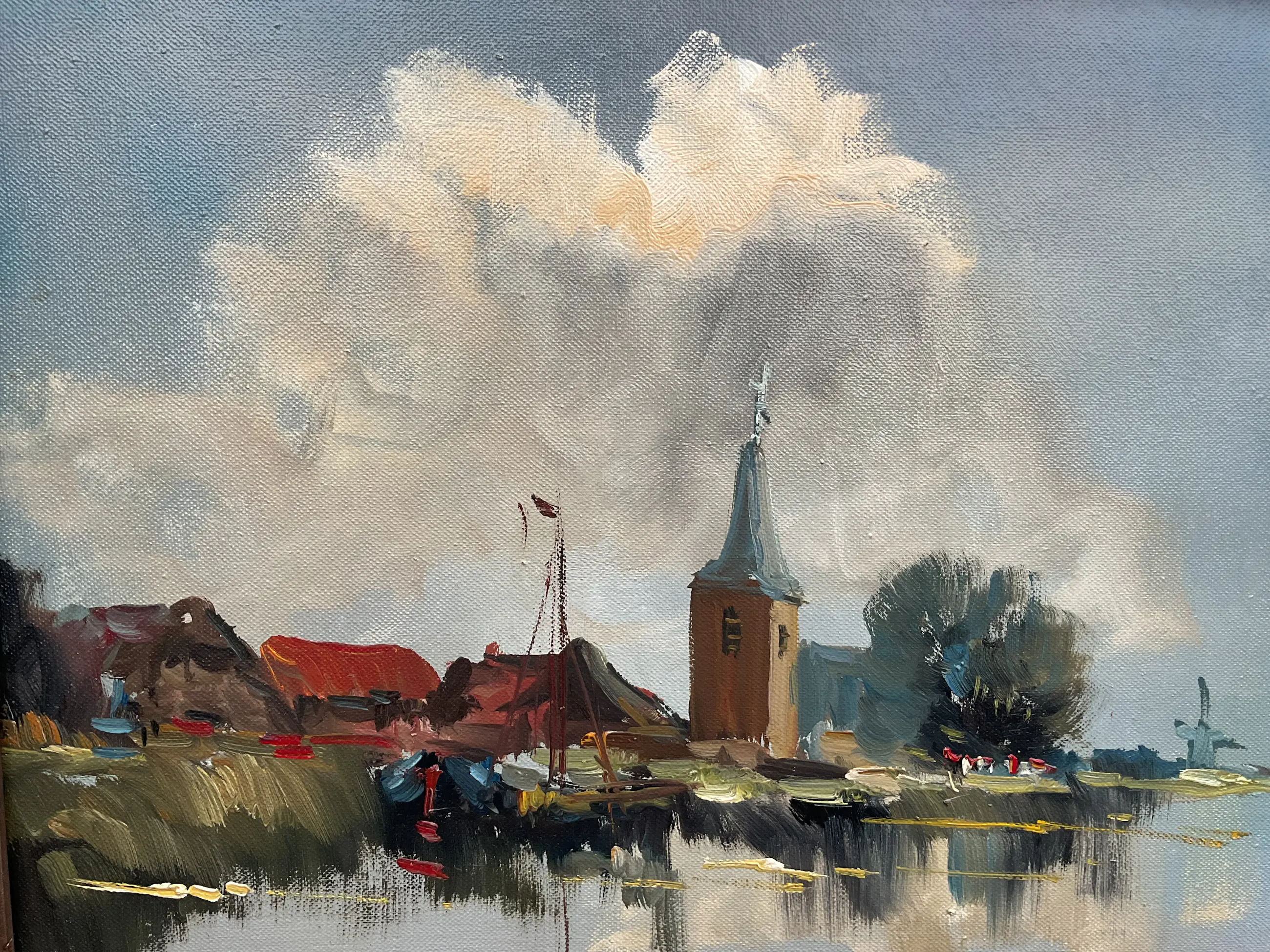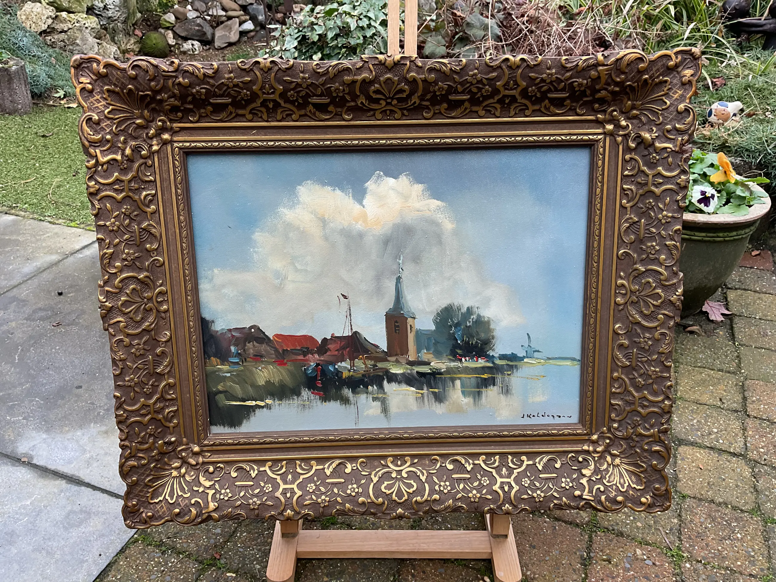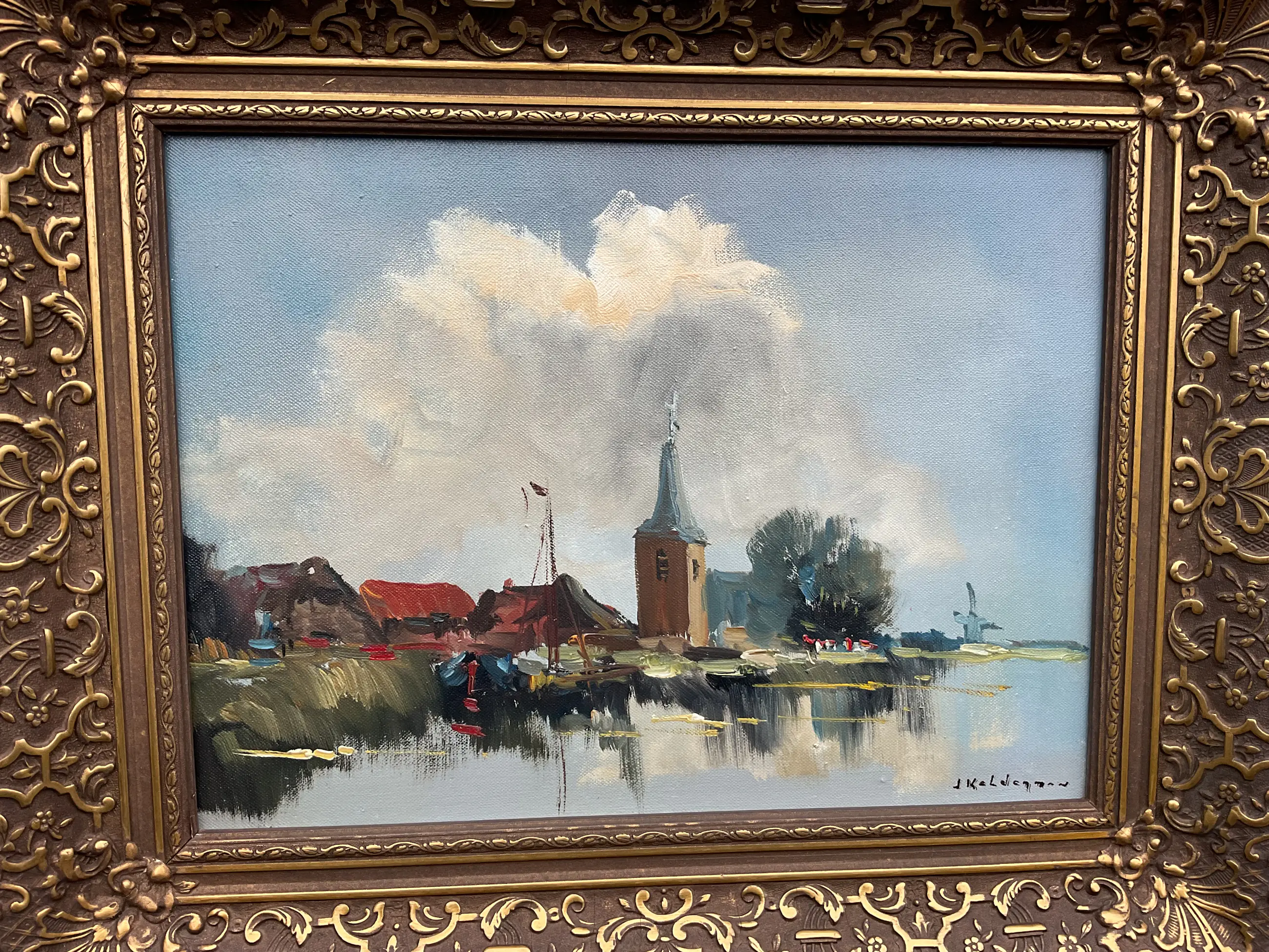 Jan Kelderman maakte veel werk. Vak stadsgezichten en dorpsaanzichten zoals dit. Vlot geschilderd, geen grote kunst maar wel zo gewild dat hij er goed van kon leven. Vaak heeft zijn werk veel craquelé, dit helemaal geen. Er zit een prachtige nagenoeg perfecte klassieke lijst omheen.
