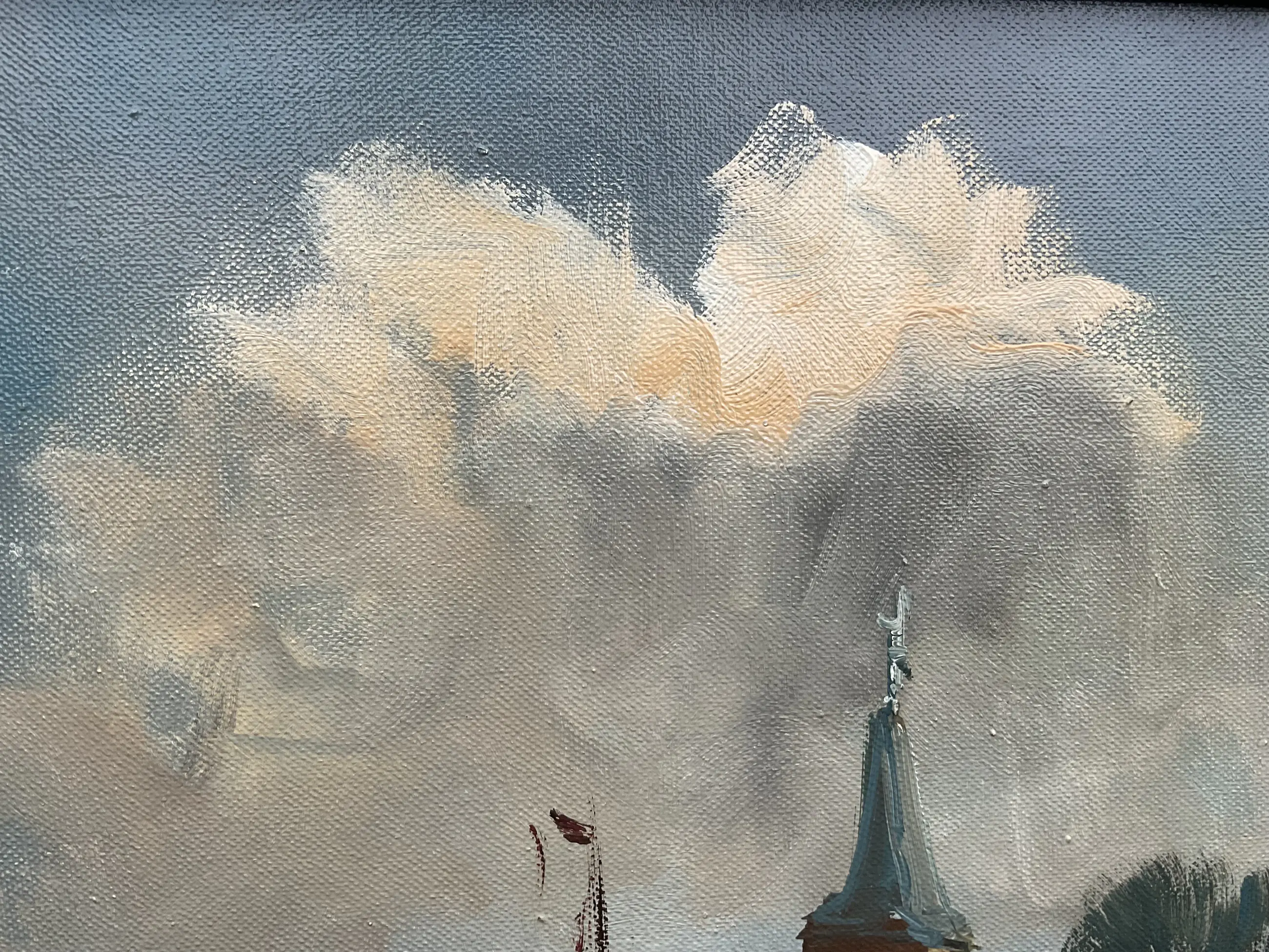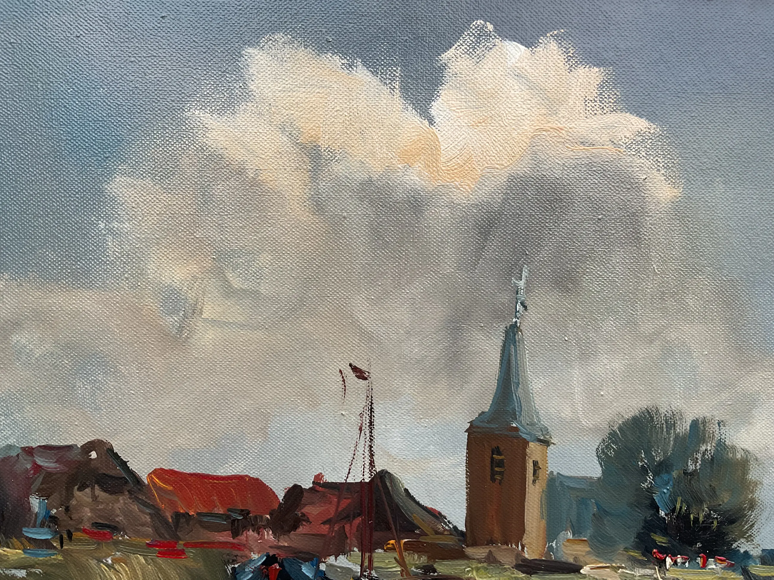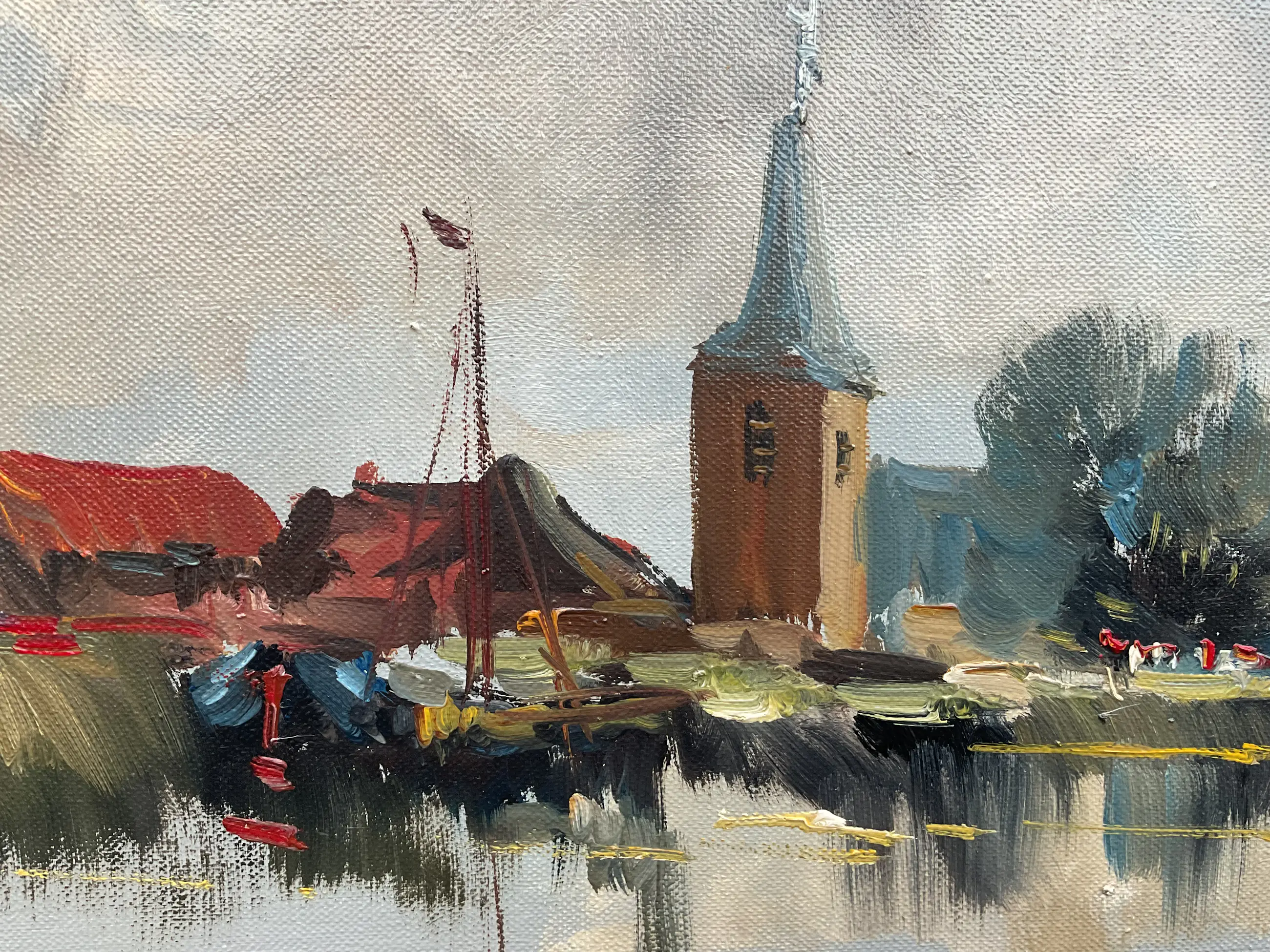 Jan Kelderman maakte veel werk. Vak stadsgezichten en dorpsaanzichten zoals dit. Vlot geschilderd, geen grote kunst maar wel zo gewild dat hij er goed van kon leven. Vaak heeft zijn werk veel craquelé, dit helemaal geen. Er zit een prachtige nagenoeg perfecte klassieke lijst omheen.