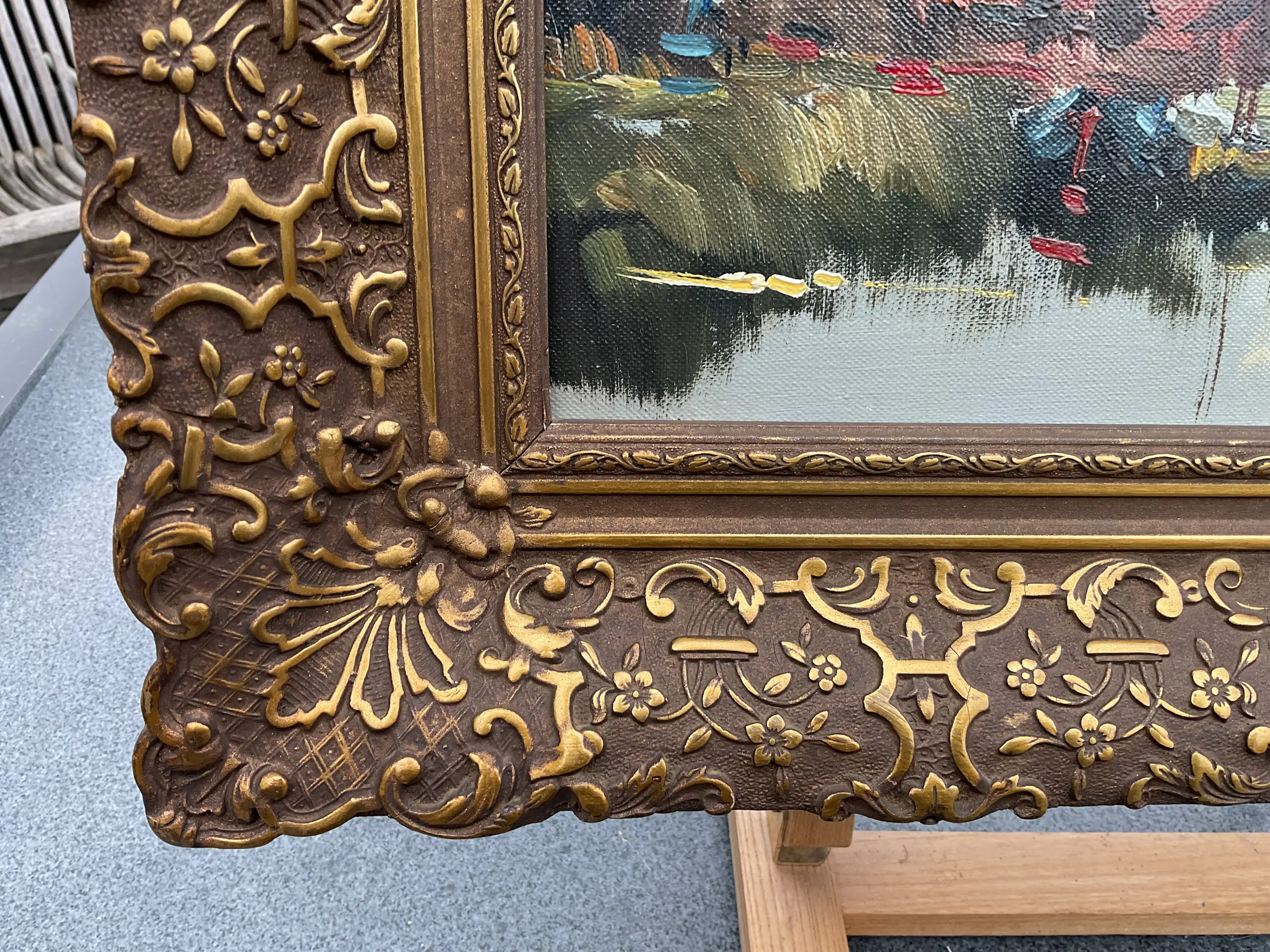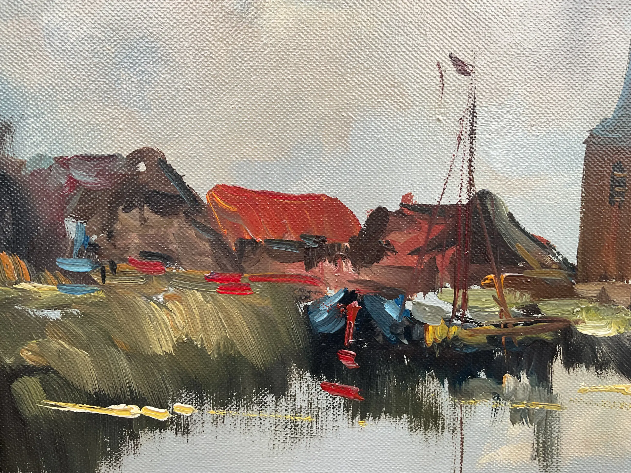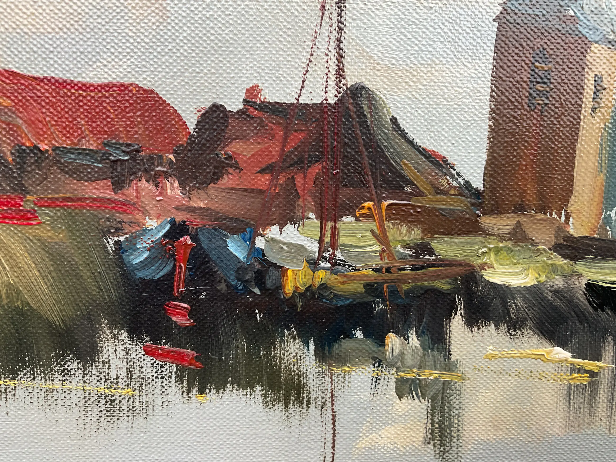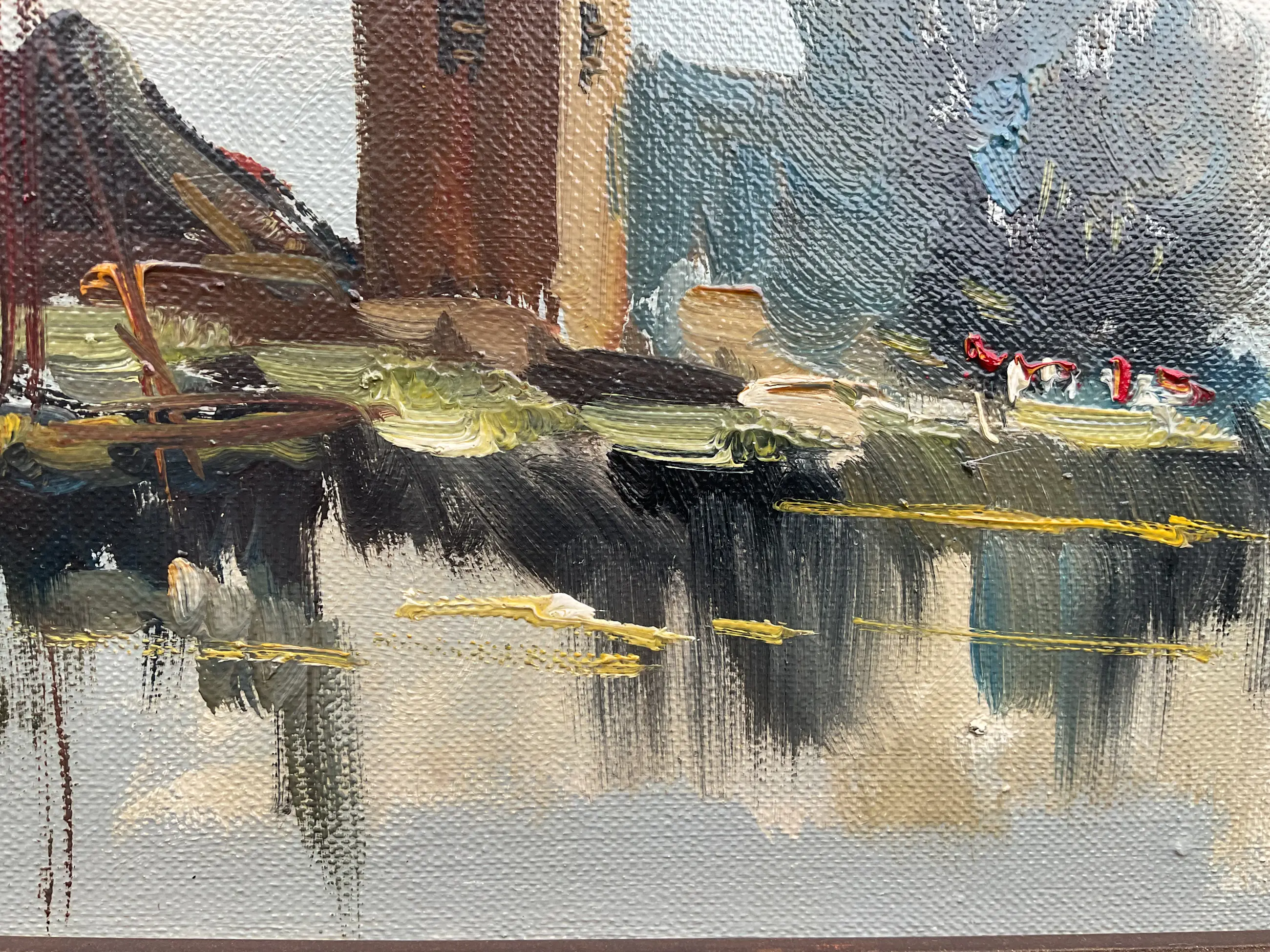 Jan Kelderman maakte veel werk. Vak stadsgezichten en dorpsaanzichten zoals dit. Vlot geschilderd, geen grote kunst maar wel zo gewild dat hij er goed van kon leven. Vaak heeft zijn werk veel craquelé, dit helemaal geen. Er zit een prachtige nagenoeg perfecte klassieke lijst omheen.