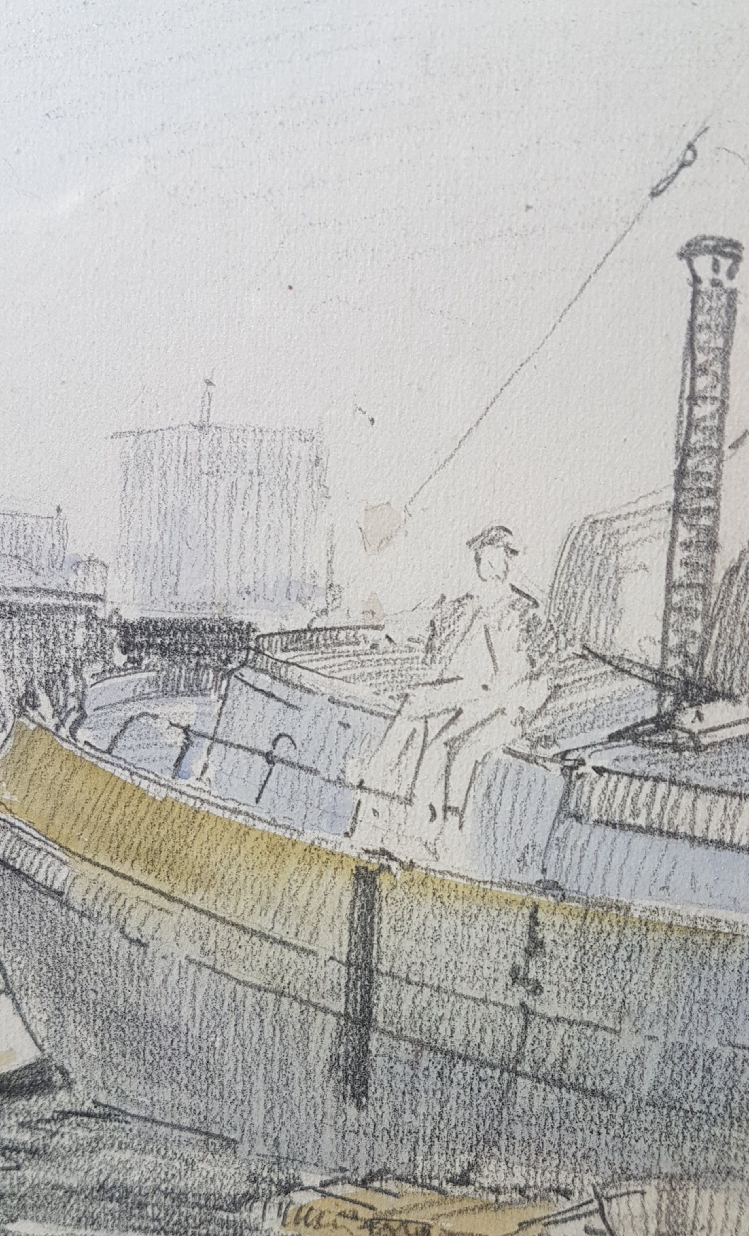Te zien is de bedrijvigheid in de haven aan de 'de Ruijterkade' te Amsterdam.