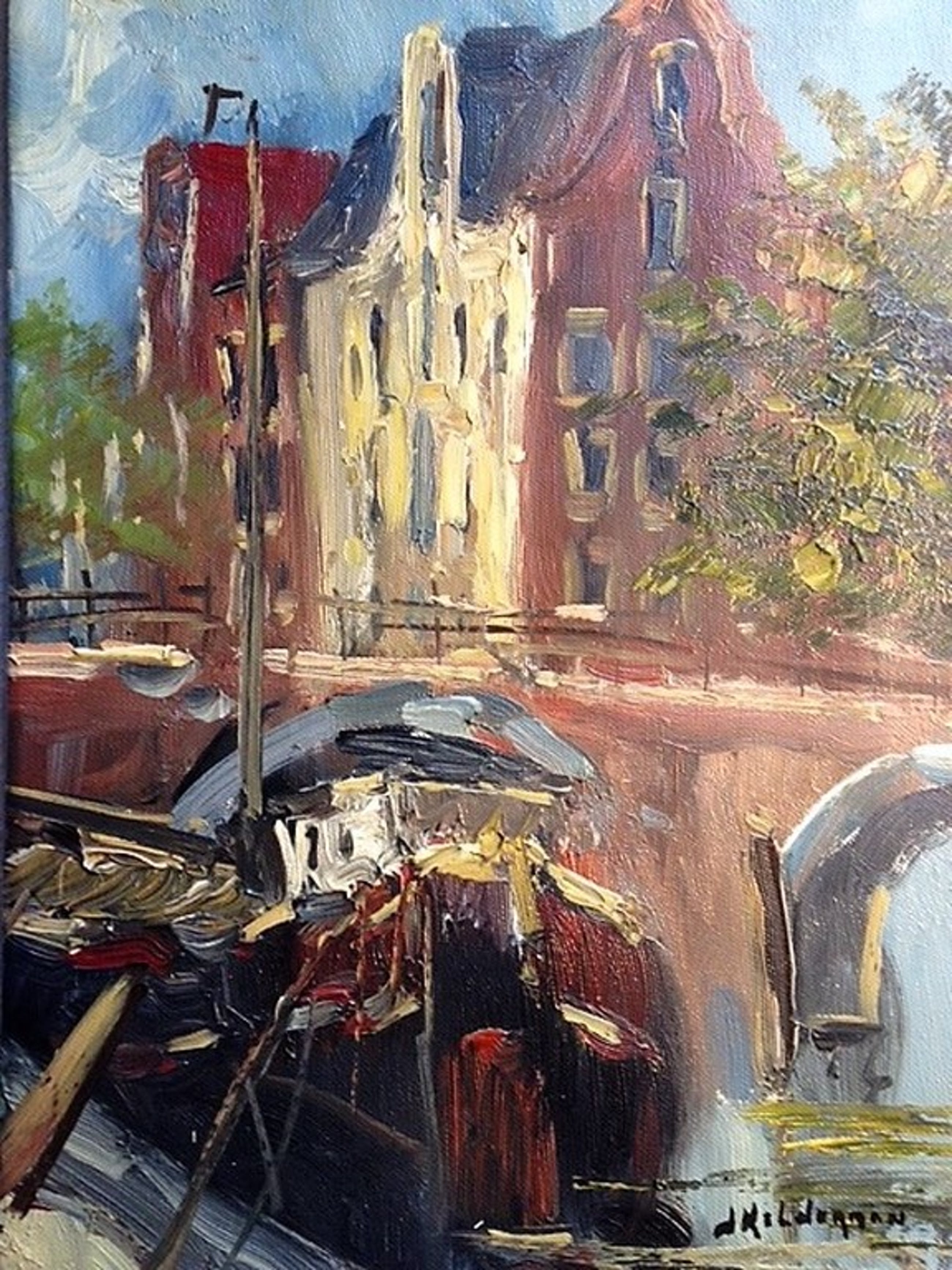 Brouwersgracht, Amsterdam. Geschilderd door Jan Kelderman (1914-1990). Techniek: olieverf op doek. gesigneerd aan de rechter onderzijde. De afmetingen van het doek zijn: 26,5 cm x 40 cm. Zonder lijst. Doek verkeert in goede staat.