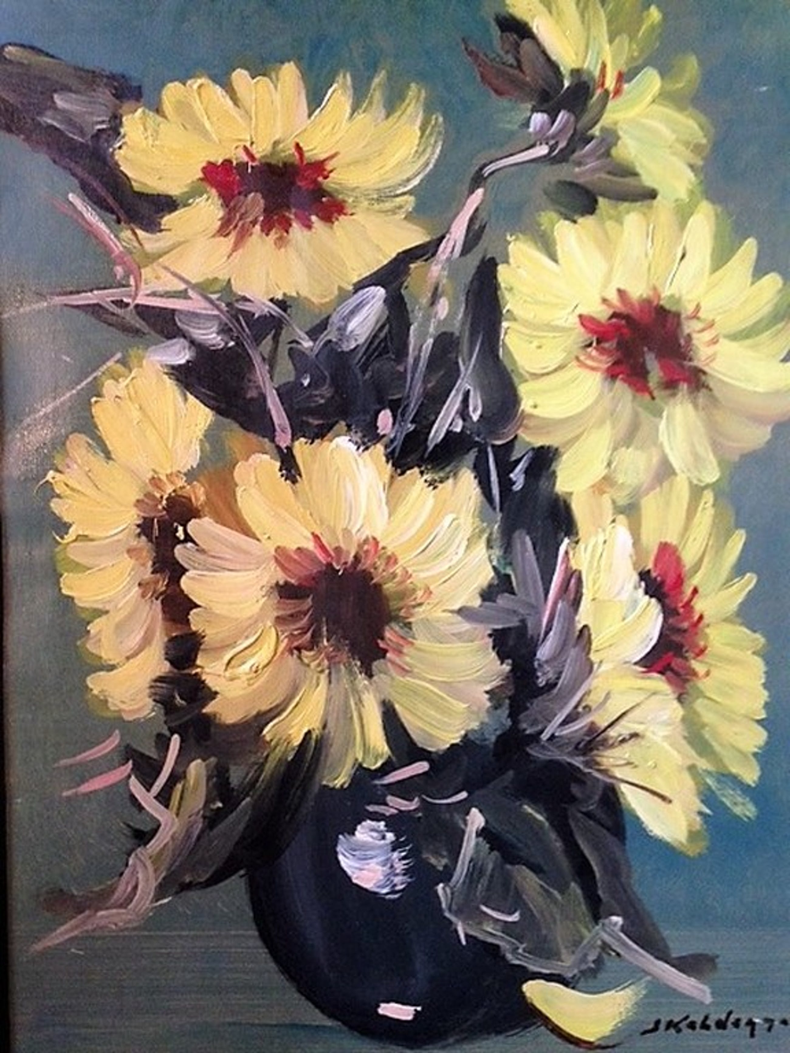 Zonnebloemen op een vaas. Geschilderd door Jan Kelderman (1914-1990). Techniek: olieverf op doek. Gesigneerd aan de rechter onderzijde. De afmetingen van het doek zijn: 30,5 cm x 40,5 cm. Inclusief de houten lijst zijn de afmetingen: 40 cm x 50 cm.