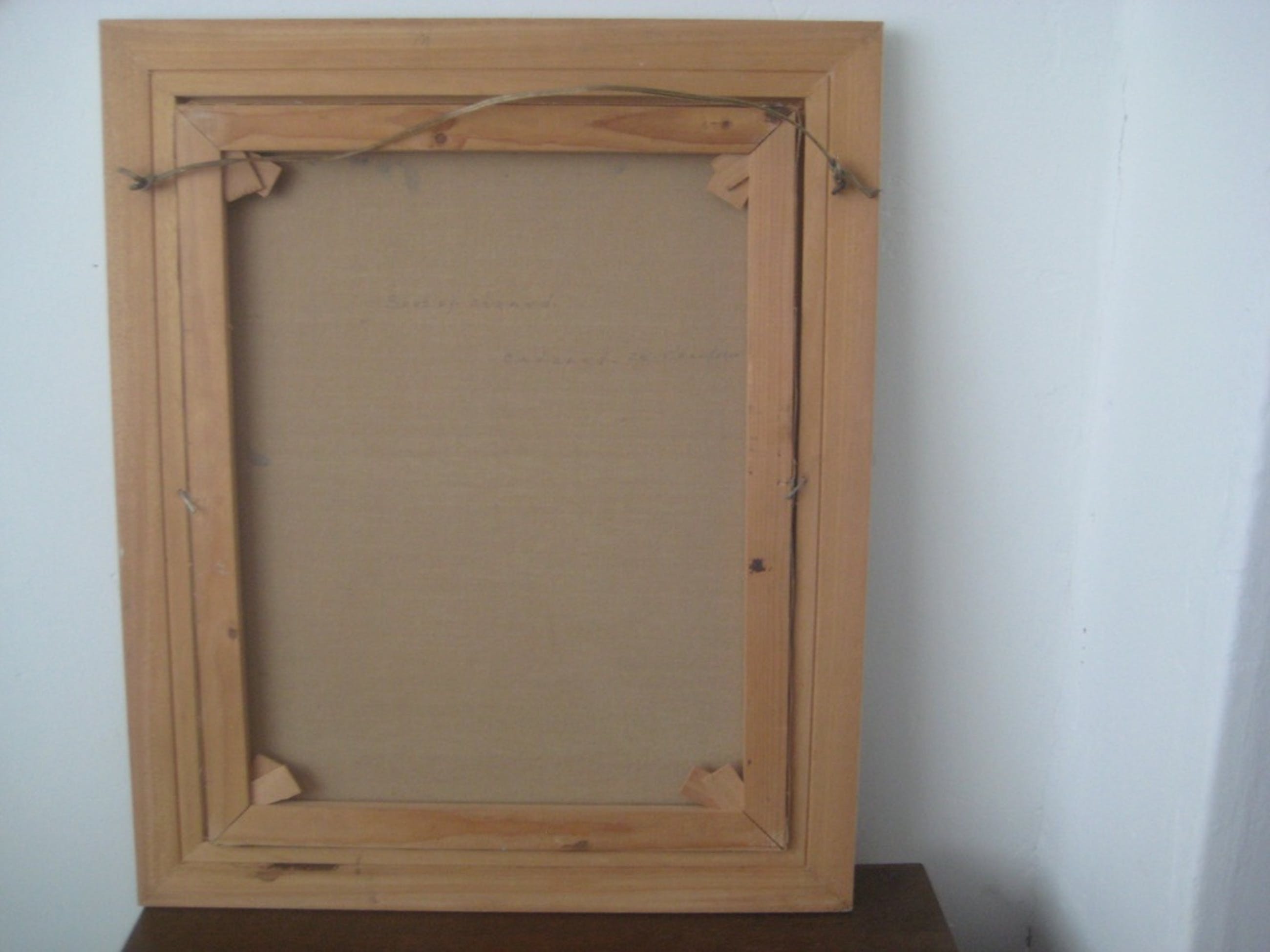 Schilderij is in goede conditie, er zit iets speling tussen het doek en de lijst.