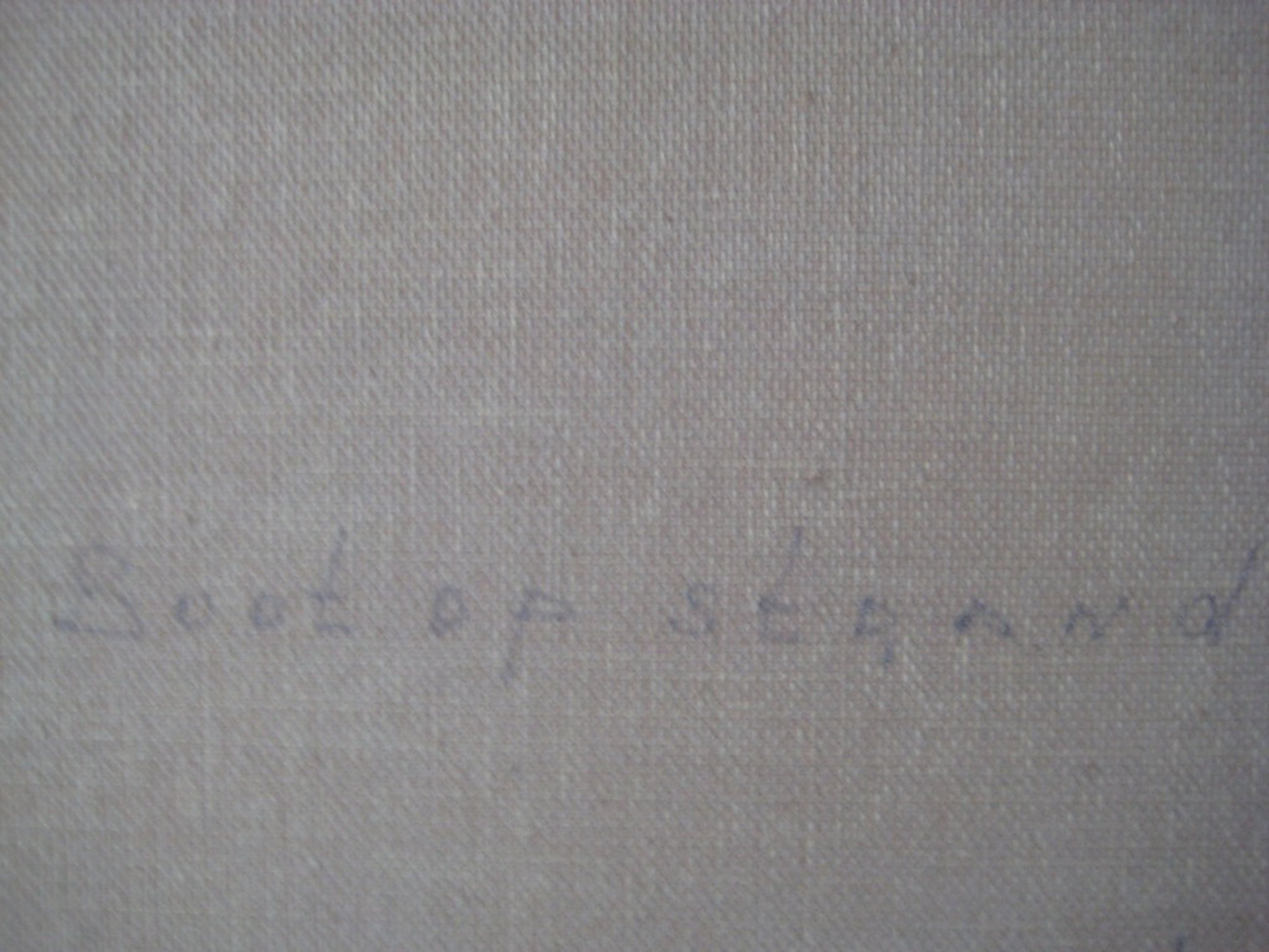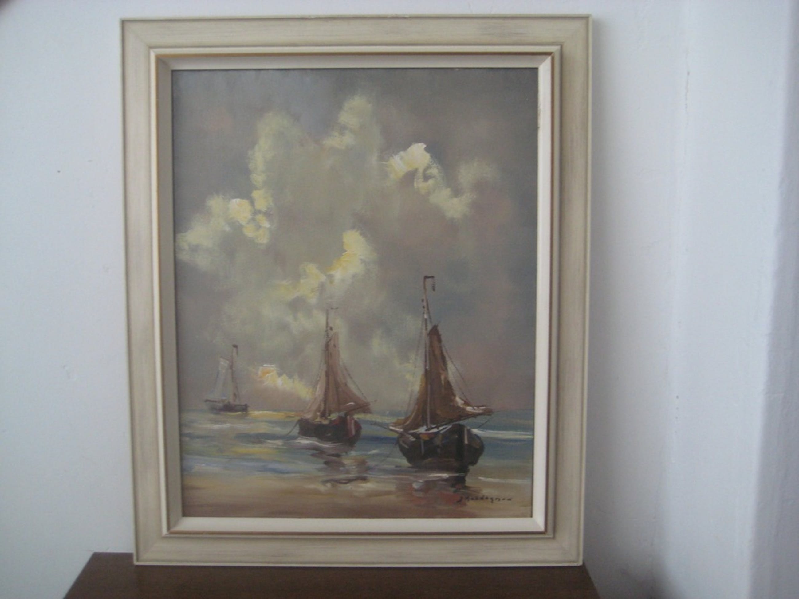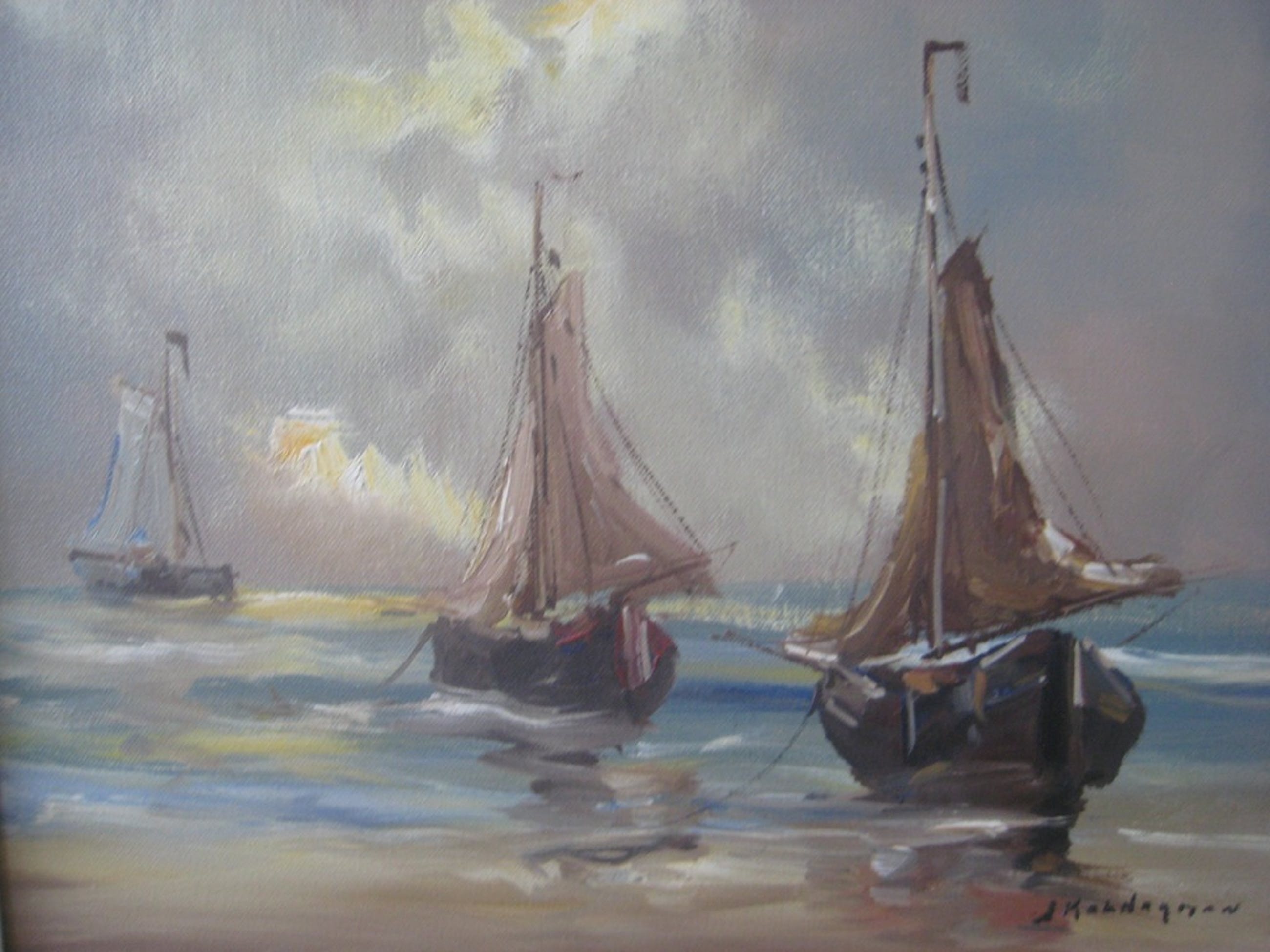 Mooi schilderij van bomschepen op het strand. Gesigneerd; J. Kelderman. Helaas geen jaar aanduiding. Op de achterkant staat met potlood: boot op strand Cadzand - ZW-Vlaanderen