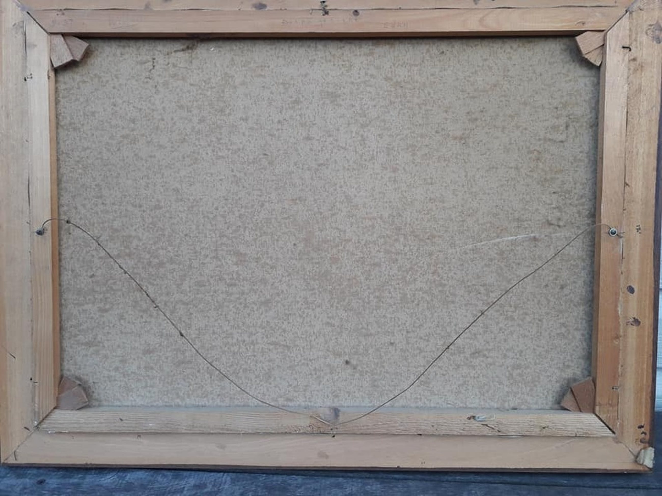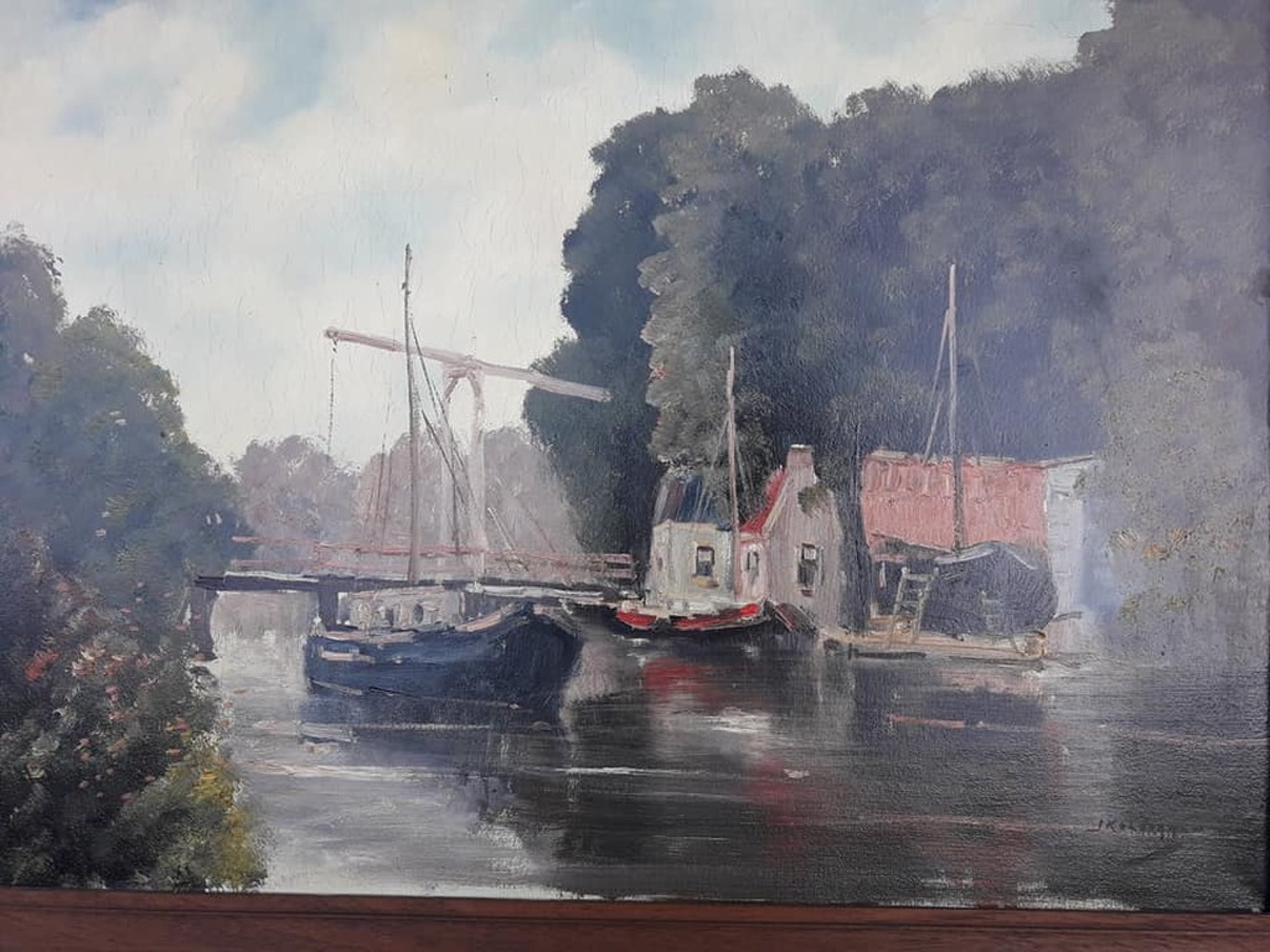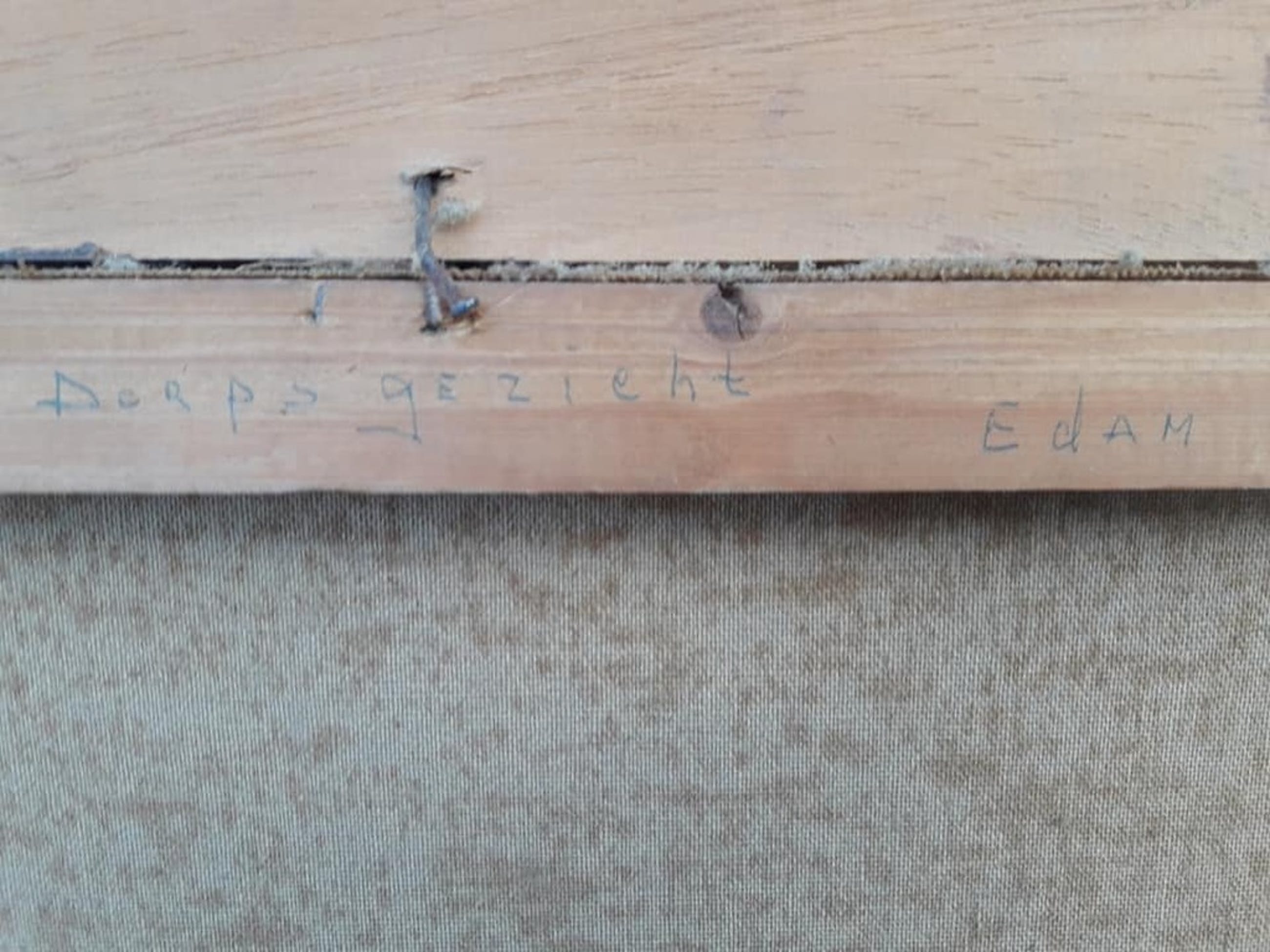 Olieverf op doek in een eiken lijst. Afmetingen van het doek zijn 70 x 50 en in de lijst is het 80 x 60. Doek verkeert in uitstekende staat, zie foto's. Het is een dorpsgezicht bij Edam met wat schepen en een scheepswerf.