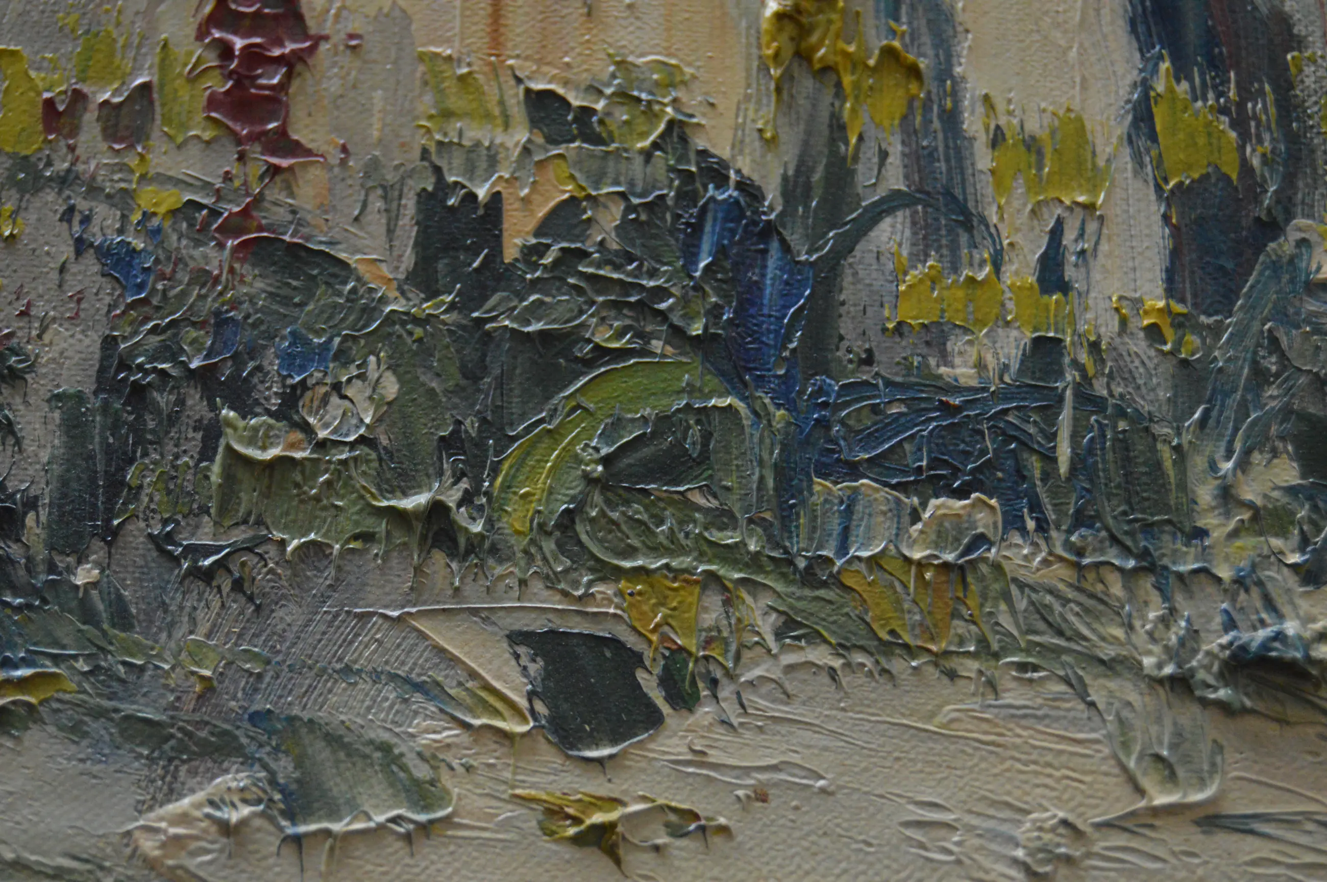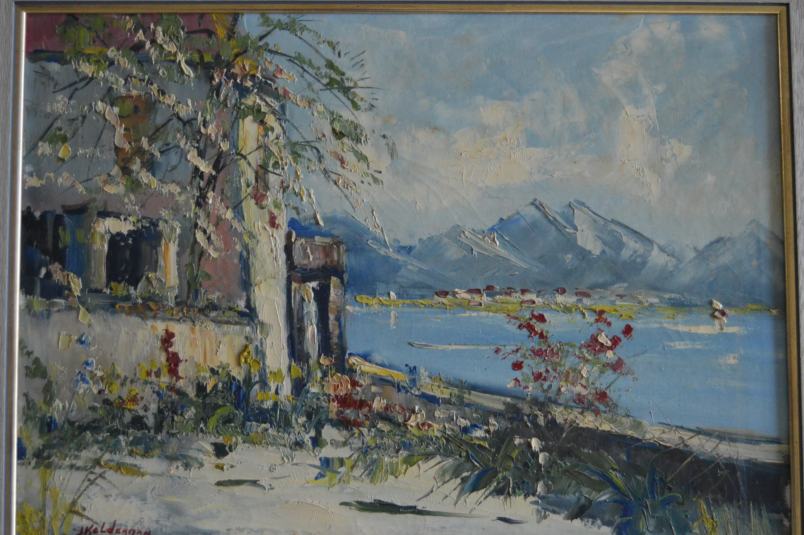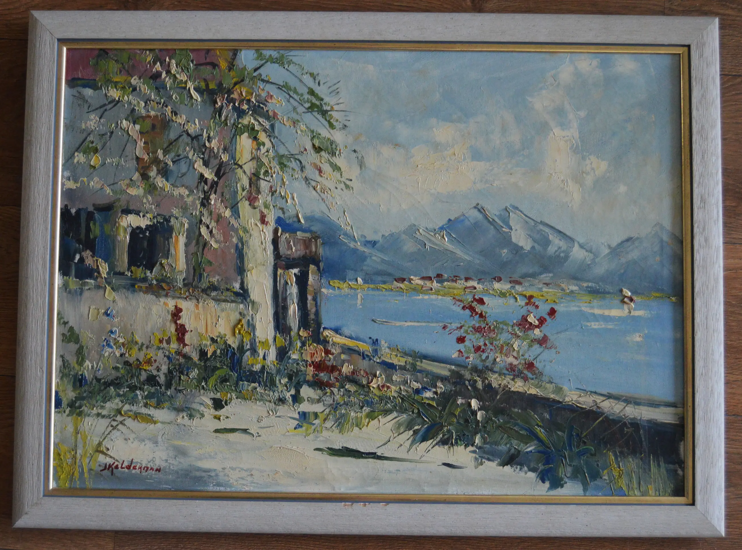 Zeer fraai landschap. Ingelijst in houten lijst. Gespannen op spieraam.