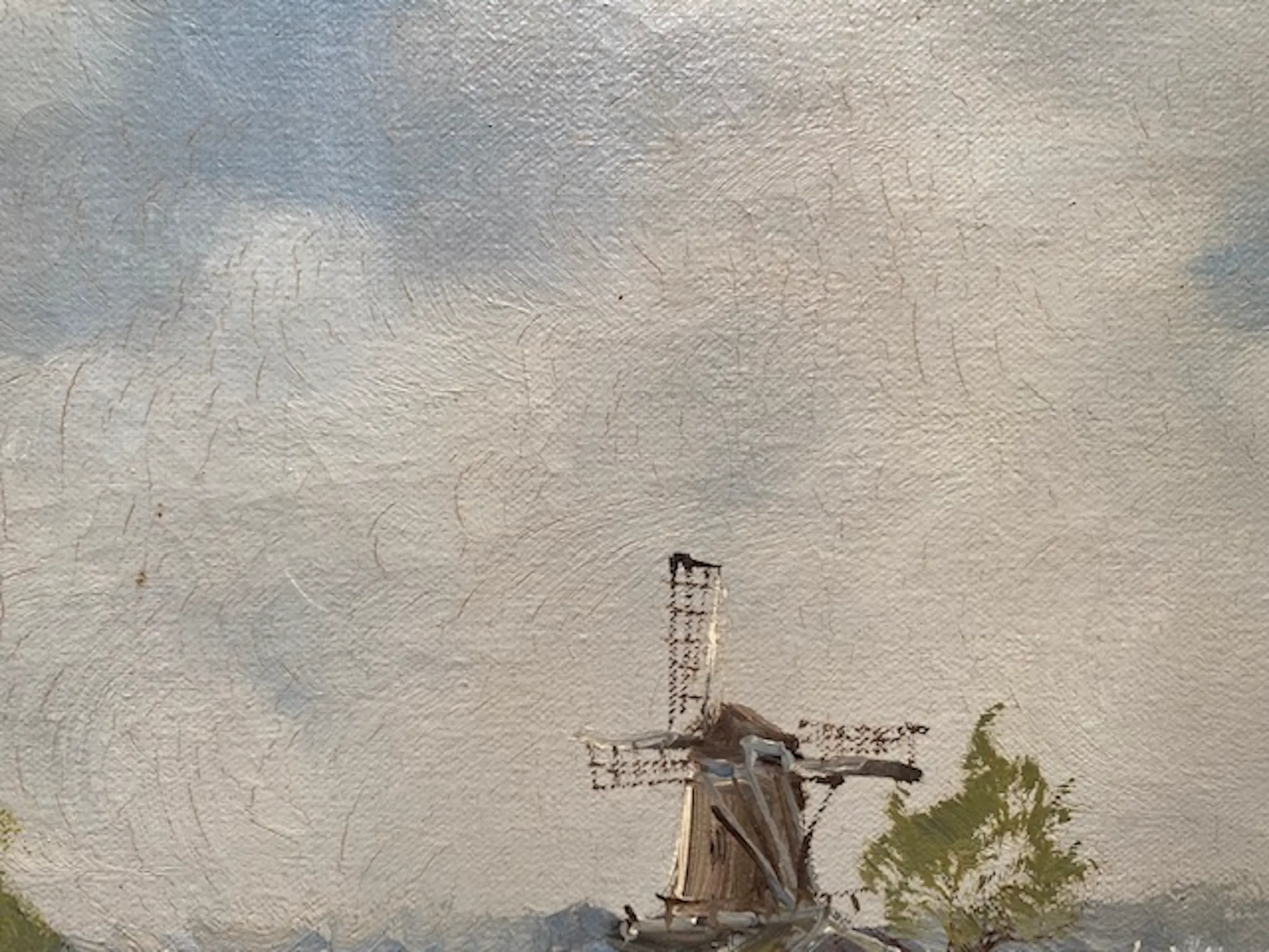Een impressie van twee molens in een typisch Hollands polderlandschap. Jan Kelderman (1914-1990) was een aimabele Nederlandse schilder en handelaar welke bekend staat om zijn typisch Nederlandse landschappen, zee- en stadsgezichten. Hij was een autodidact welke op latere leeftijd nog een opleiding. Hij verkocht zijn schilderijen aan bedrijven, op tentoonstellingen en markten, in hotels en in zijn stamcafé.