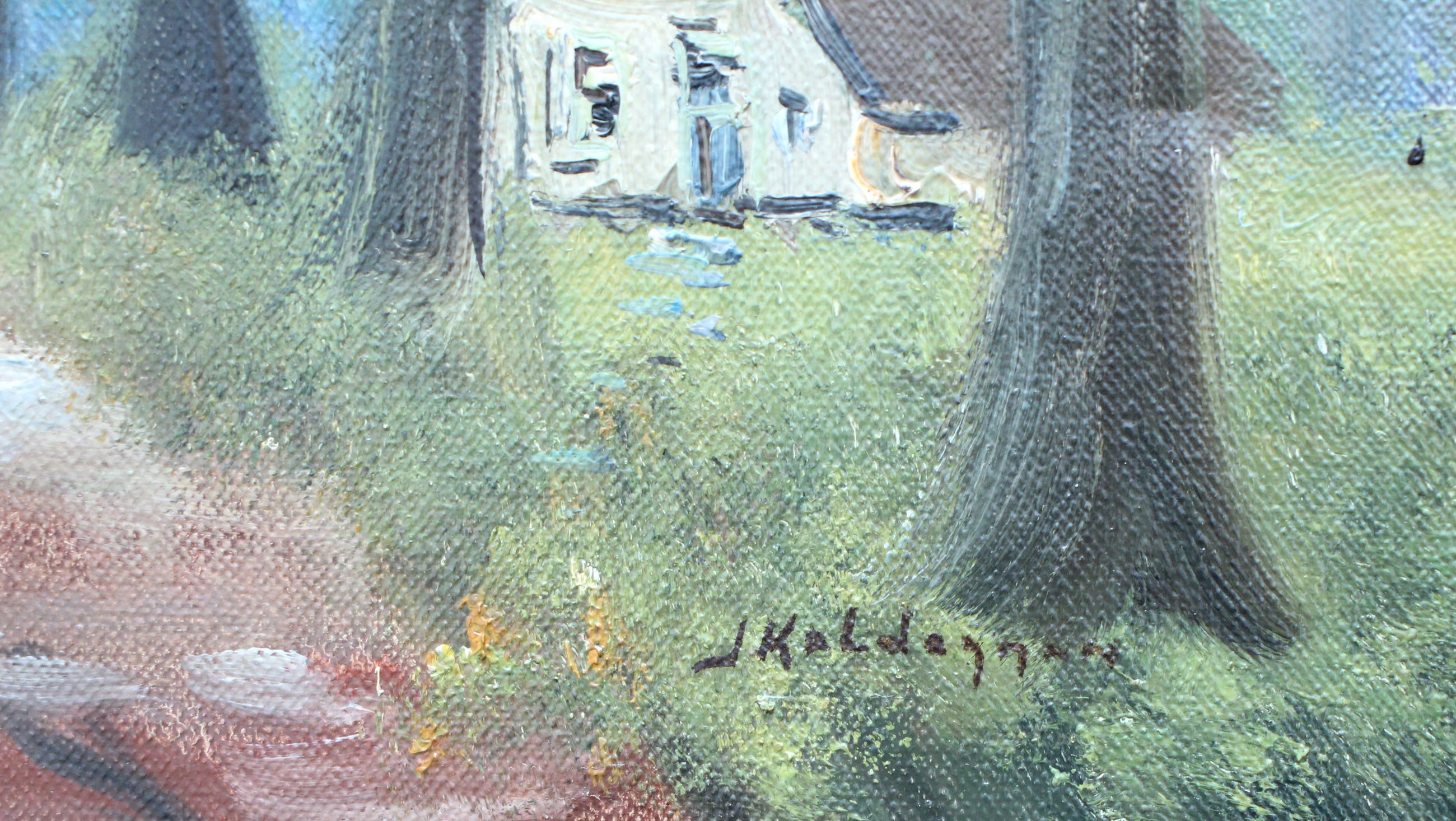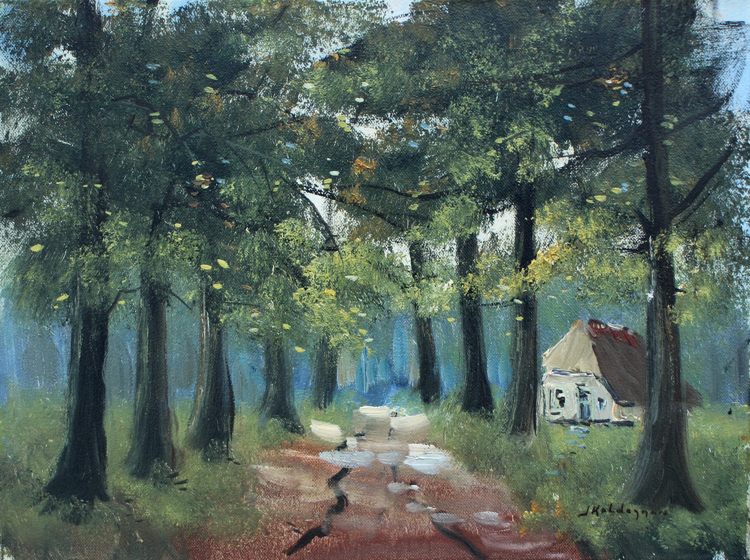 Olieverf op doek van Jan Kelderman. Titel: Boshuisje. Het werk is rechtsonder gesigneerd door de kunstenaar.De authenticiteit van het aangeboden werk wordt volledig gegarandeerd. Een certificaat van echtheid kan, op aanvraag, worden gemaild.