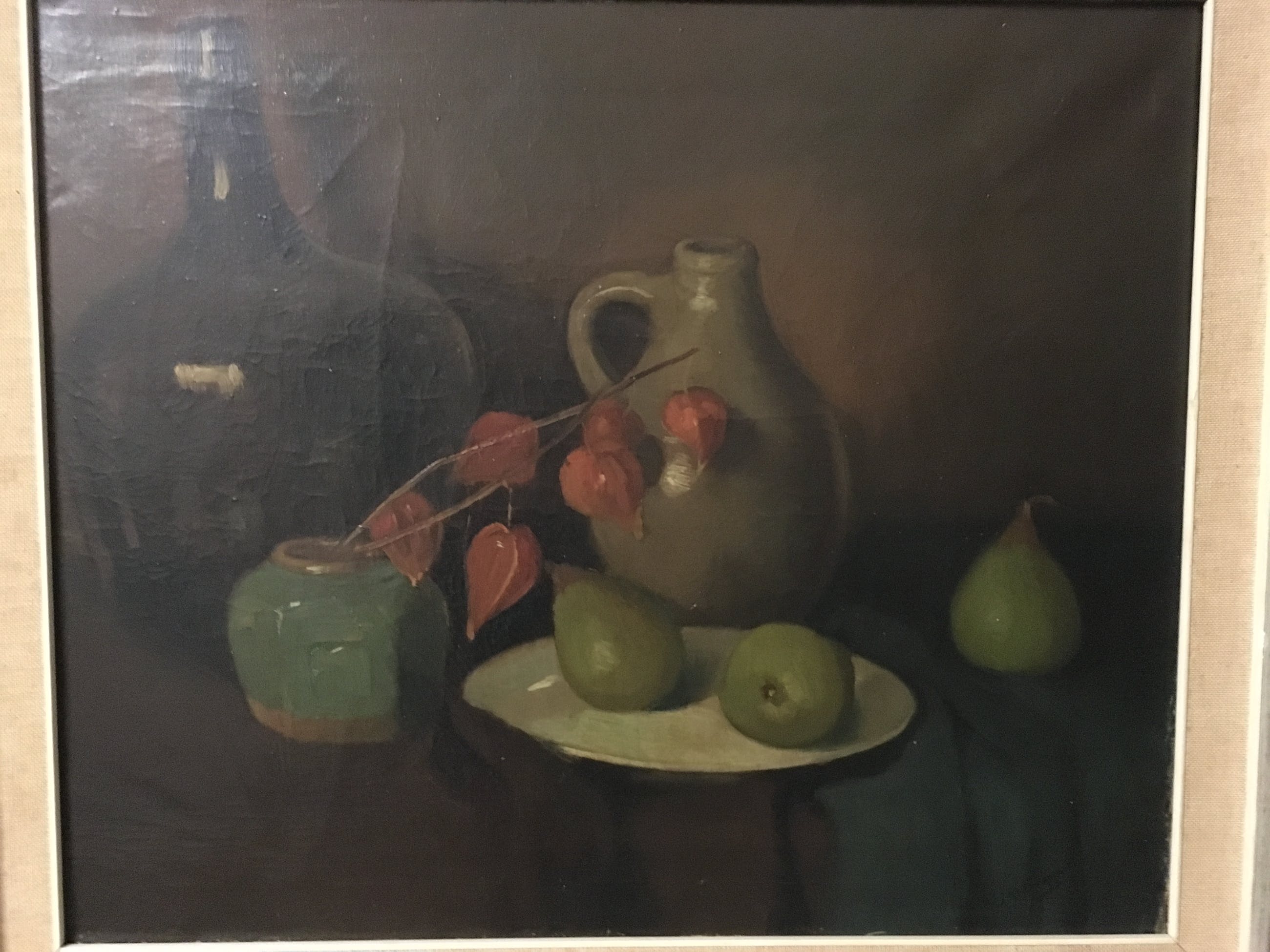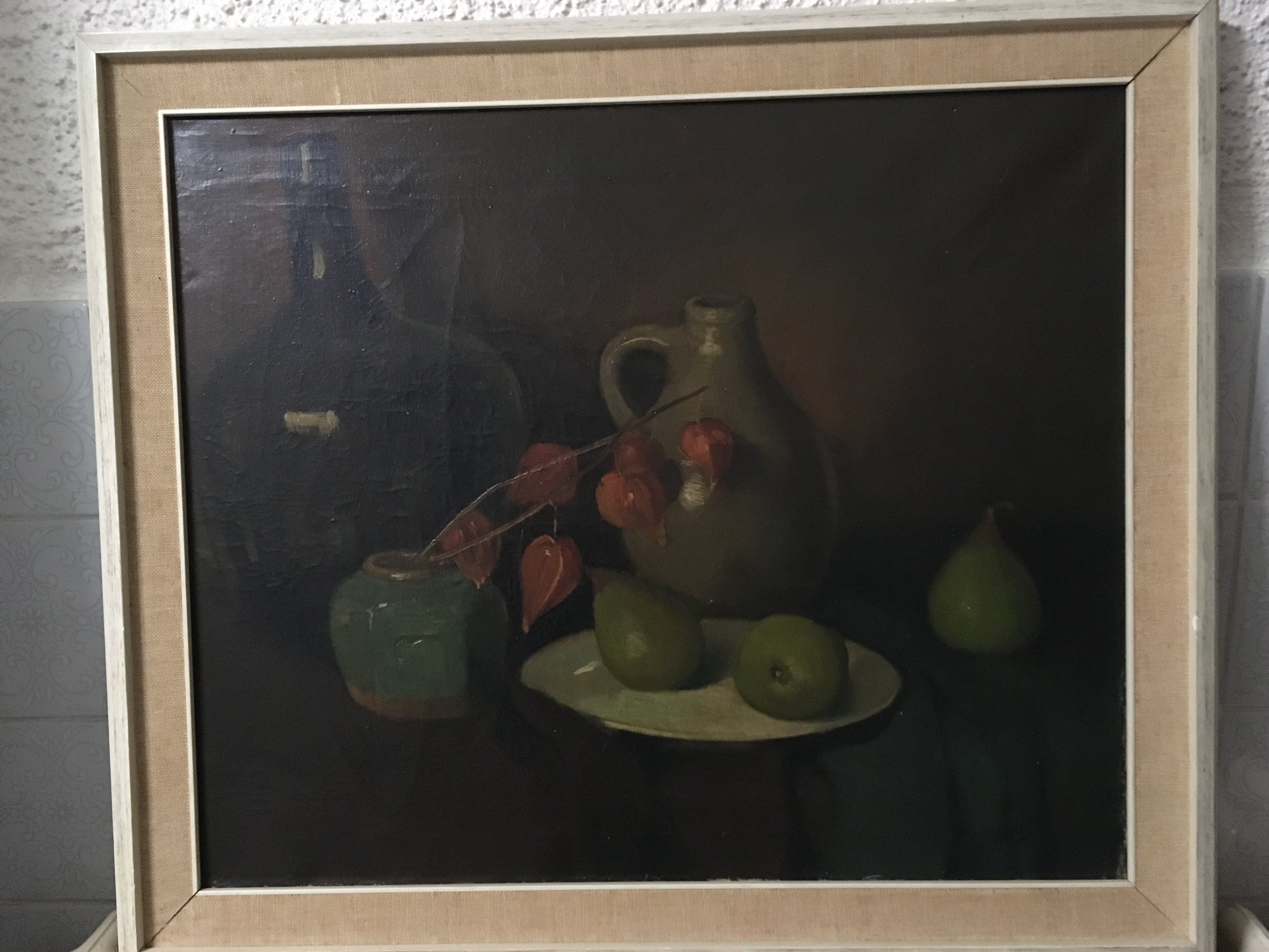 Stilleven met kruik en fruit schilderij is schoongemaakt en nieuwe vernislaag