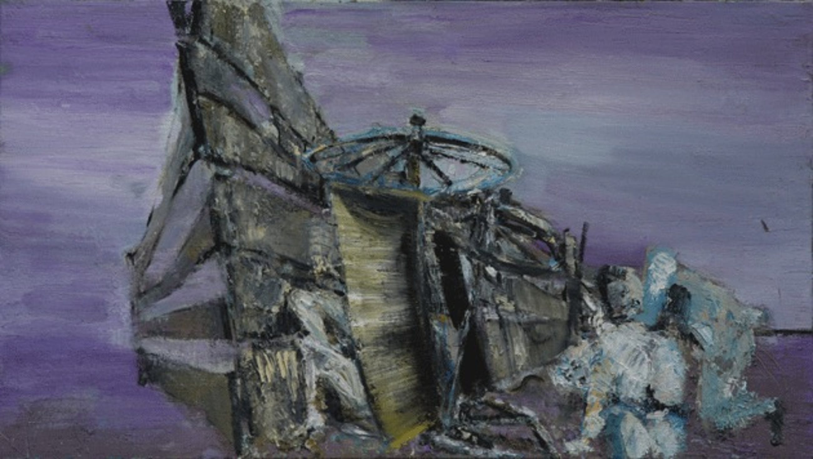 Houten wagen crasht op houten hek. Ook slachtoffers worden afgebeeld. Basiskleur lila-achtig.
