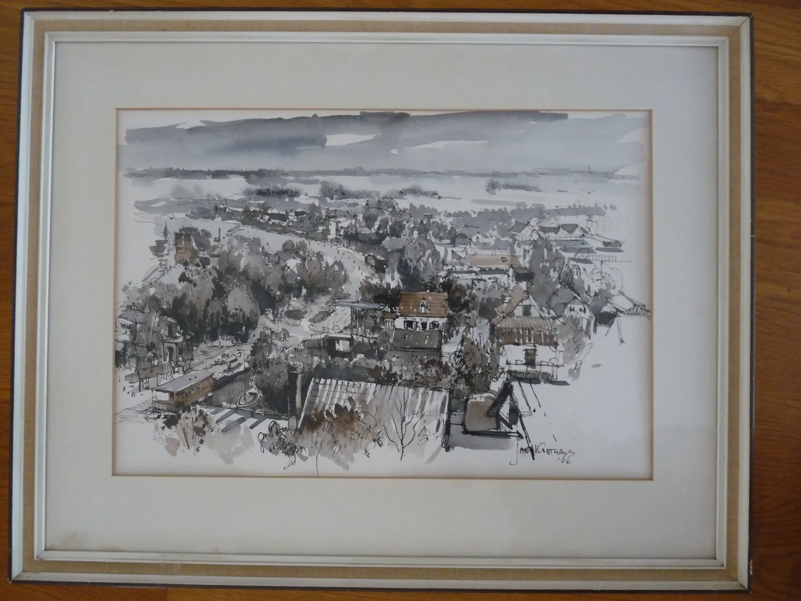 Treffende en sfeervolle weergave van een dorpje in vogelperspectief. Aquarel uit 1966. Afmeting afbeelding 32 x 47,5 cm. Inclusief lijst 51 x 65 cm. Lijst vertoont gebruikssporen. In passe-partout zitten linksonder wat donkere plekken. (detailfoto)
