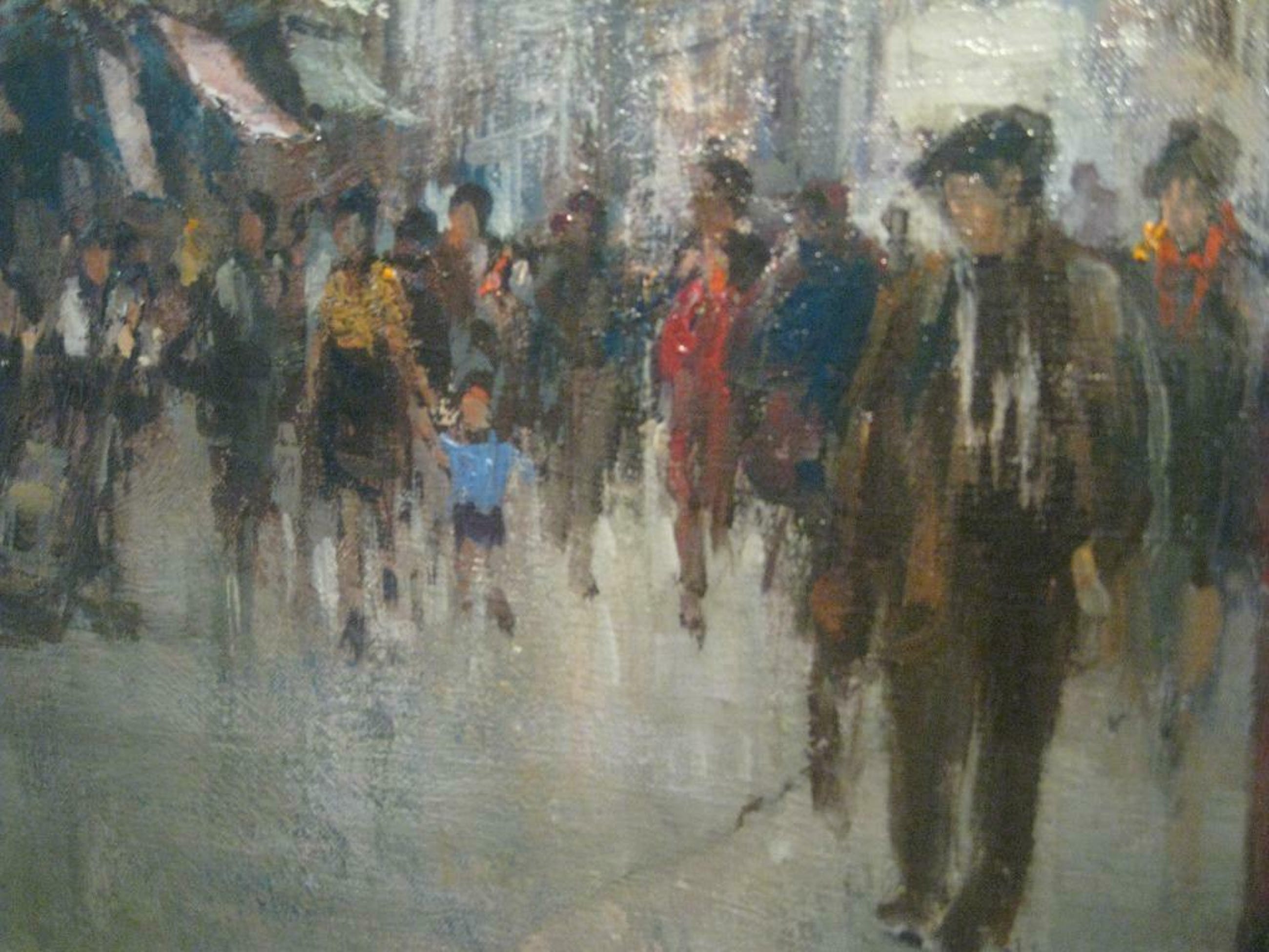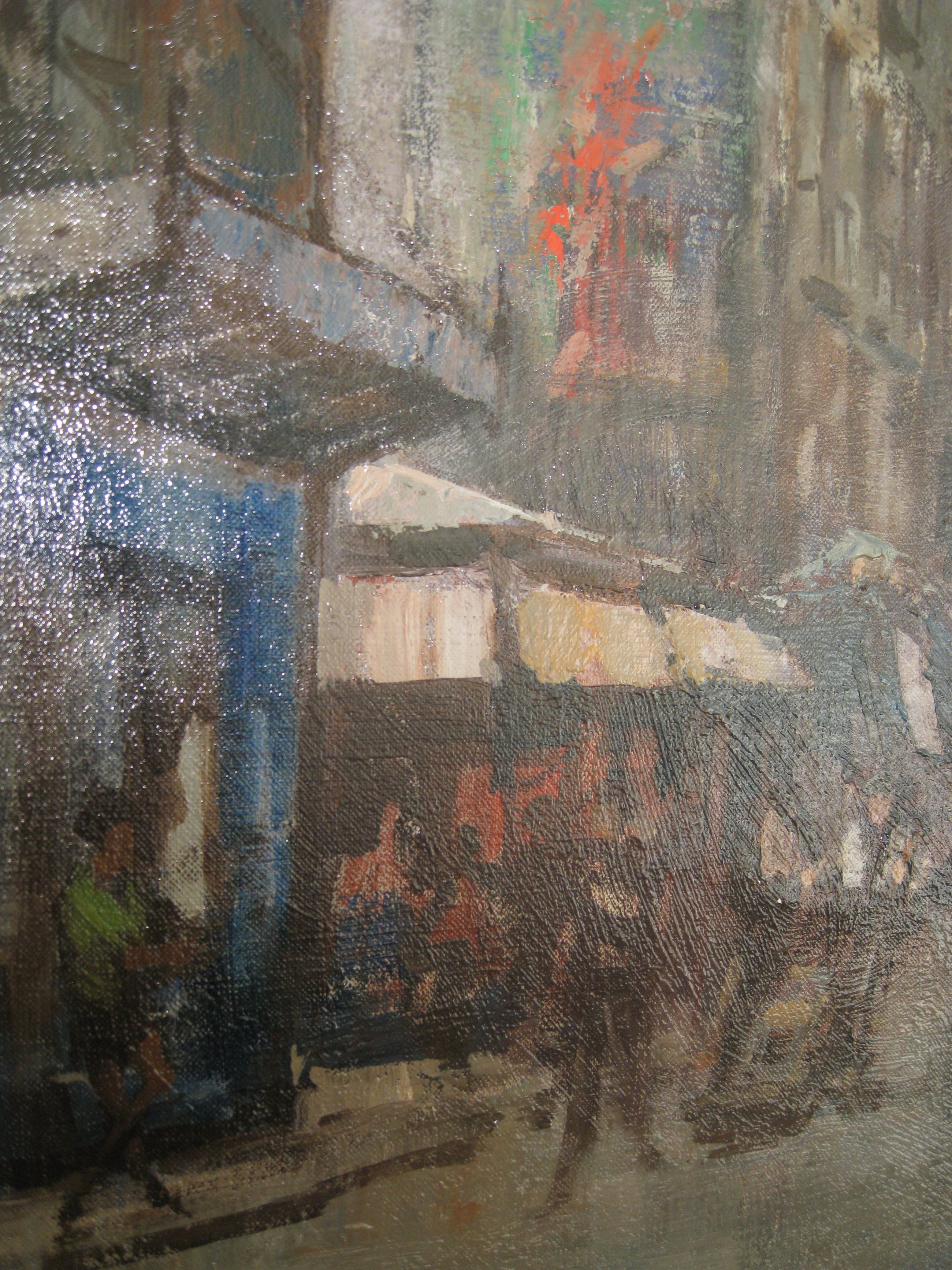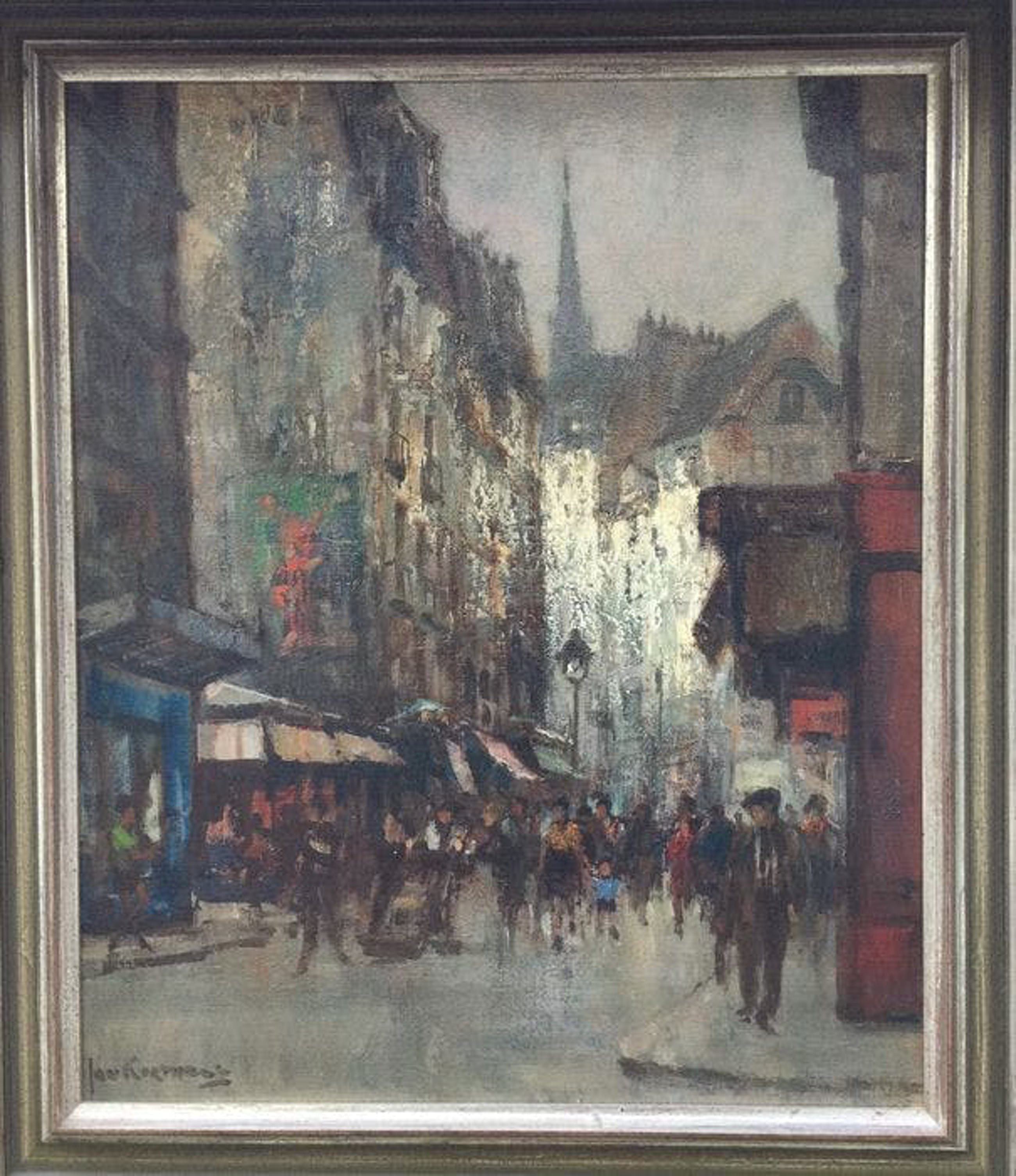 Topwerk van Jan Korthals waarschijnlijk de 'rue de la Huchette' in het Quartier Latin te Parijs. Mooie details zoals de spits van de Notre Dame , de dame in het midden van de straat met het onwillige kind in de blauwe trui en de man rechts op het trottoir met meer dan gemiddelde belangstelling voor de dame van lichte zeden in het groen aan de overkant. Met goedvinden van kunstveiling.nl is het werk bij mij in Amsterdam te zien.