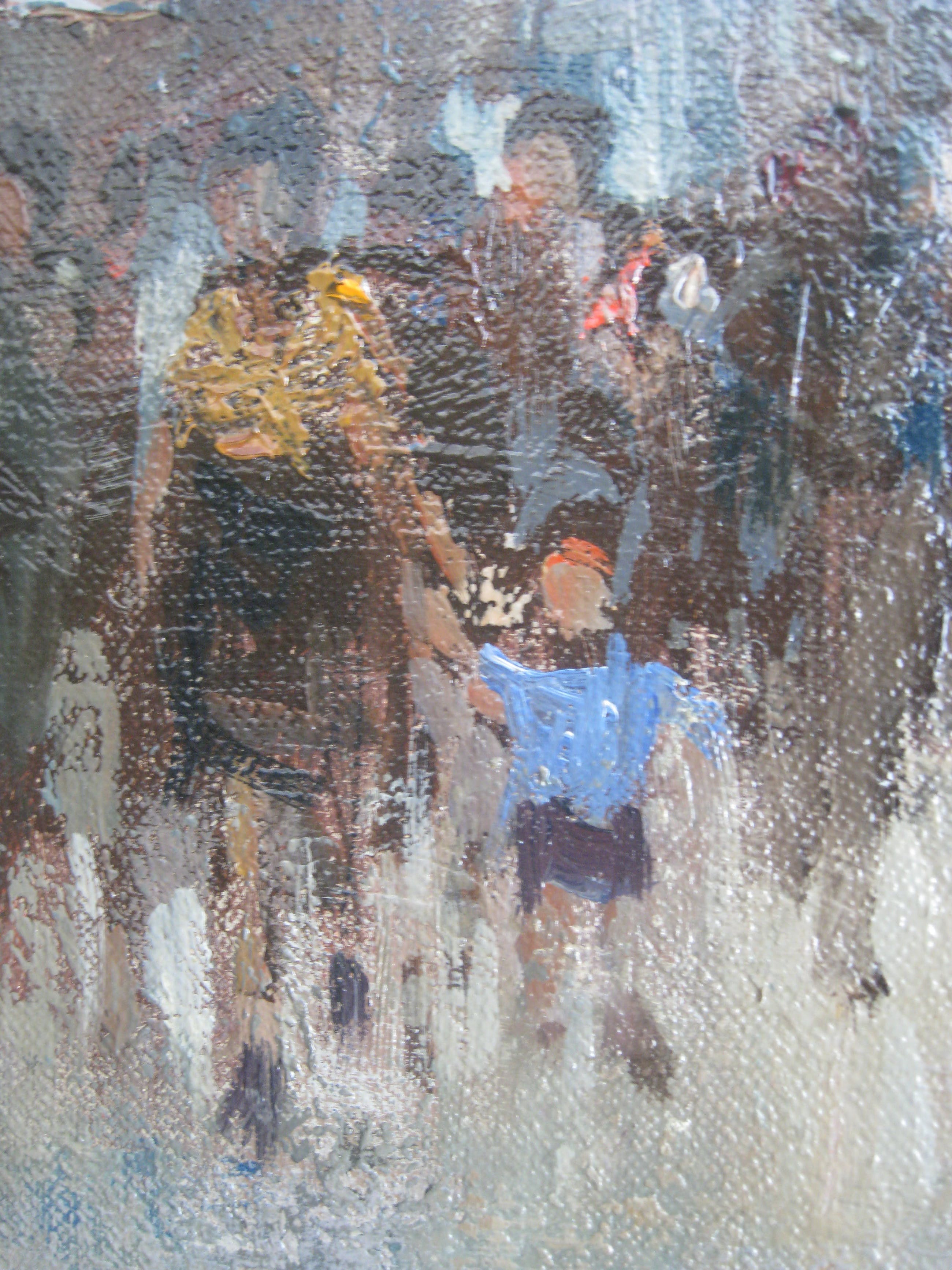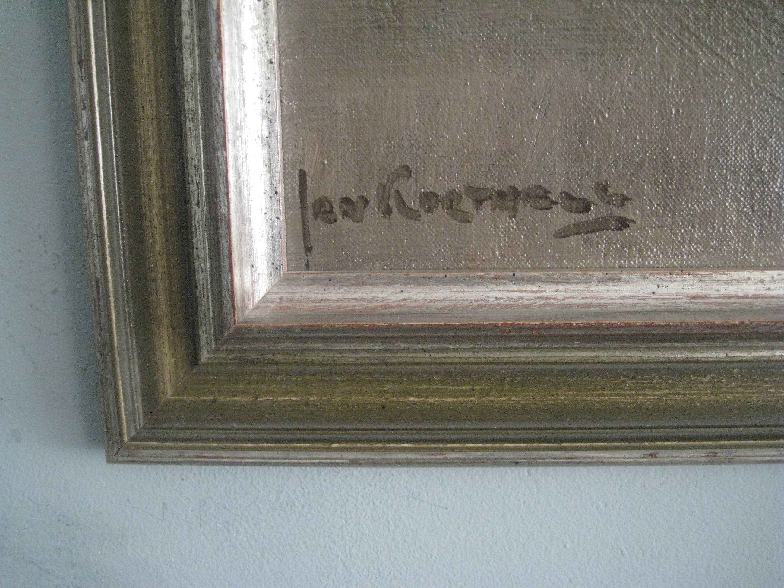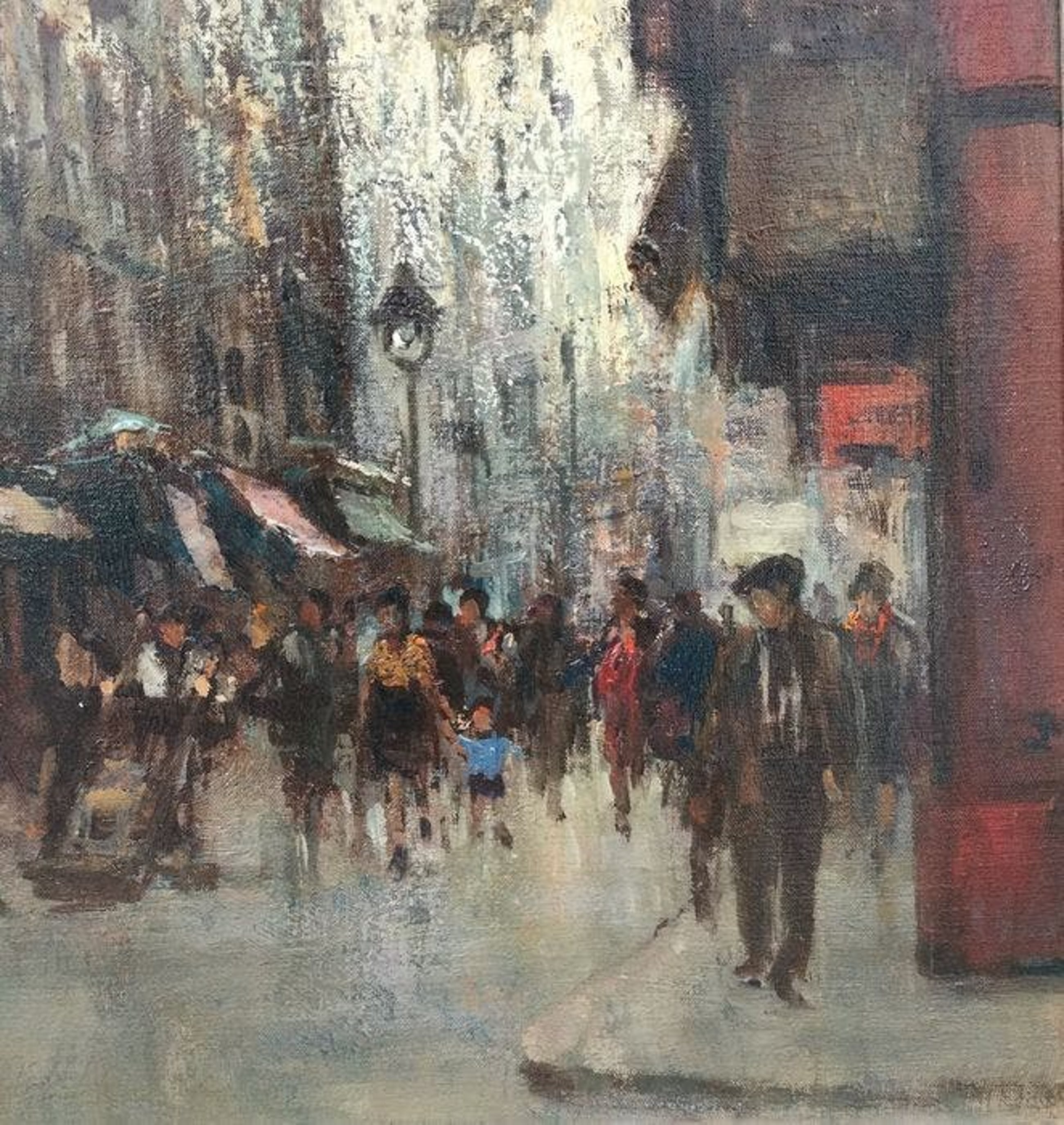 Topwerk van Jan Korthals waarschijnlijk de 'rue de la Huchette' in het Quartier Latin te Parijs. Mooie details zoals de spits van de Notre Dame , de dame in het midden van de straat met het onwillige kind in de blauwe trui en de man rechts op het trottoir met meer dan gemiddelde belangstelling voor de dame van lichte zeden in het groen aan de overkant. Met goedvinden van kunstveiling.nl is het werk bij mij in Amsterdam te zien.