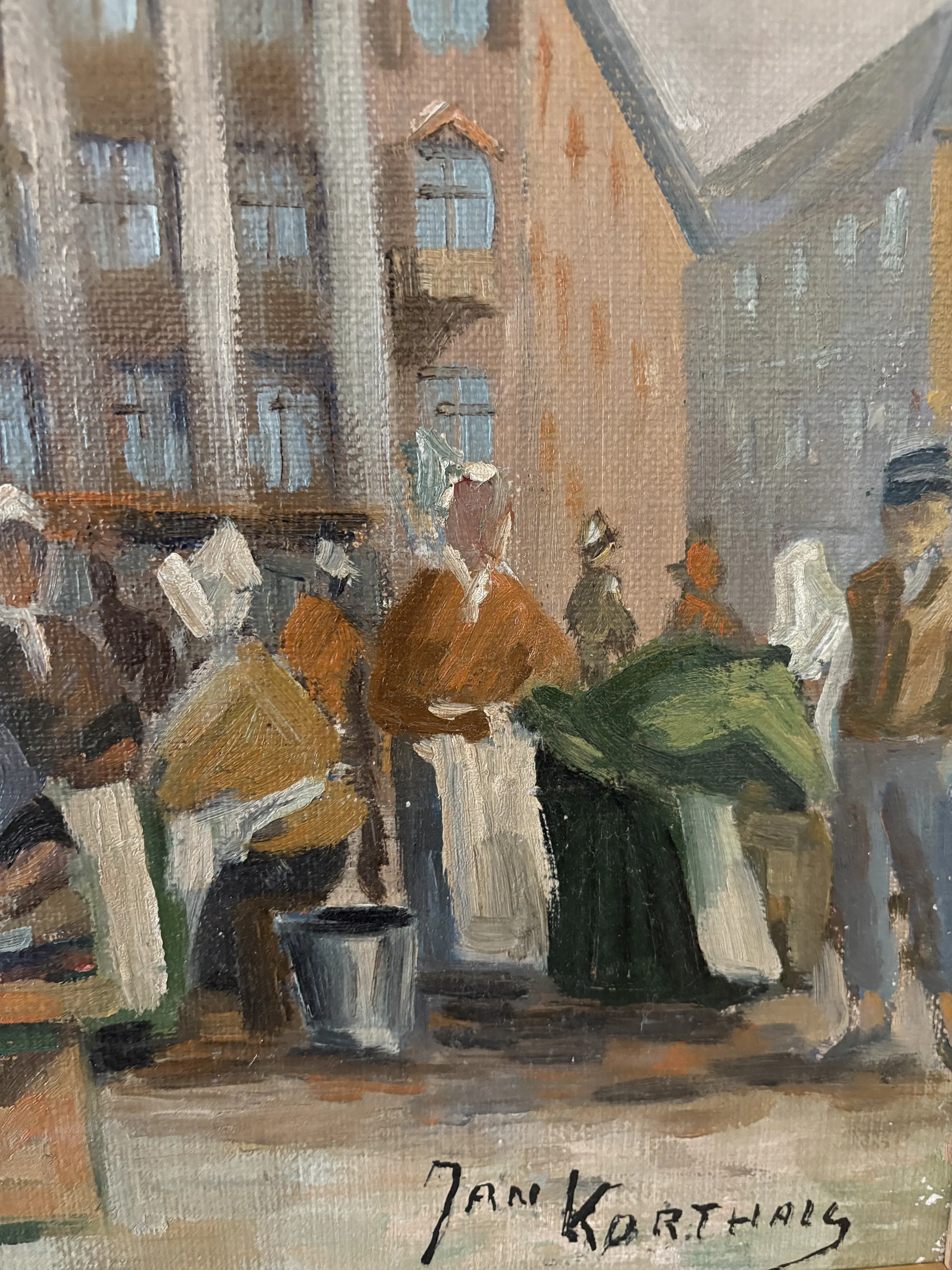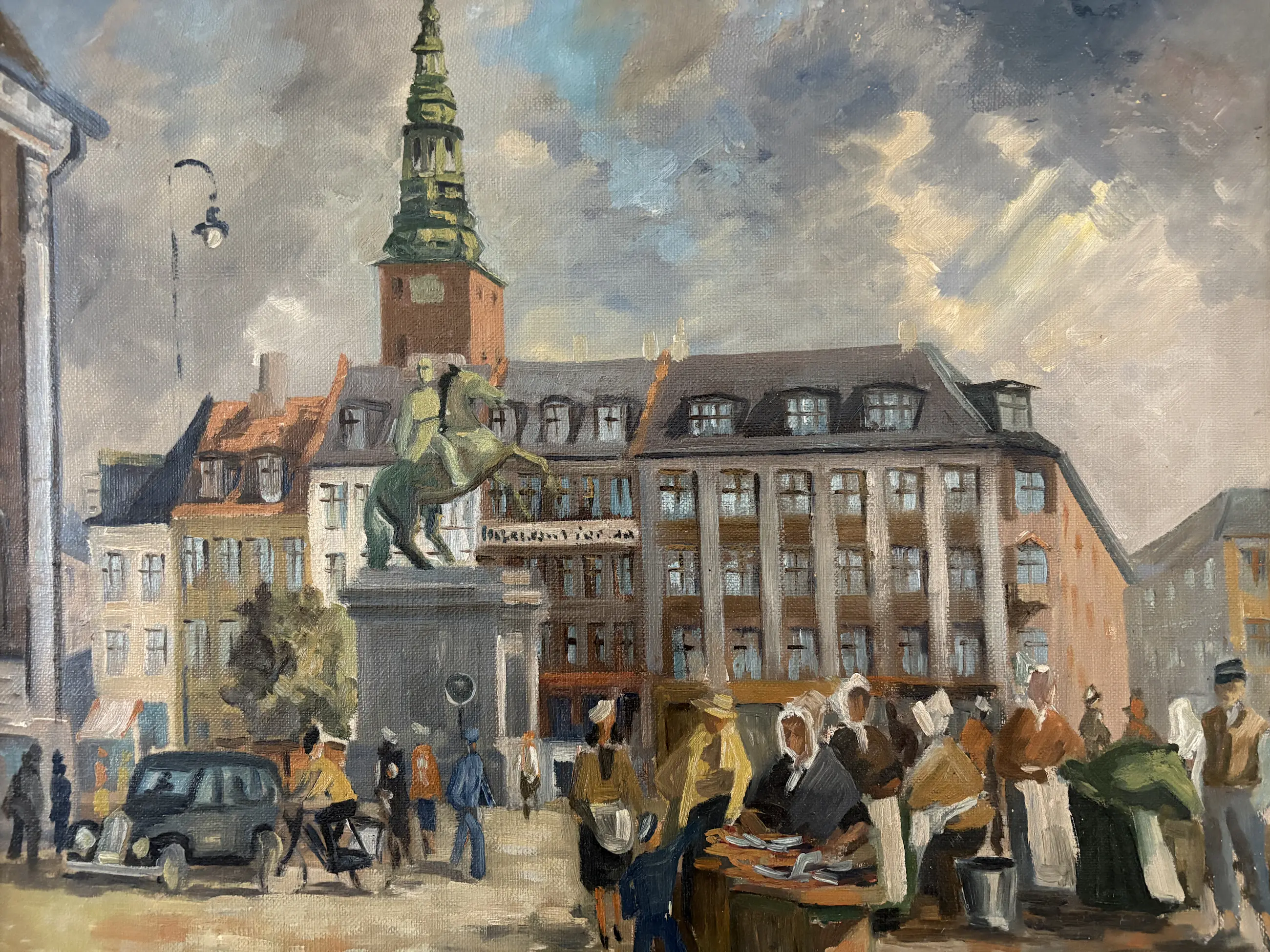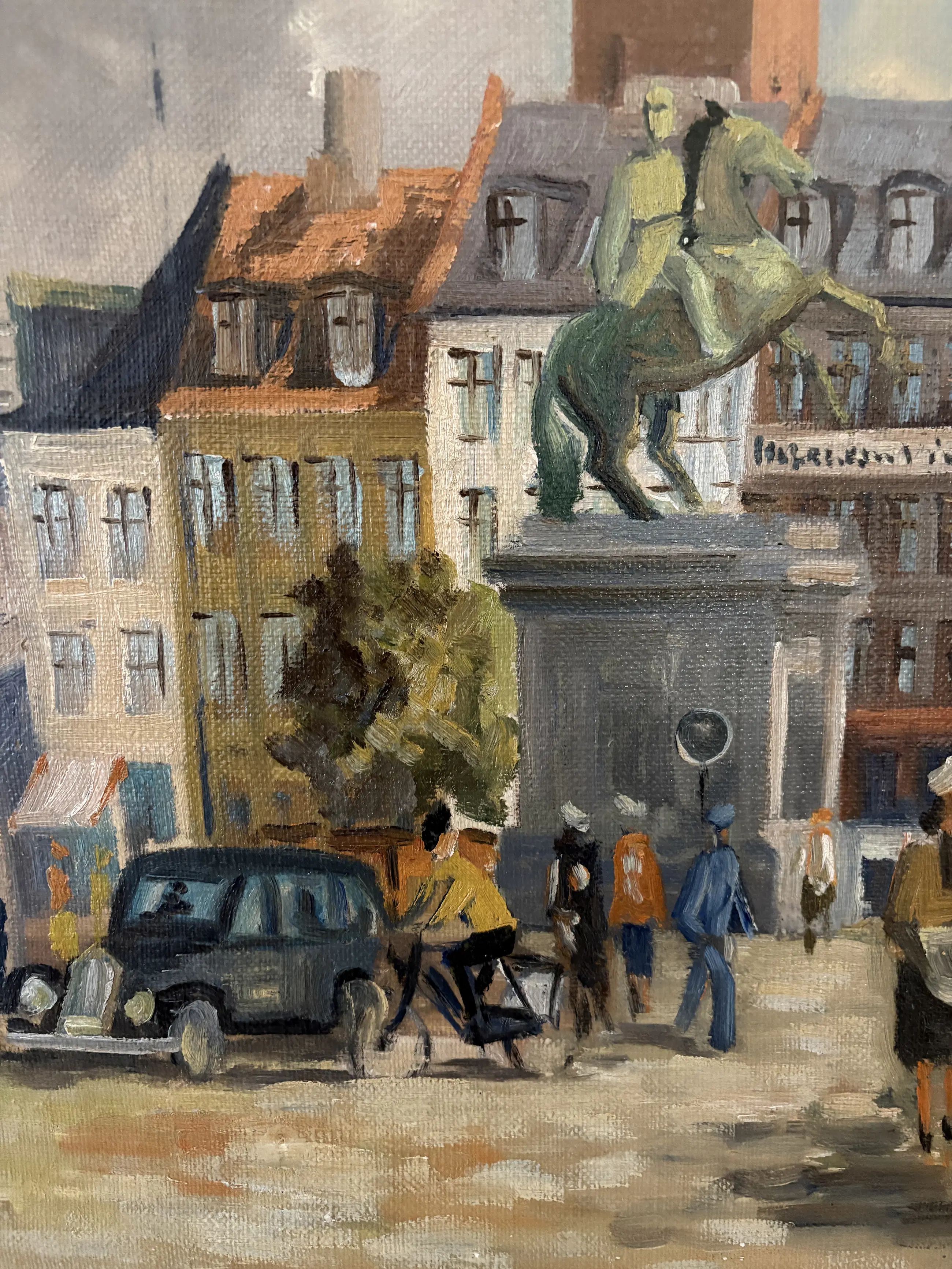 Olieverf op doek van Jan Korthals - voorstellend het Hojbro plein te Kopenhagen aan het monument van bisschop Absolon van in de periode begin jaren ‘50 toen Korthals Europa doorkruiste - afm 67 x 58 cm (79 x 70 cm incl kader) ingelijst in houten kader - in zeer goede conditie