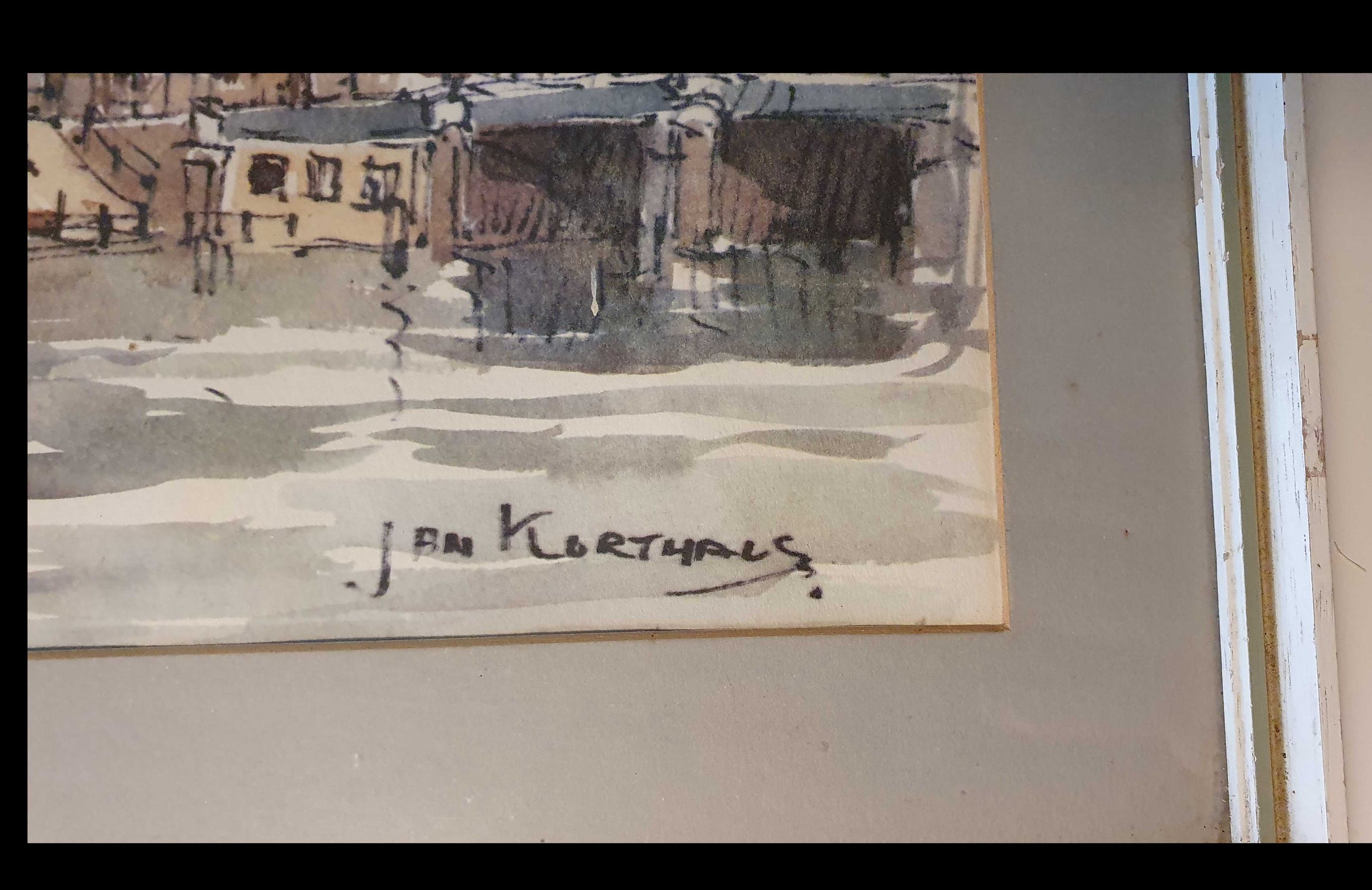 Het werk zit in een houten lijst met passe-partout achter glas. Gesigneerd Jan Korthals.