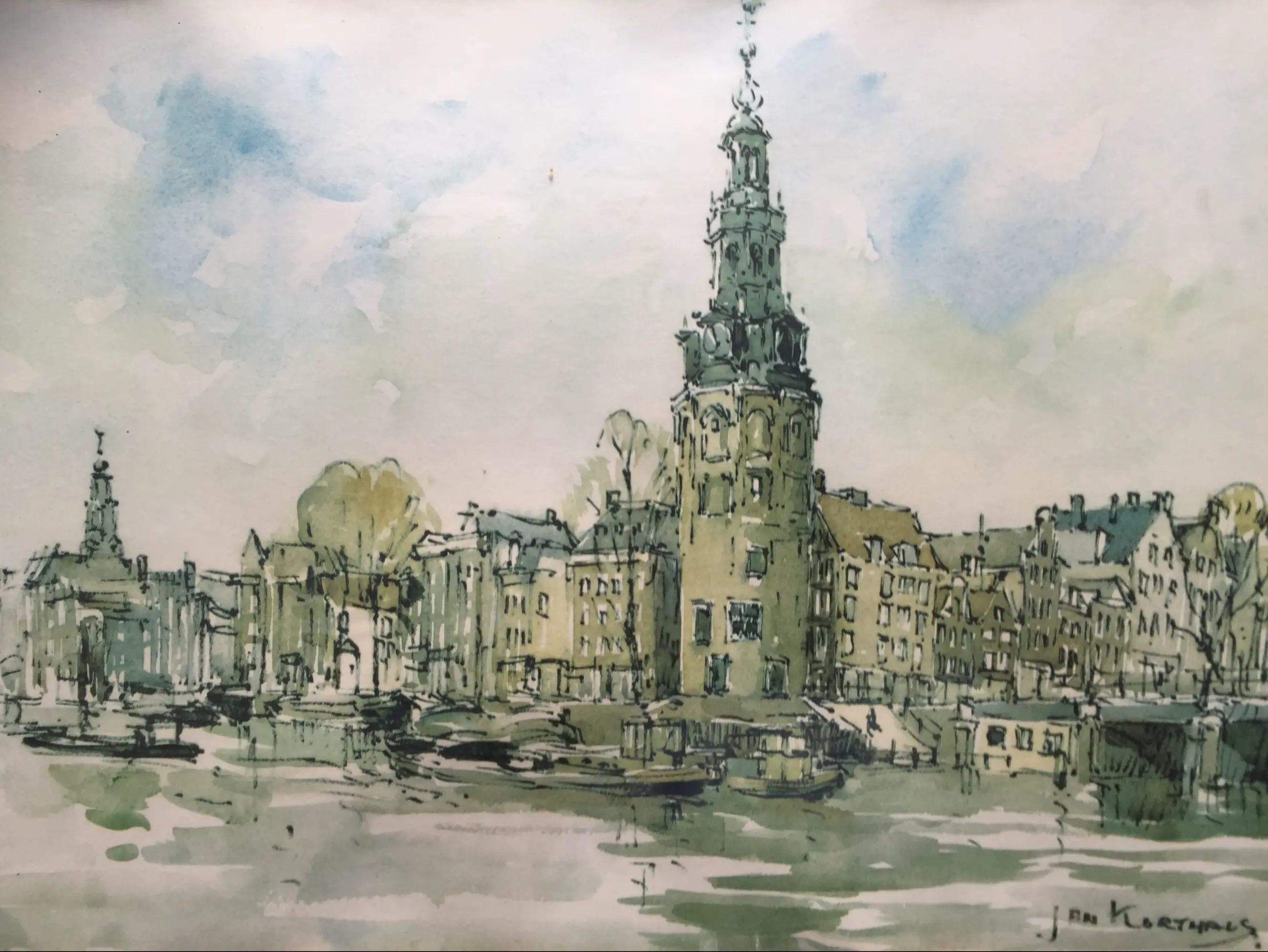 Het werk zit in een houten lijst met passe-partout achter glas. Gesigneerd Jan Korthals.