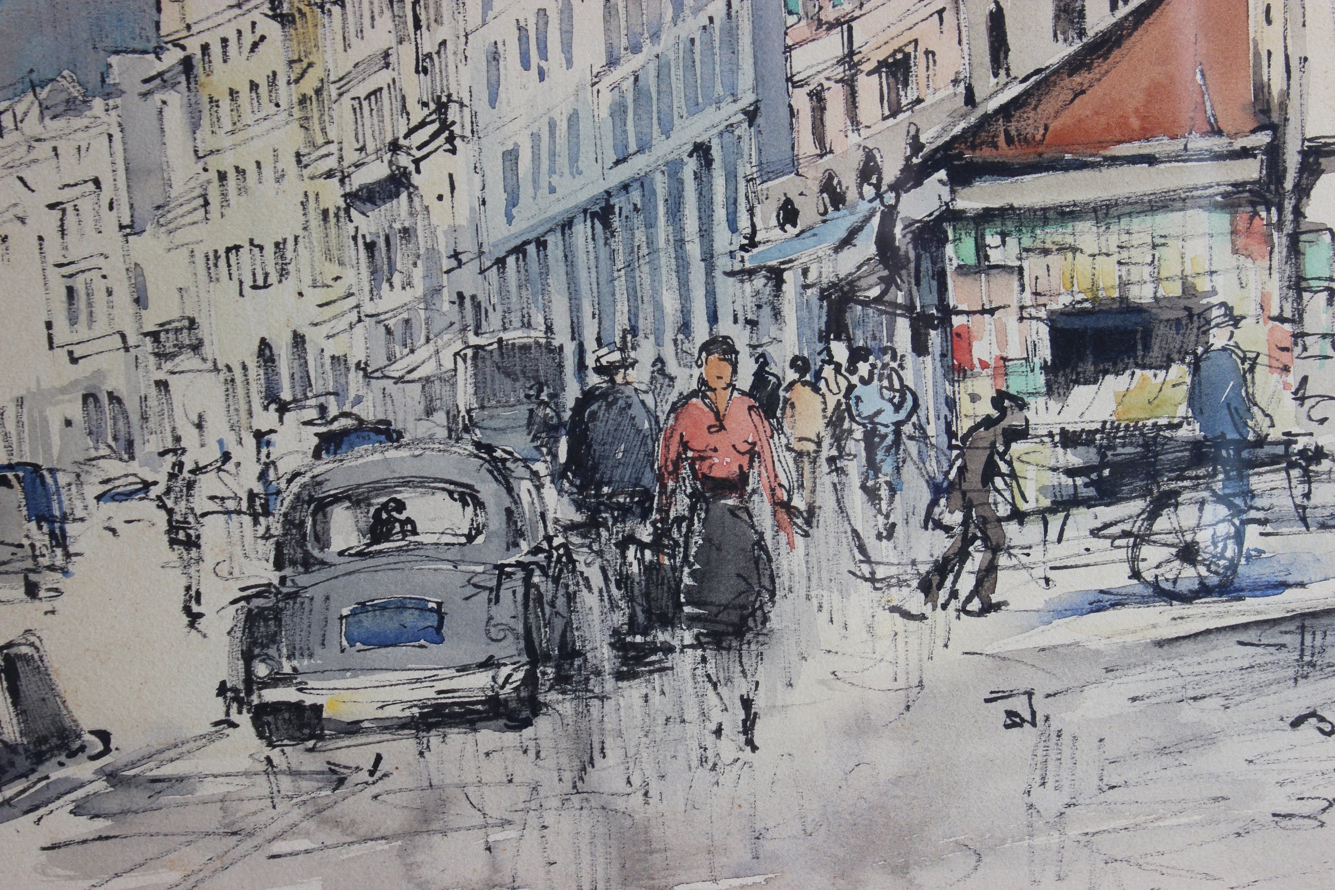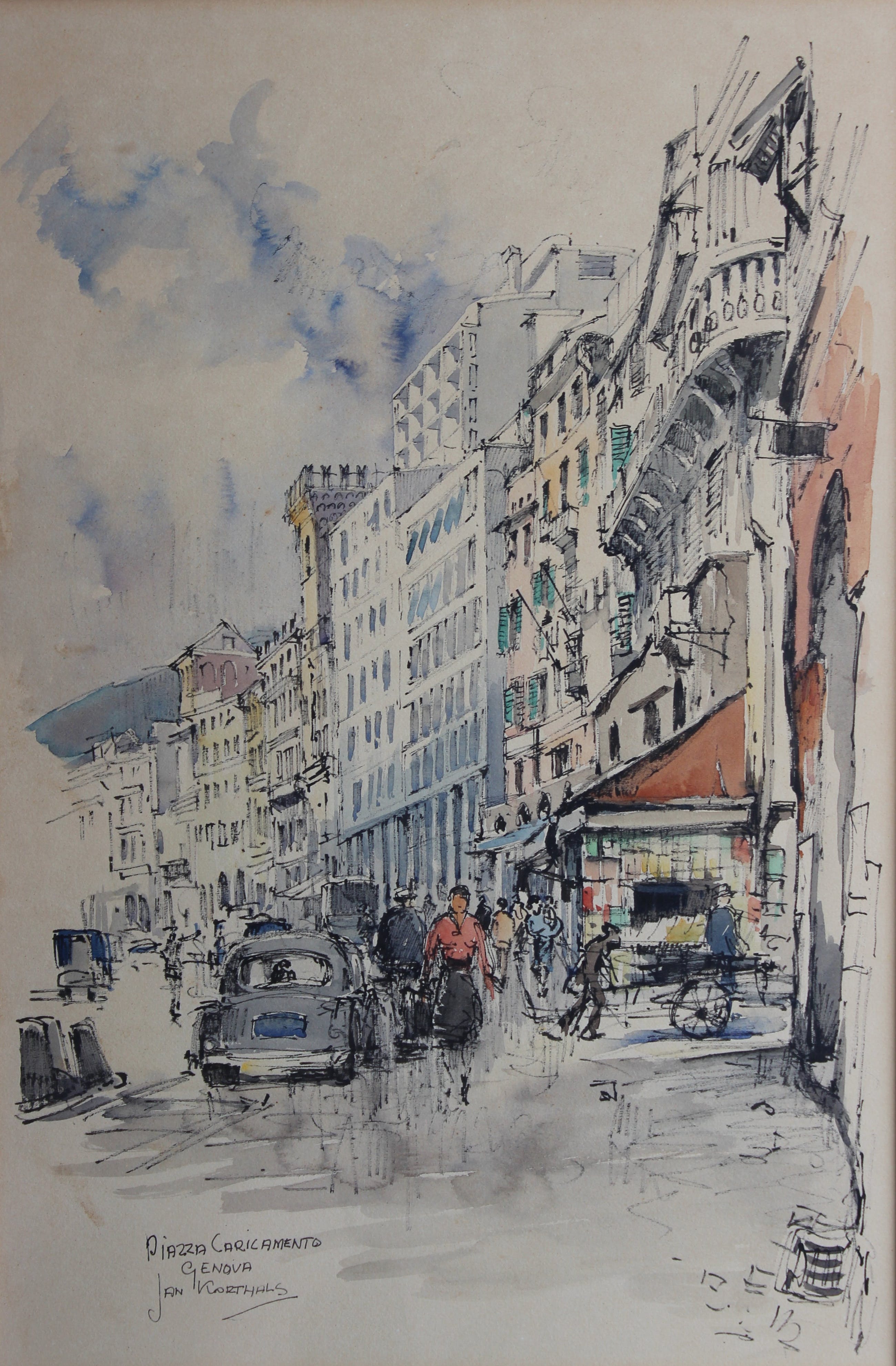 Dit werk is van de Nederlandse kunstenaar Jan Korthals. Afgebeeld is Piazza Caricamento, een straat aan het water in de Italiaanse stad Genua. Het werk is 50 x 33 cm (70 x 53 inclusief passe-partout en lijst) en linksonder gesigneerd door de kunstenaar.