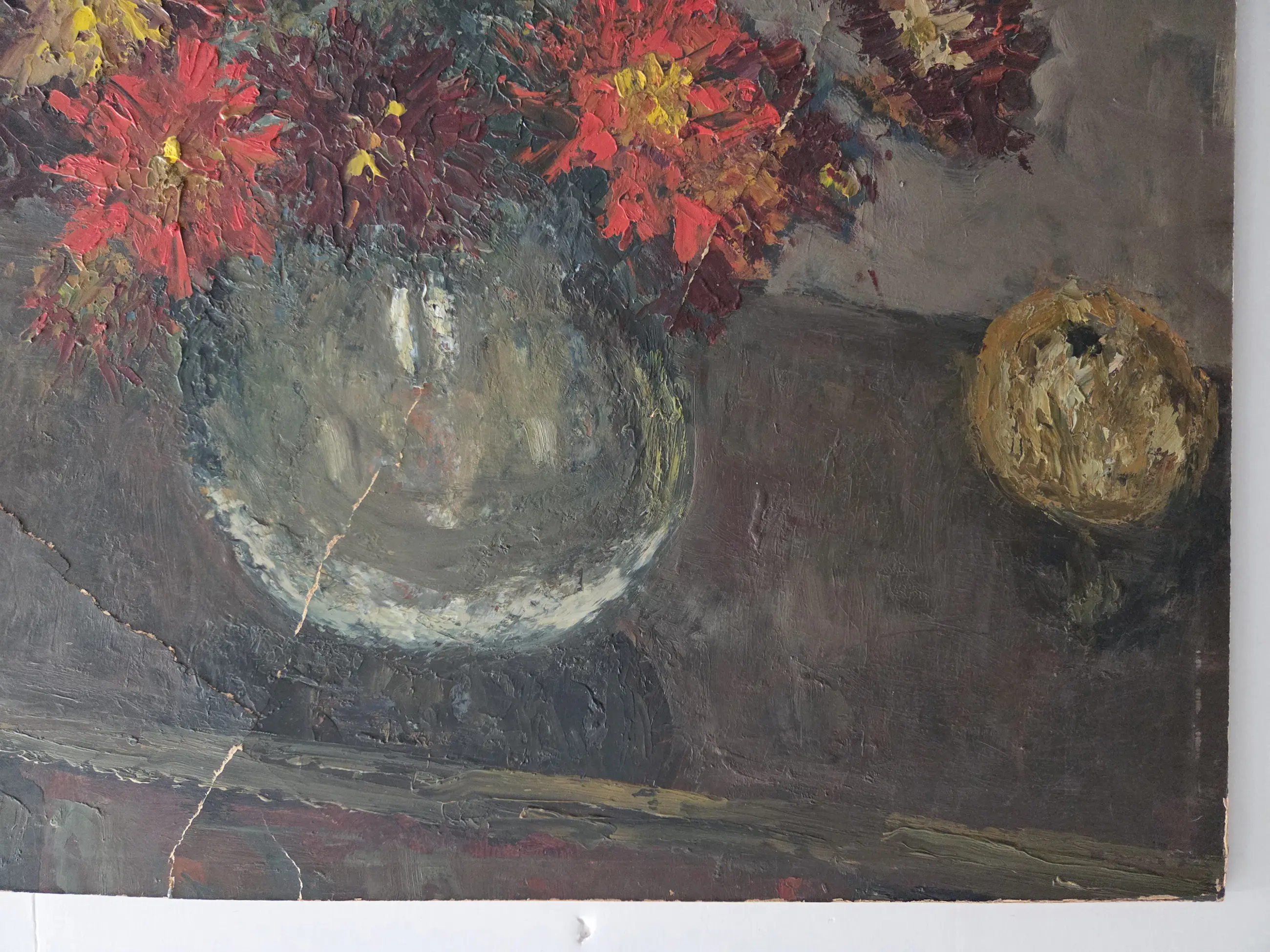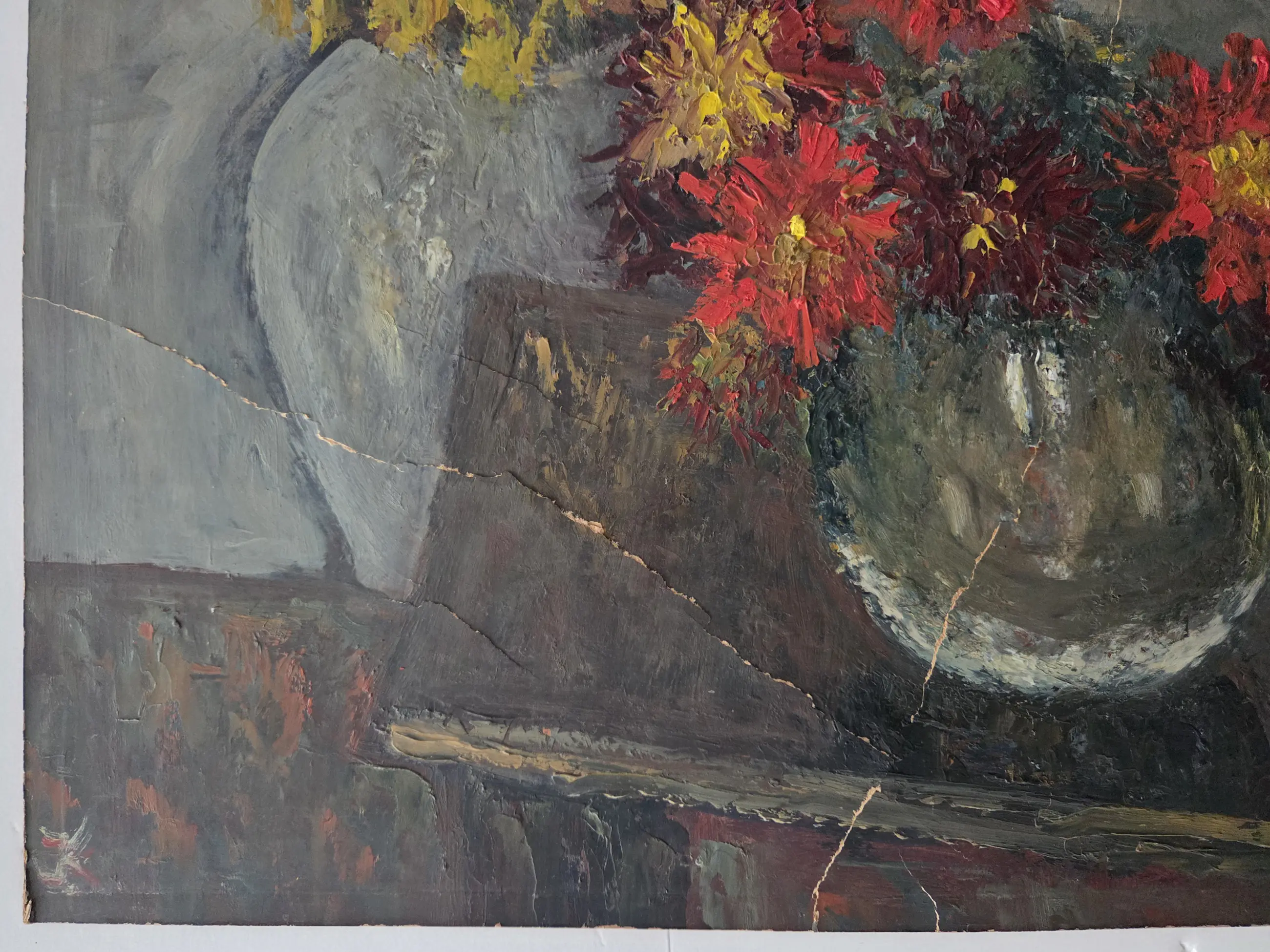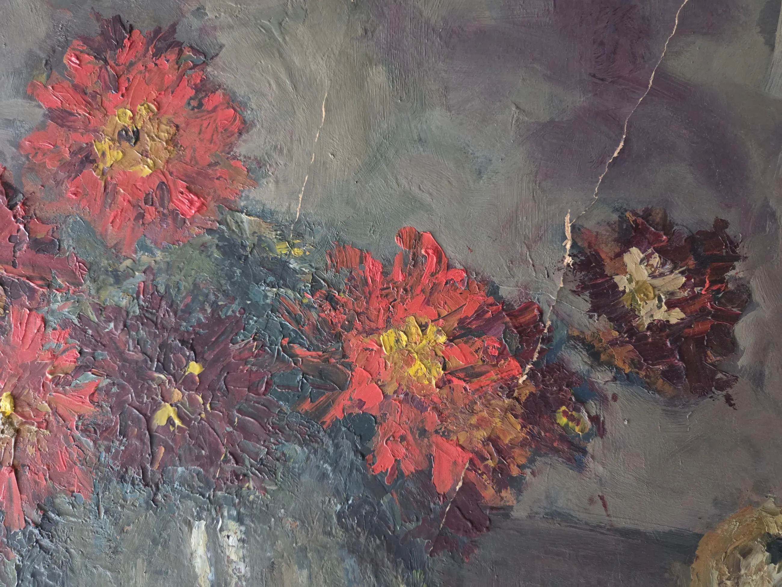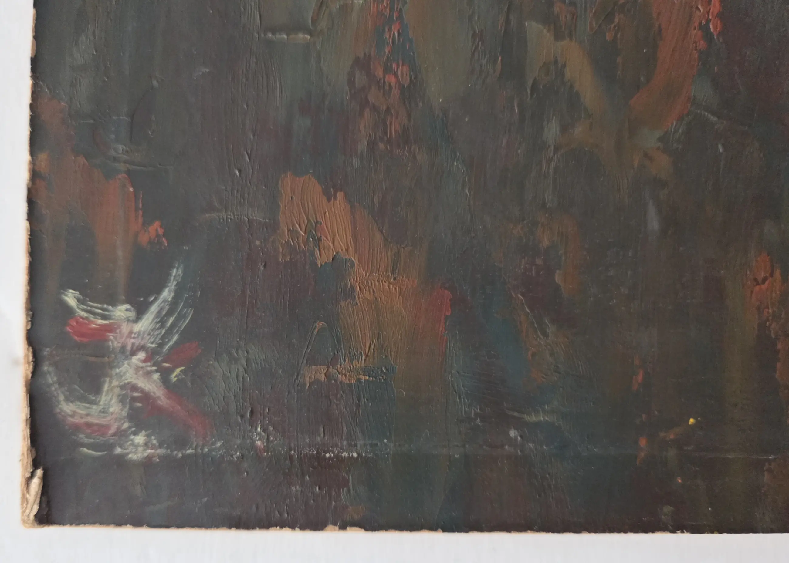 Kleurrijk werk. Gesigneerd met monogram linksonder. Goede sfeer. Barst in de verf op paar plekken. Zie foto's voor eigen oordeel kwaliteit. Vandaar ook bescheiden openingsprijs.