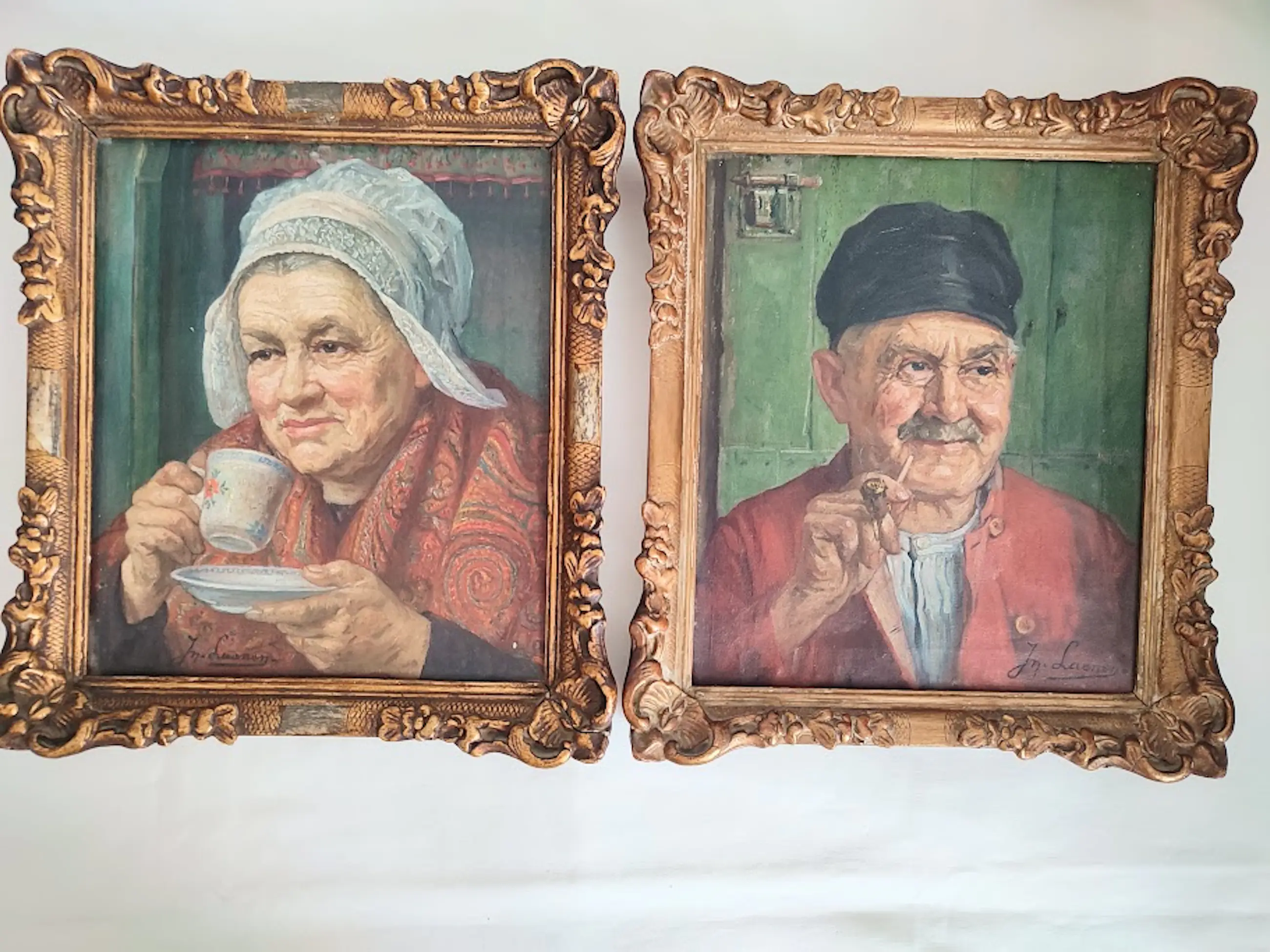 De schilderijen stellen een oudere man met pijp en een oudere vrouw met koffiekop voor, uitgewerkt in een warme, expressieve stijl die kenmerkend is voor de Vlaamse genreschilderkunst uit het midden van de 20e eeuw.