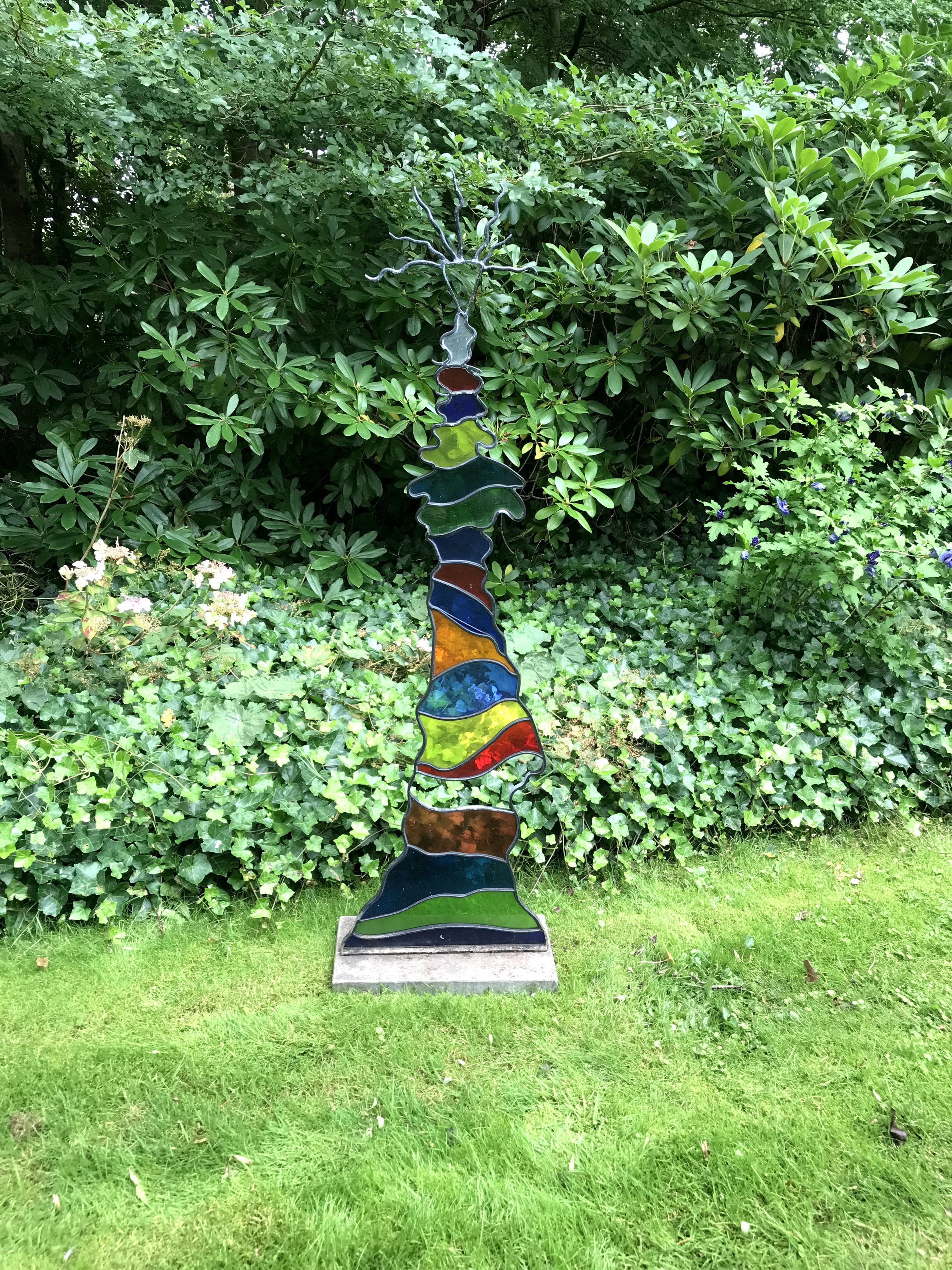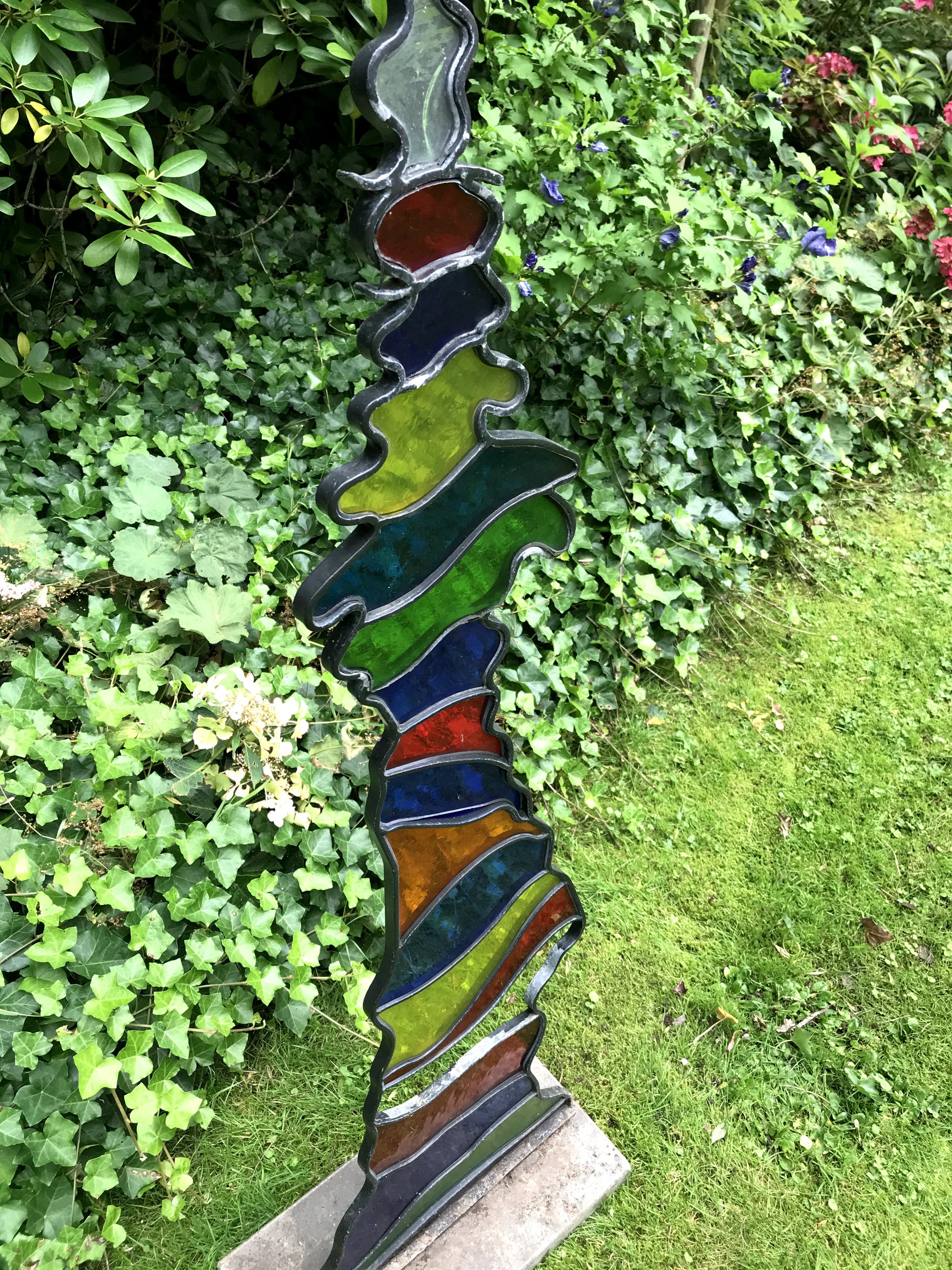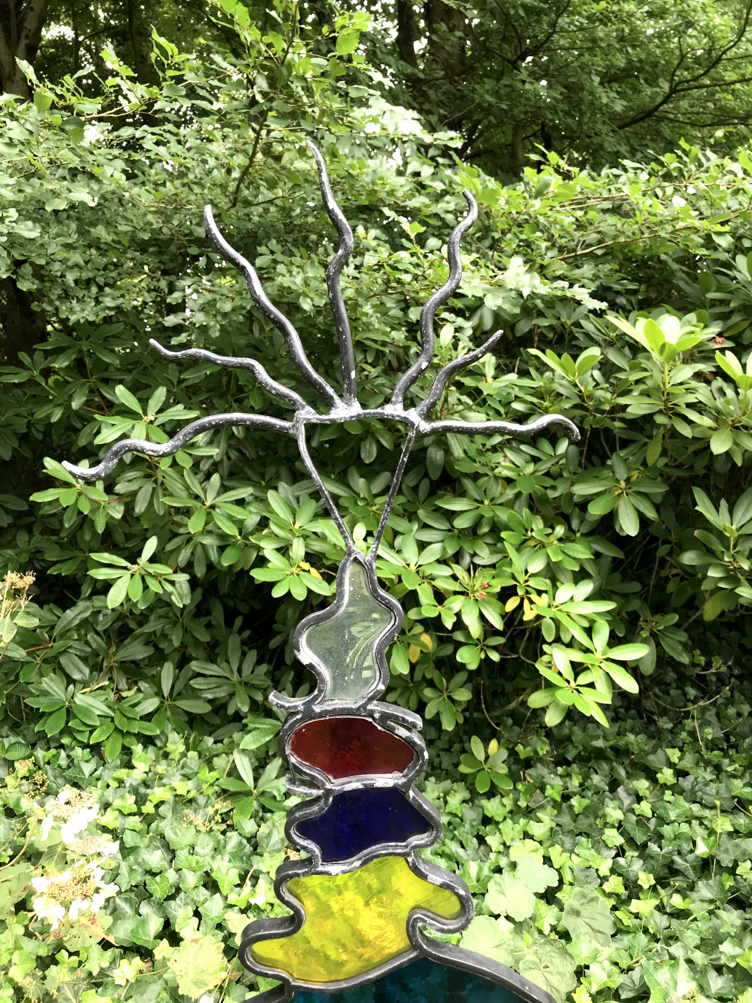 Prachtig hoog kunstwerk gekocht bij galerij Maya Wildevuur van de kunstenaar Jan Leenknegt. Dit werk bestaat uit een metalen frame met daarin een stuk of 18 vakjes met in elk vakje een kleur glas en daarboven een soort zon. Helaas mist in het 4 vakje van onder een glaasje. Een waar unica voor in de tuin.
