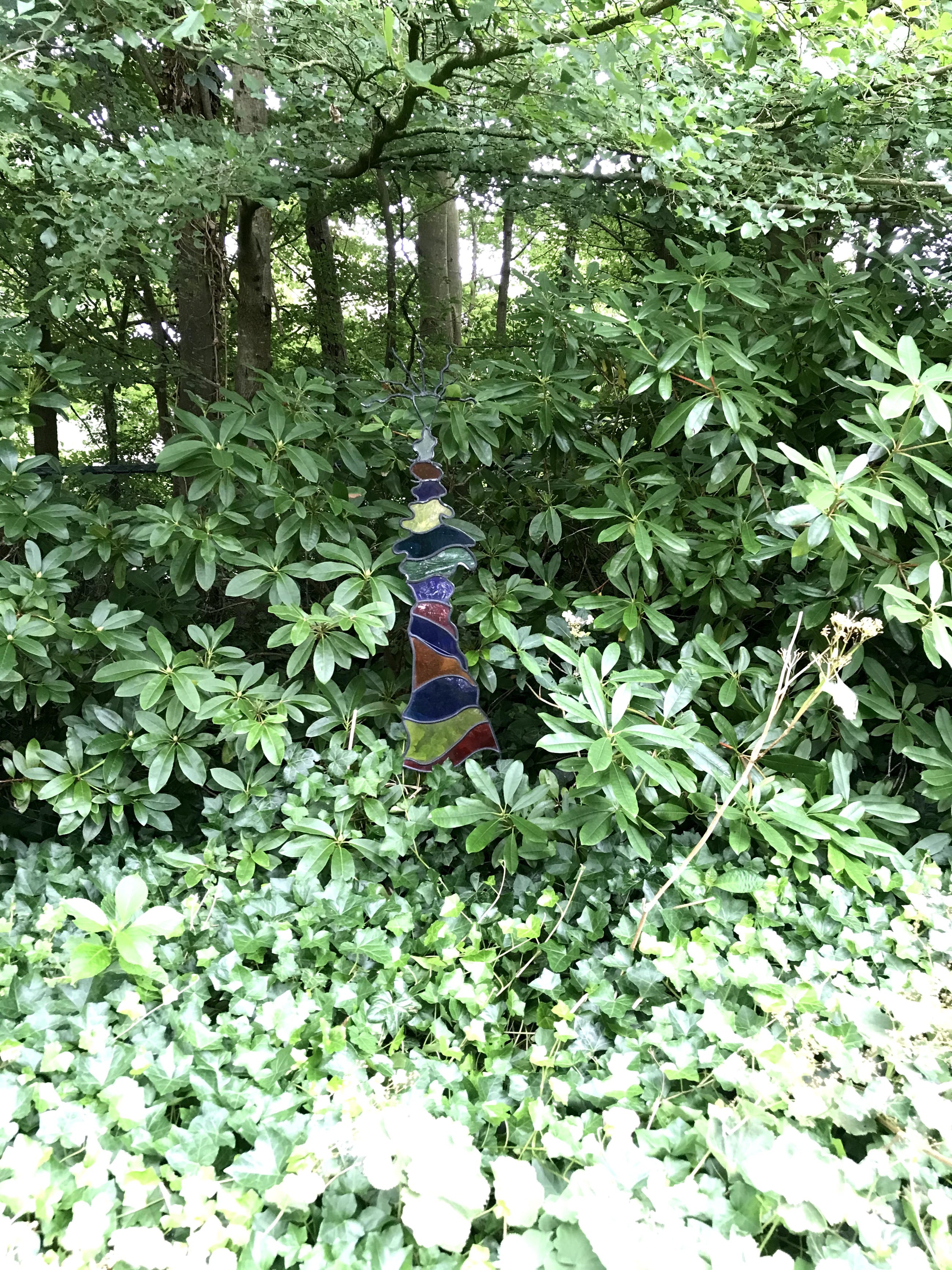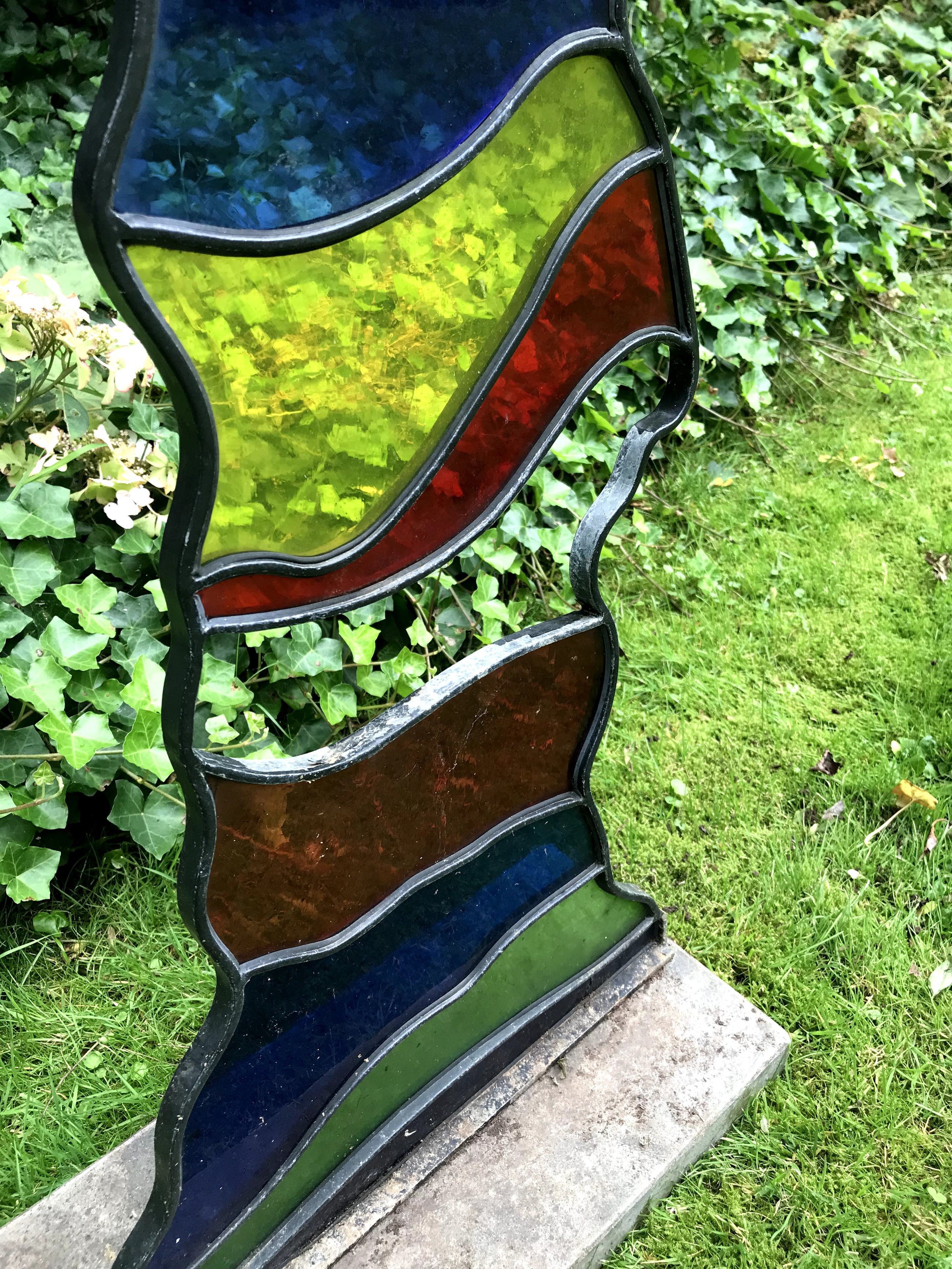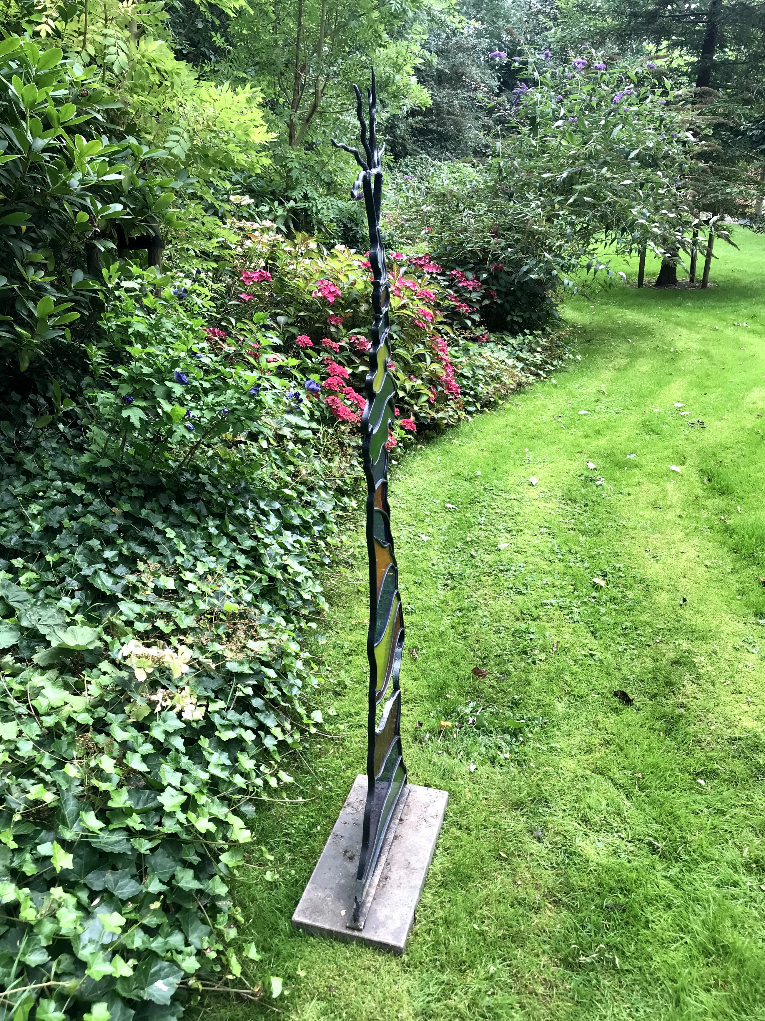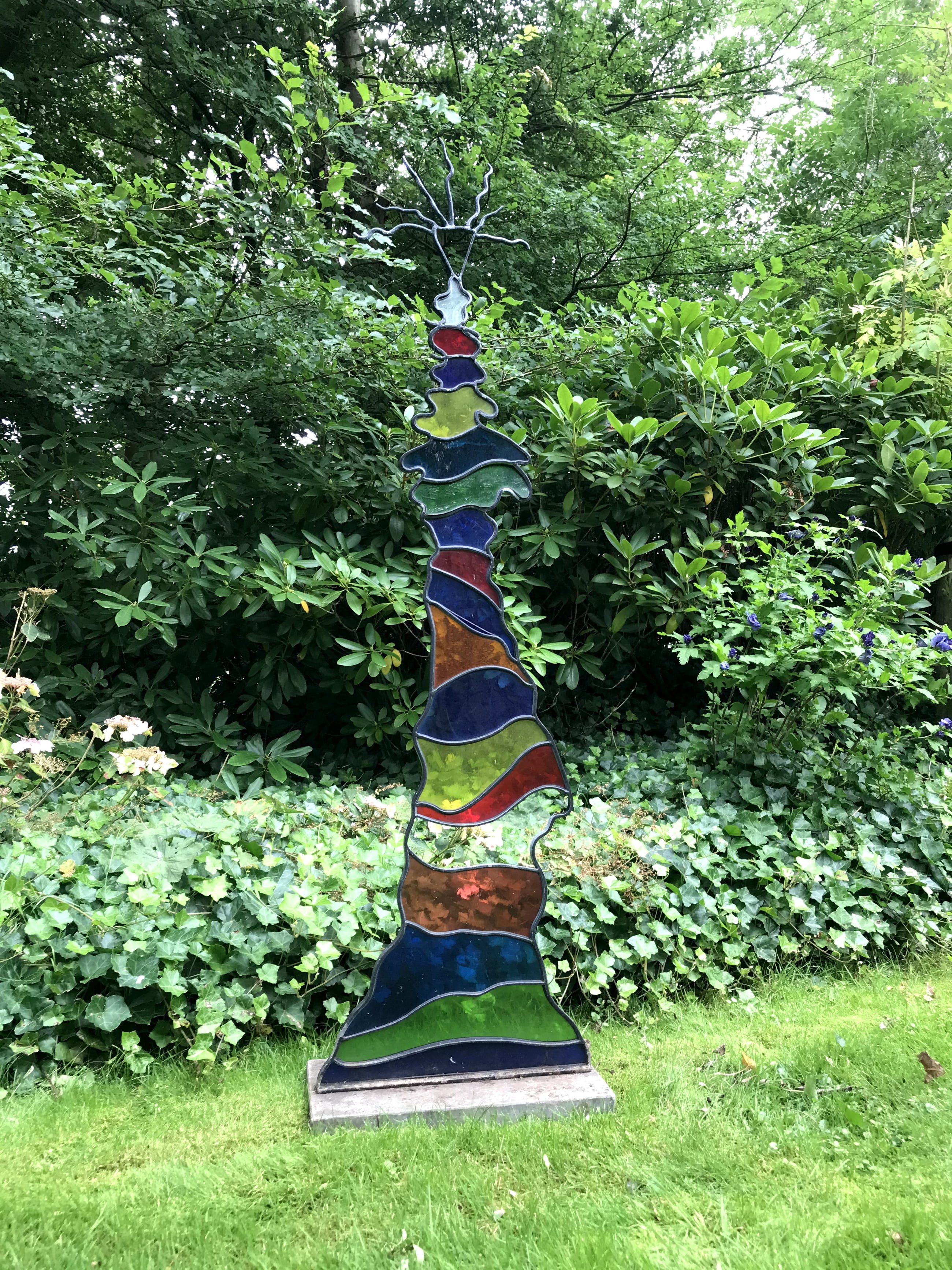 Prachtig hoog kunstwerk gekocht bij galerij Maya Wildevuur van de kunstenaar Jan Leenknegt. Dit werk bestaat uit een metalen frame met daarin een stuk of 18 vakjes met in elk vakje een kleur glas en daarboven een soort zon. Helaas mist in het 4 vakje van onder een glaasje. Een waar unica voor in de tuin.