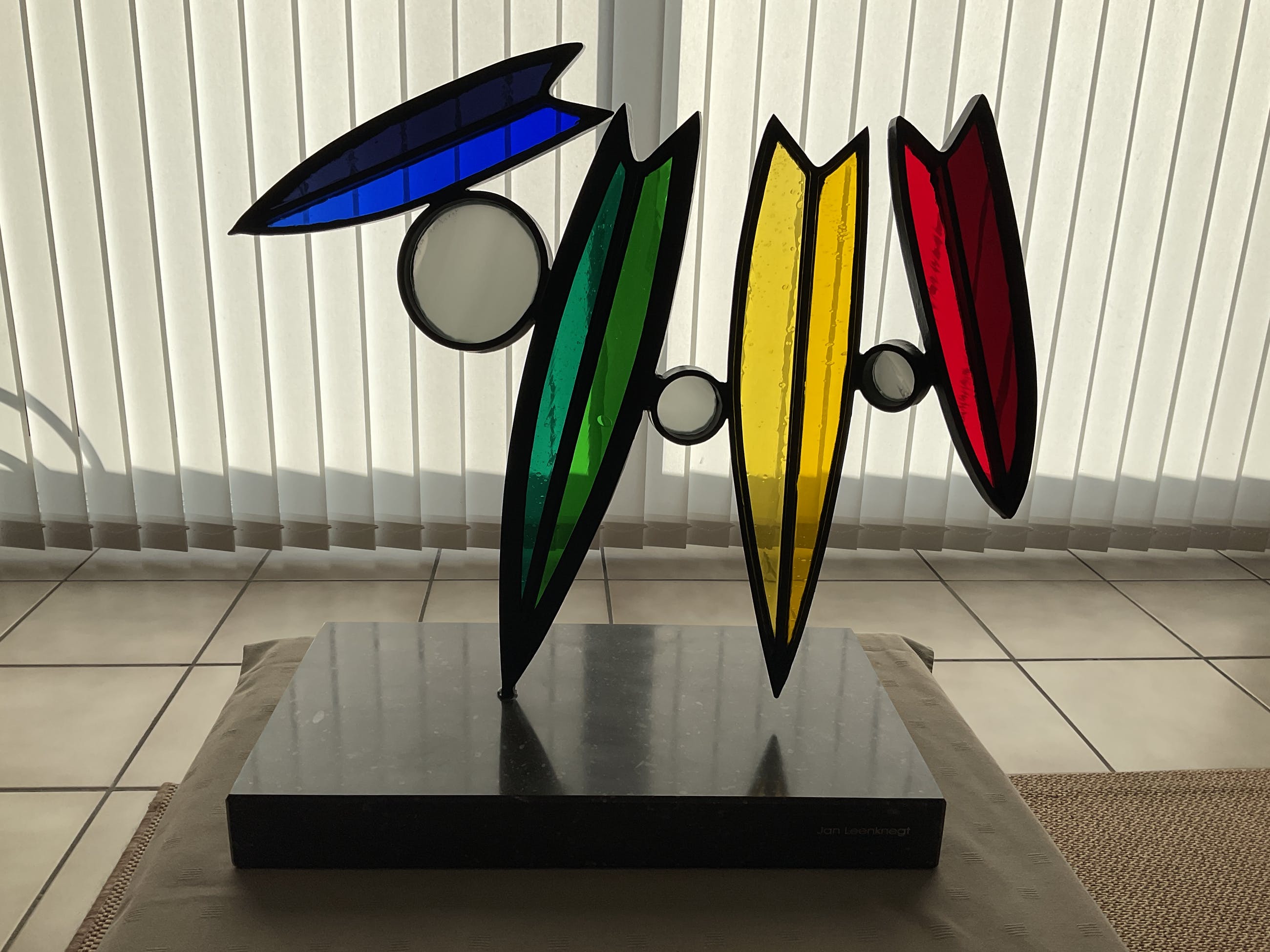 Modern werk in mondgeblazen glas door de Belgische glaskunstenaar Jan Leenknegt (°1950) Hij probeert de schaduw van het leven met licht te bestrijden want volgens de kunstenaar is dit zijn kunst want zijn schaduw is kleur. Hiermee wil hij een vrolijke noot brengen, dynamiek en vernieuwing. De galerij van Jan Leenknegt situeert zich in de Hoogpoort 33 te Gent, Hijzelf woont en werkt in Ronse. Naast de verschillende academies waar hij les volgde is de leerschool die hem het méest heeft gevormd het atelier van zijn vader, waar hij werkte aan de realisatie van glasramen voor kerken, openbare gebouwen en particulieren. Nadat het glas gevormd werd wordt het in smeedwerk ingepast. Dit werk komt met een zware marmer sokkel. Het is in het glas gesigneerd door de kunstenaar. Het kan zowel binnen als buiten geplaatst worden.