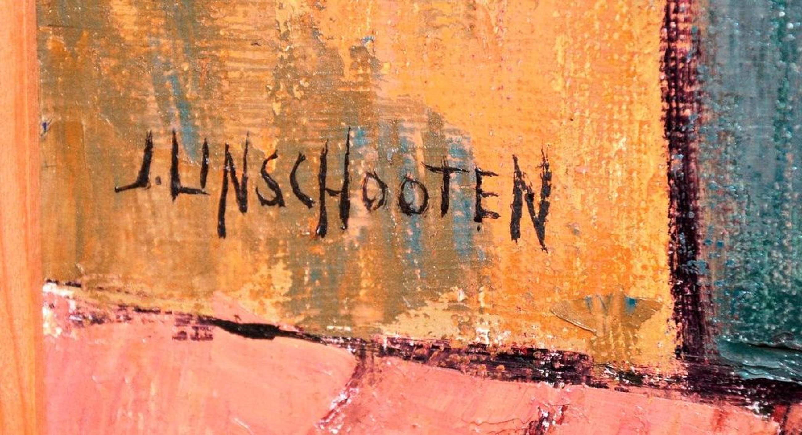Olieverf schilderij van Jan (Johannes) Linschooten op hardboard.