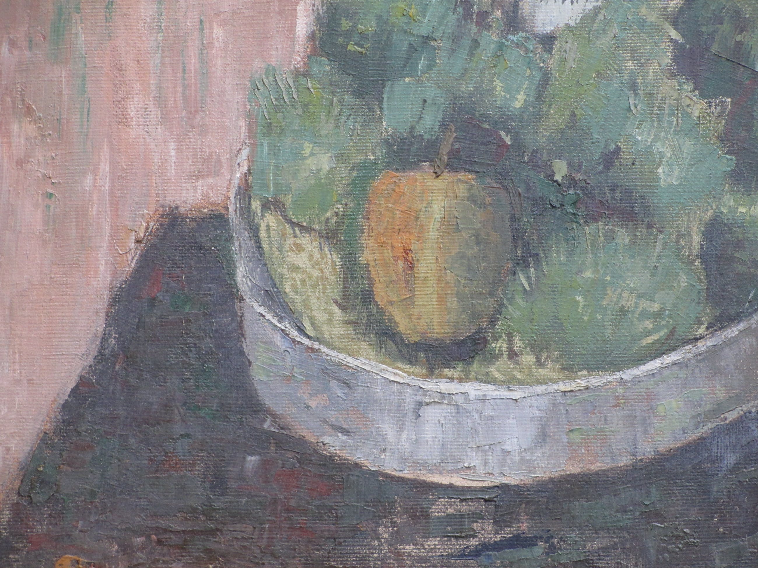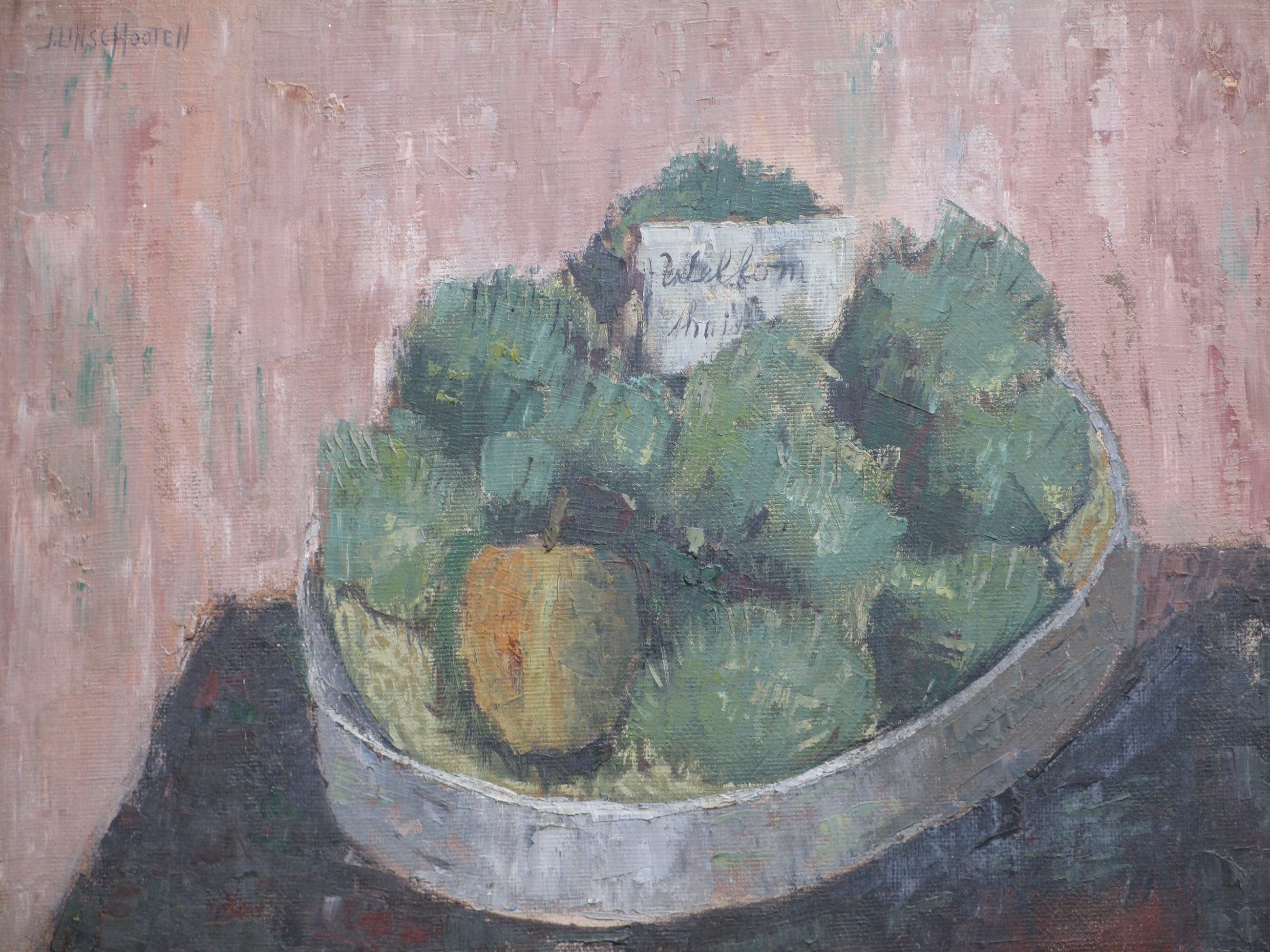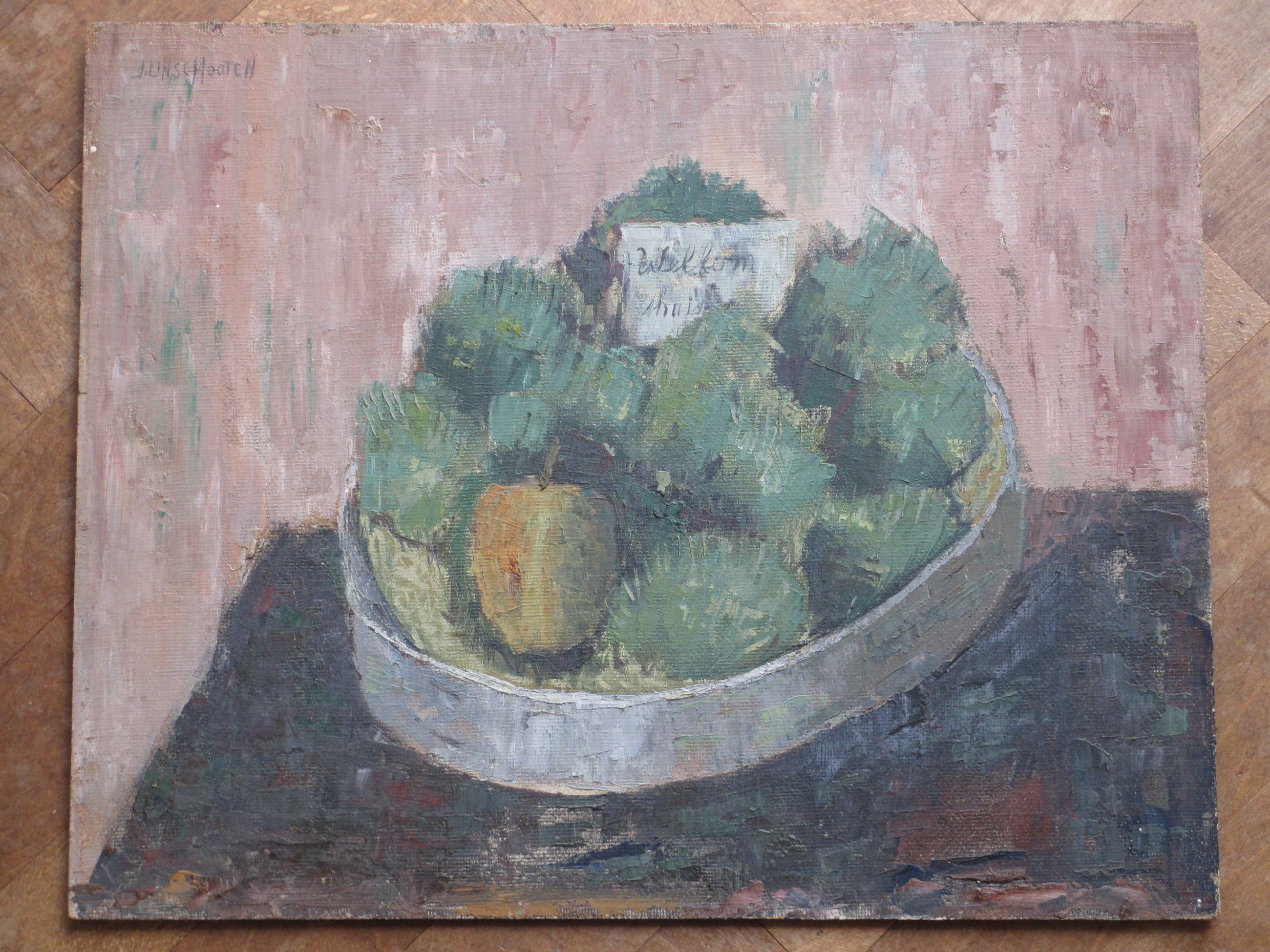 Olieverf op board door Jan ('Joop') Linschooten. Voorstelling van een schaal met fruit op tafel. Kaartje in schaal met de woorden: 'Welkom Thuis' Gesigneerd l.b.: 'J. Linschooten' Niet gelijst, beeldmaat 40x50 Authenticiteit volledig gegarandeerd