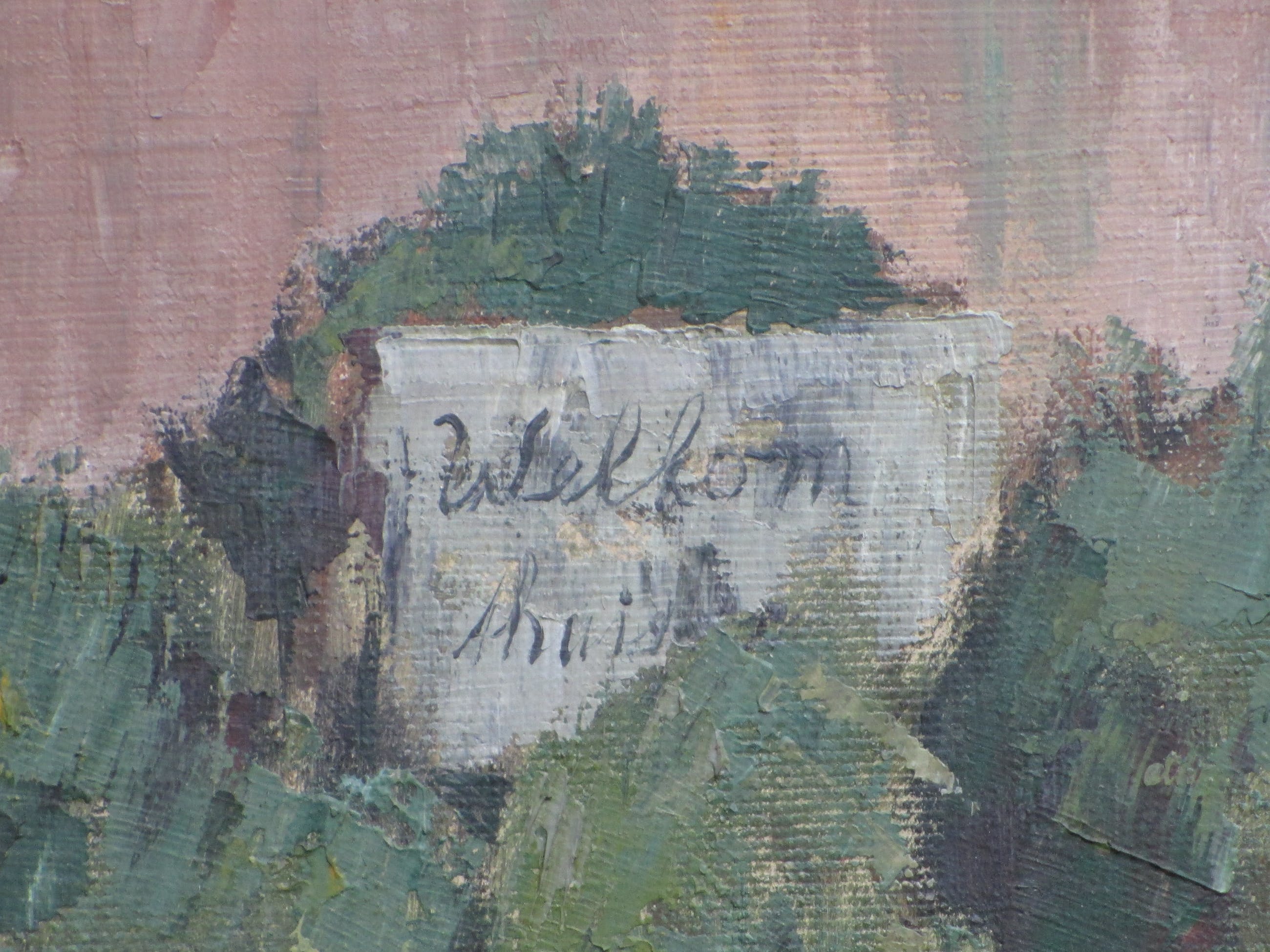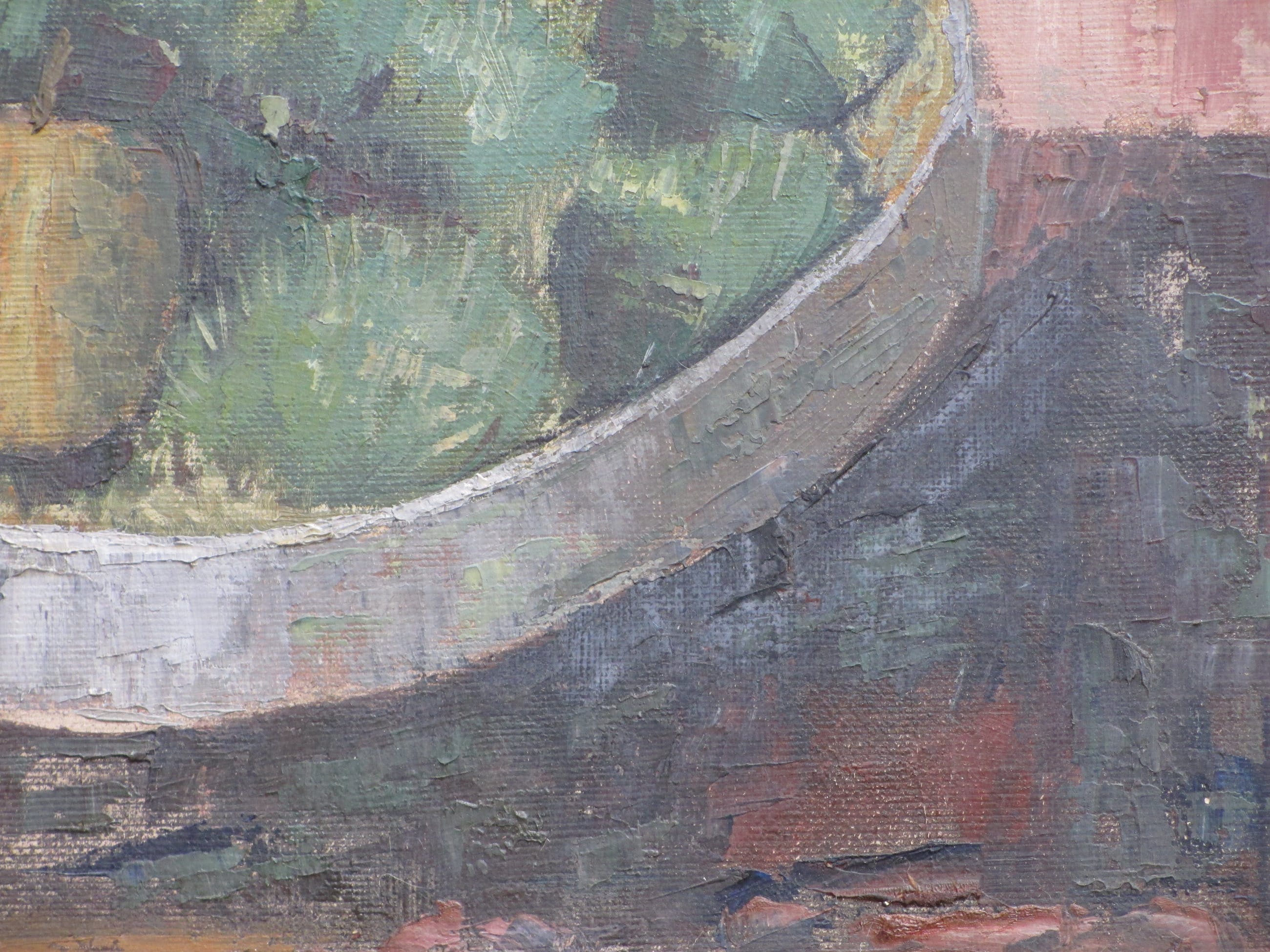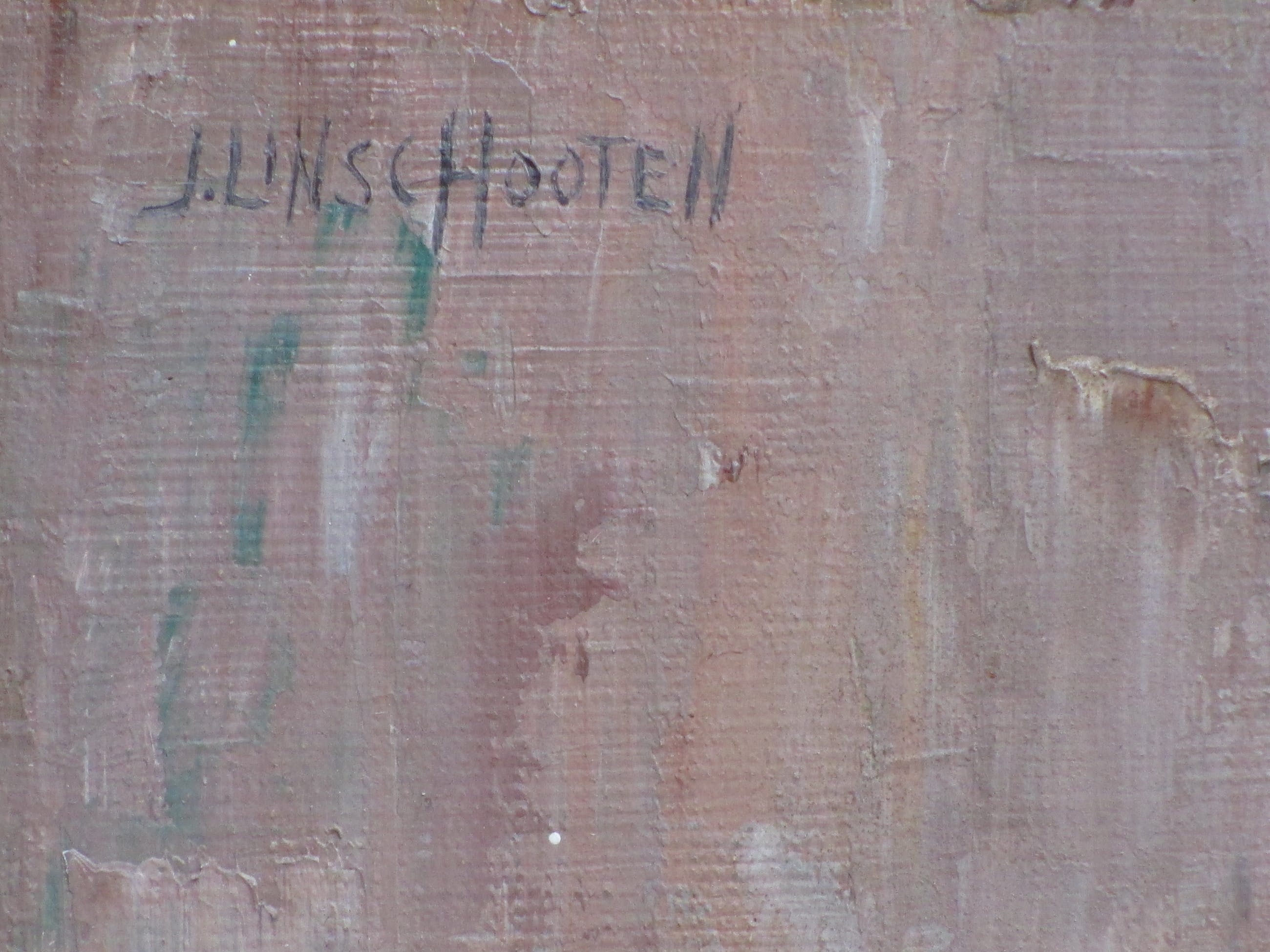 Olieverf op board door Jan ('Joop') Linschooten. Voorstelling van een schaal met fruit op tafel. Kaartje in schaal met de woorden: 'Welkom Thuis' Gesigneerd l.b.: 'J. Linschooten' Niet gelijst, beeldmaat 40x50 Authenticiteit volledig gegarandeerd