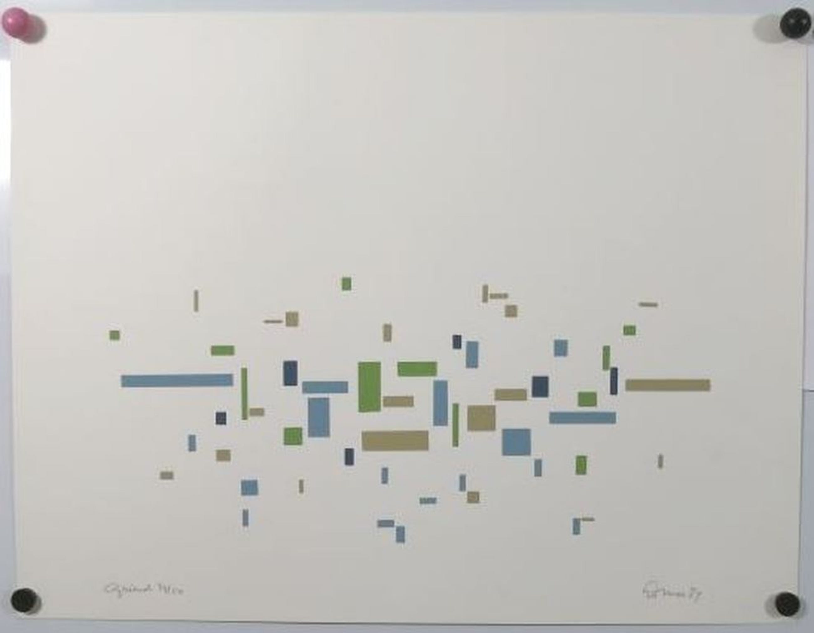 Mooie zeefdruk van Jan Loman uit de serie Wadden. Bij het maken van deze werken heeft de kunstenaar zich laten inspireren door het landschap van de Waddeneilanden wat enkele prachtige abstracte composities heeft opgeleverd.