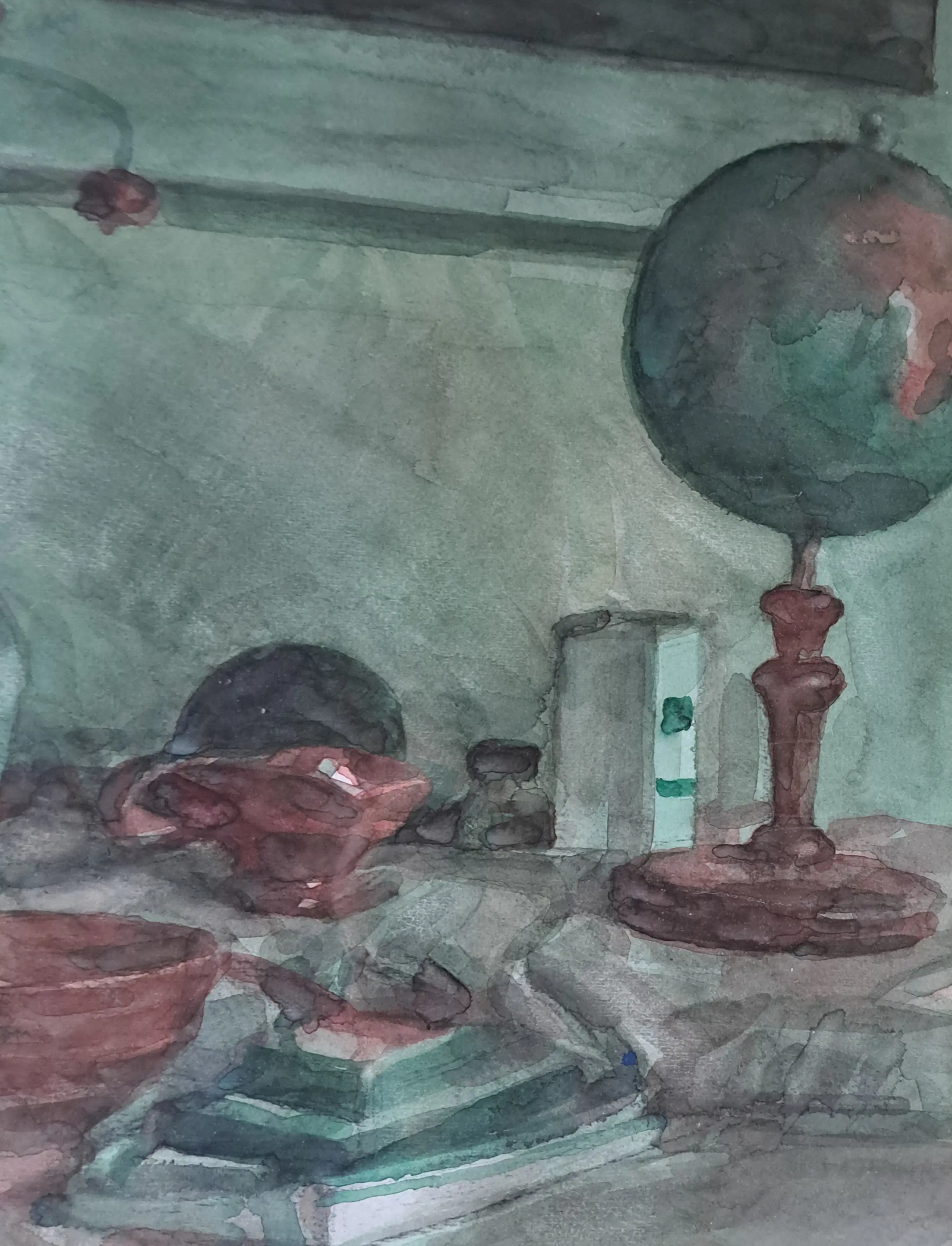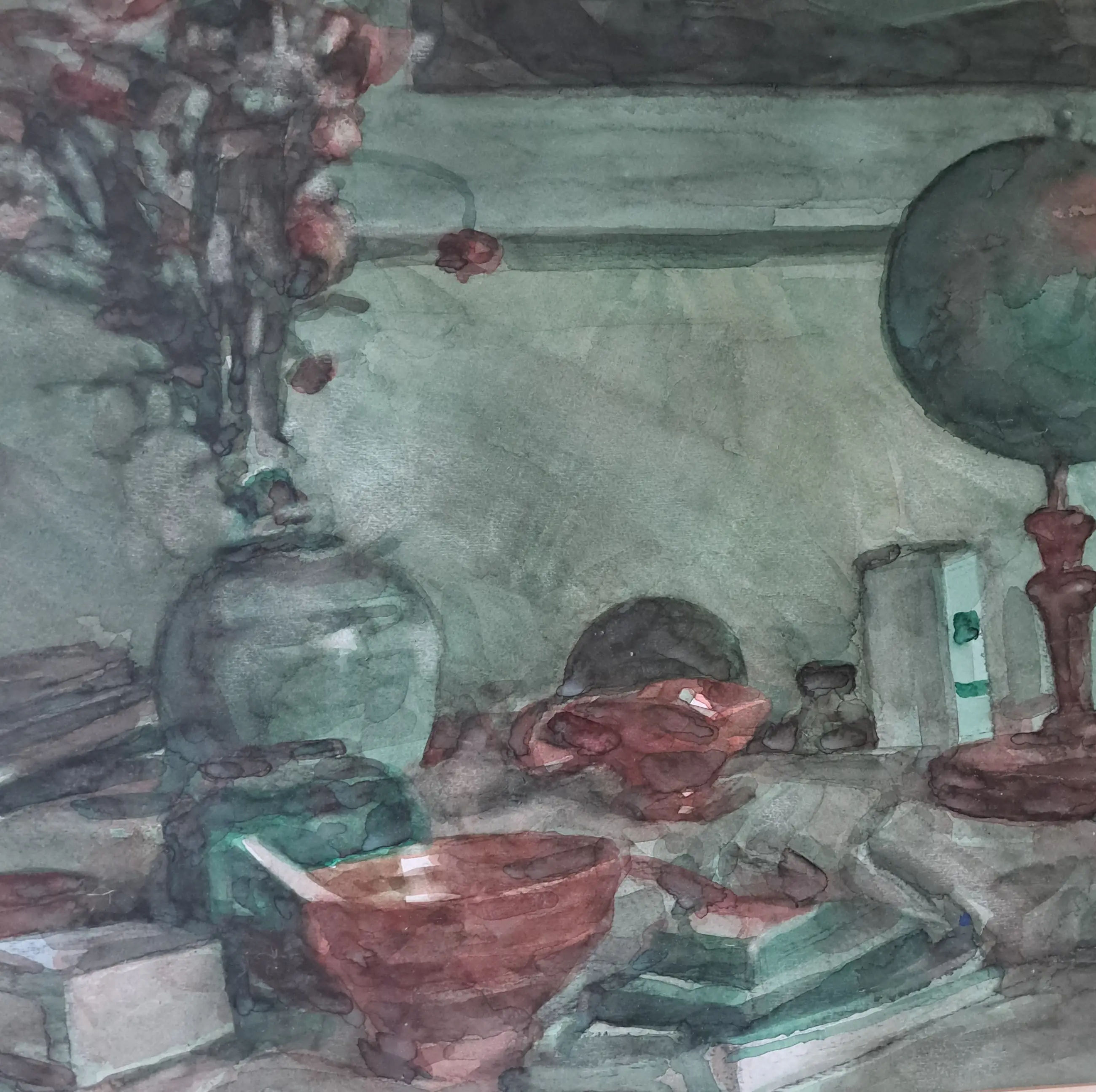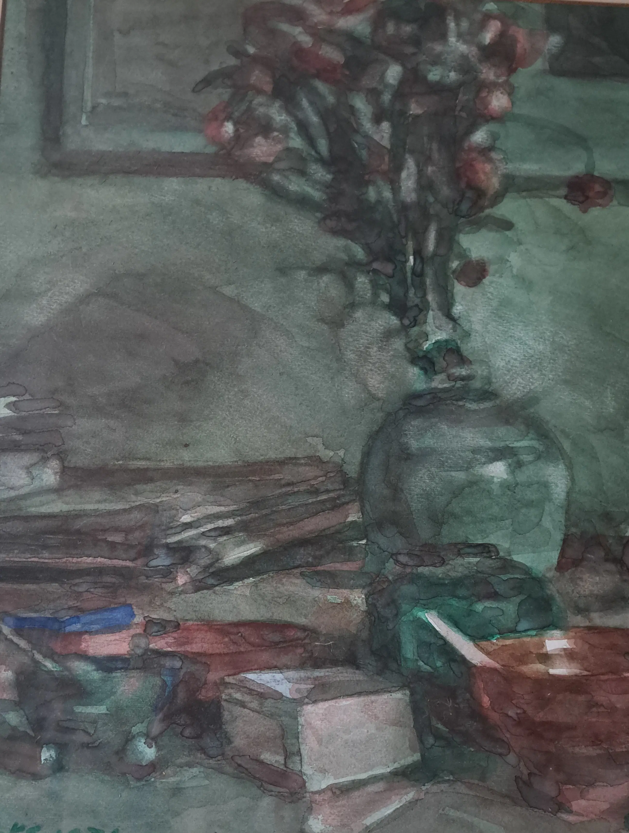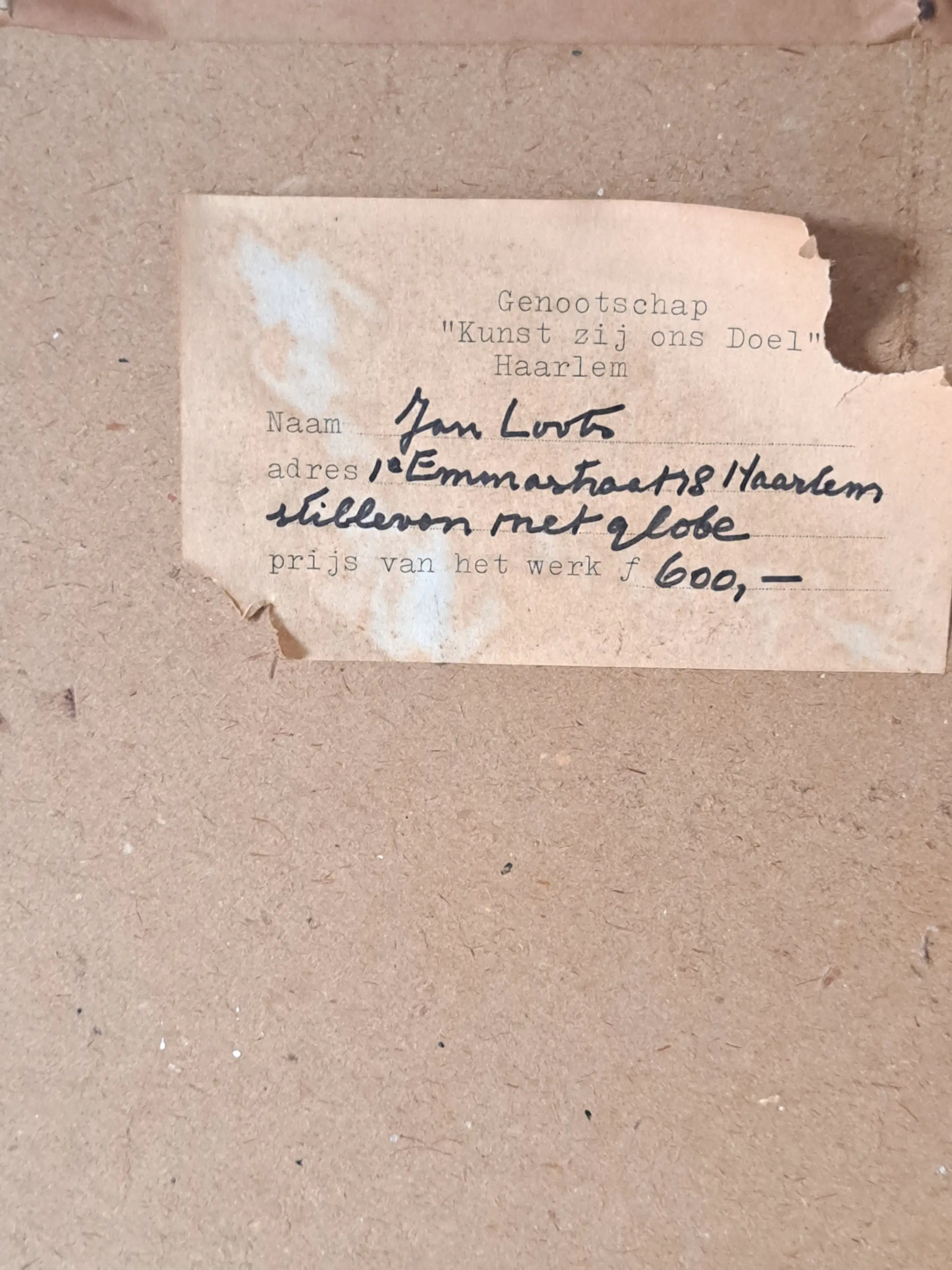 Stilleven in mooie grijsgroene tinten, met globe en bloemenvaas met pioenrozen en boeken en mappen op een bureau. Los geschilderd met licht paars-roze accenten in de bloemen en potjes. De lijst is nog netjes, maar is niet meer gerestaureerd sinds het inlijsten.