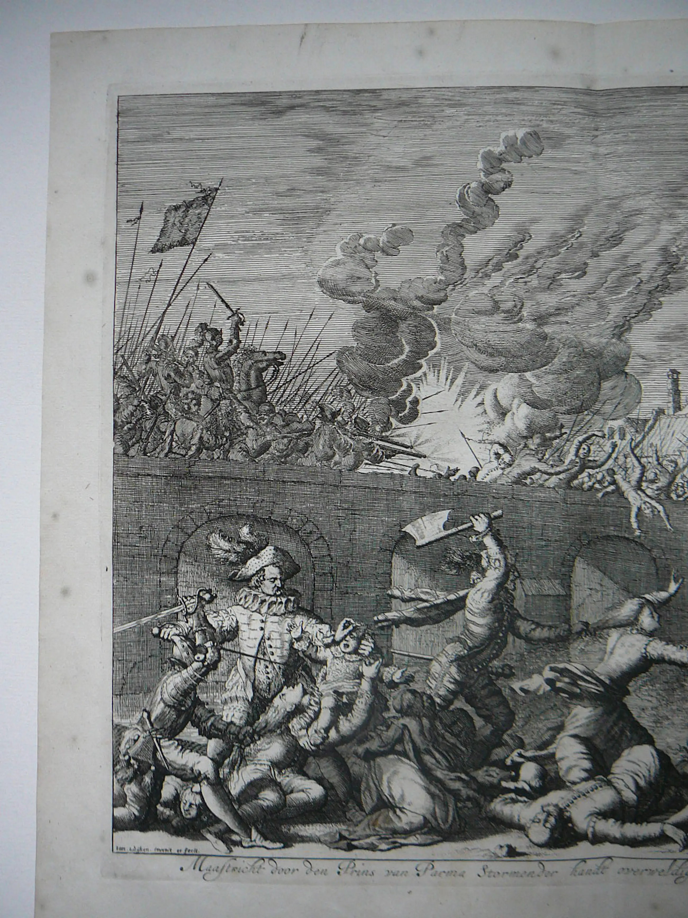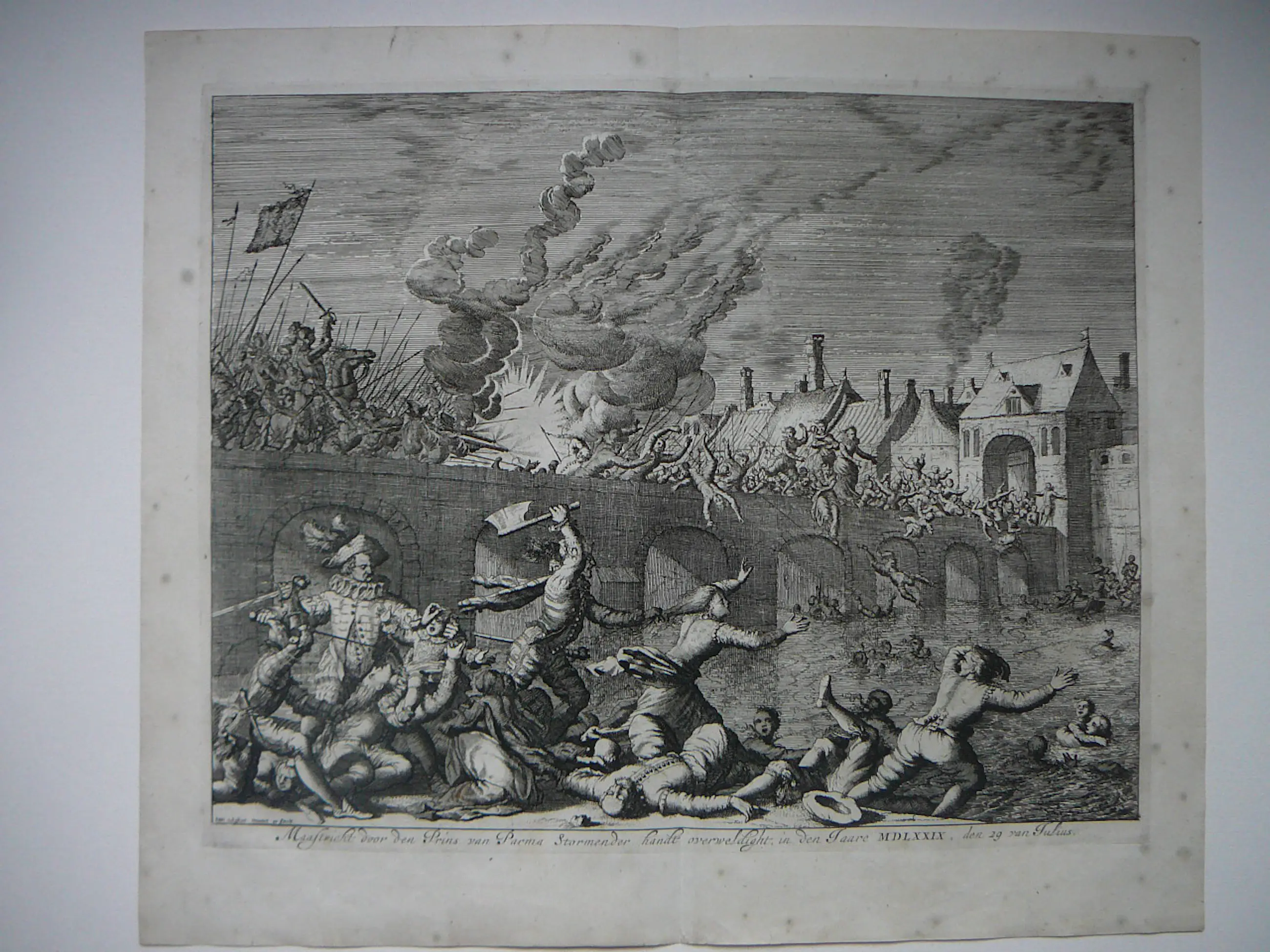 Mooie gravure van het beleg van Maastricht Maastricht door den Prins van Parma Stormender handt overweldight in den jare MDLXXIX den 29 van Julius Afm Papier 38,8 x 33 cm