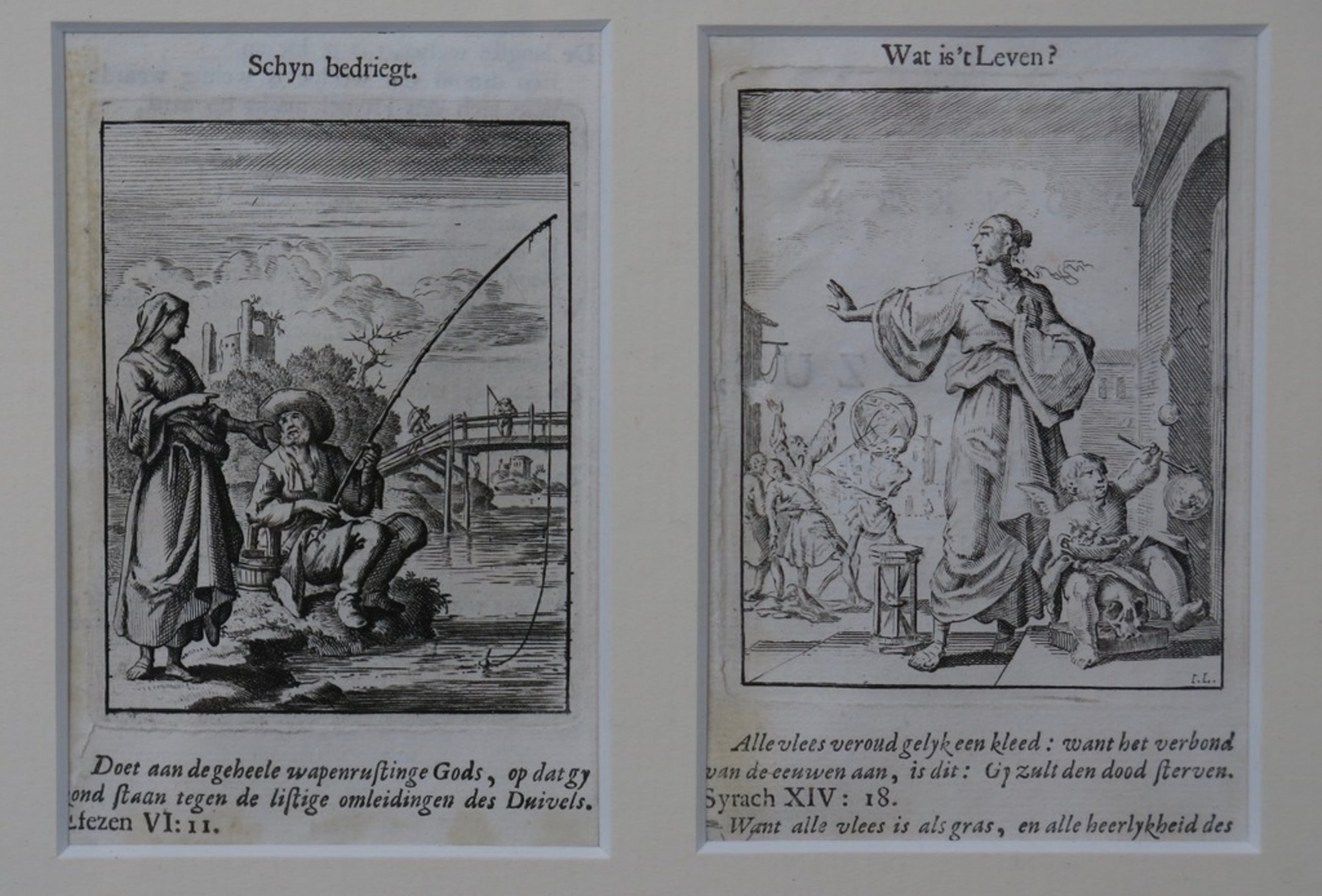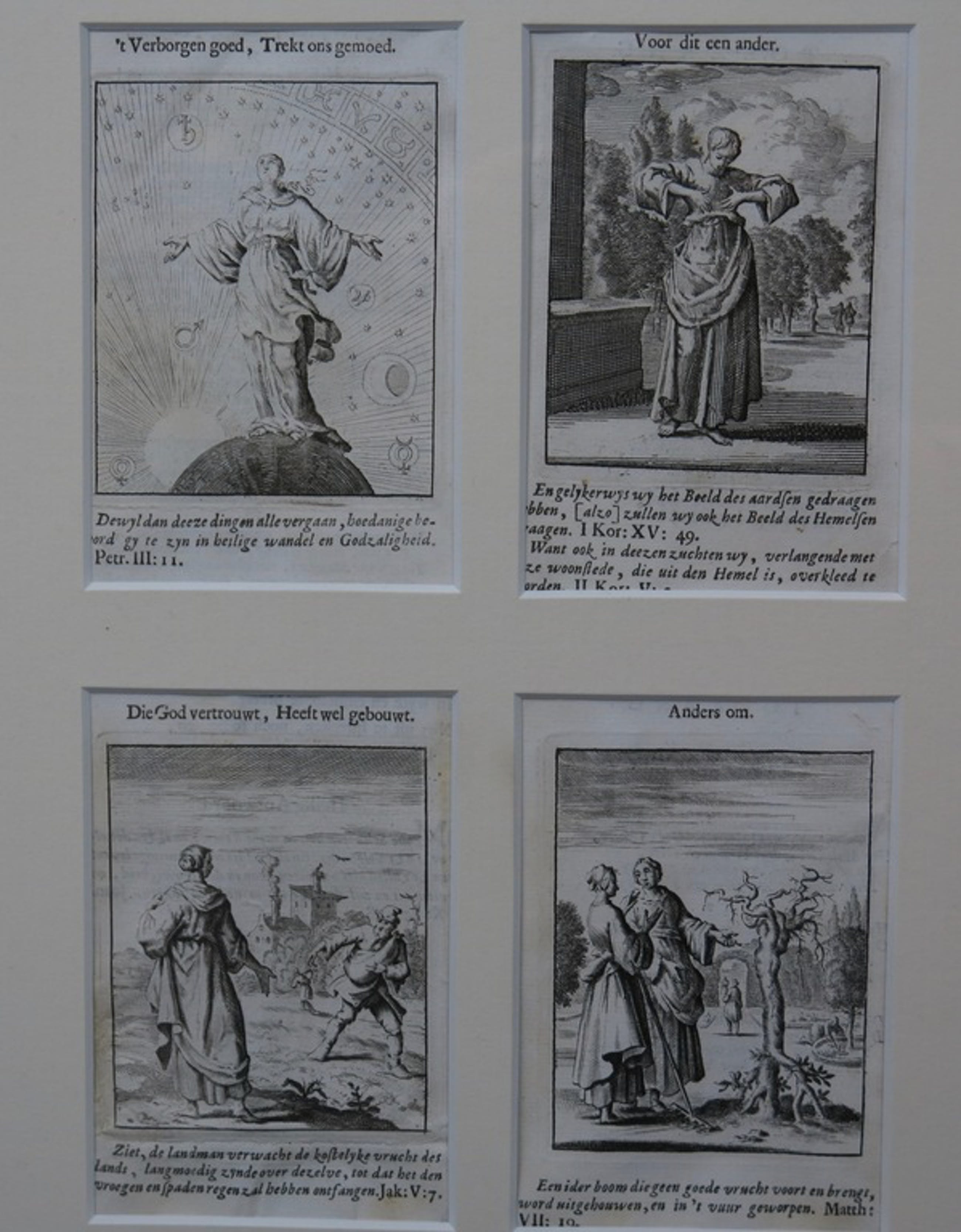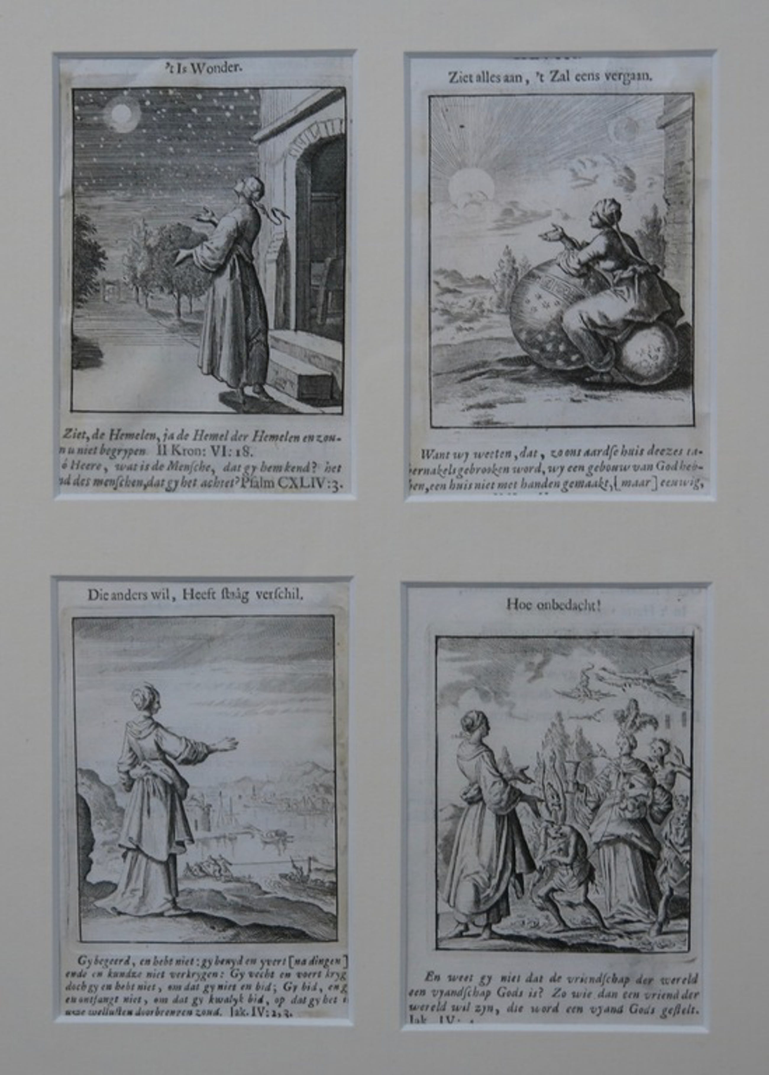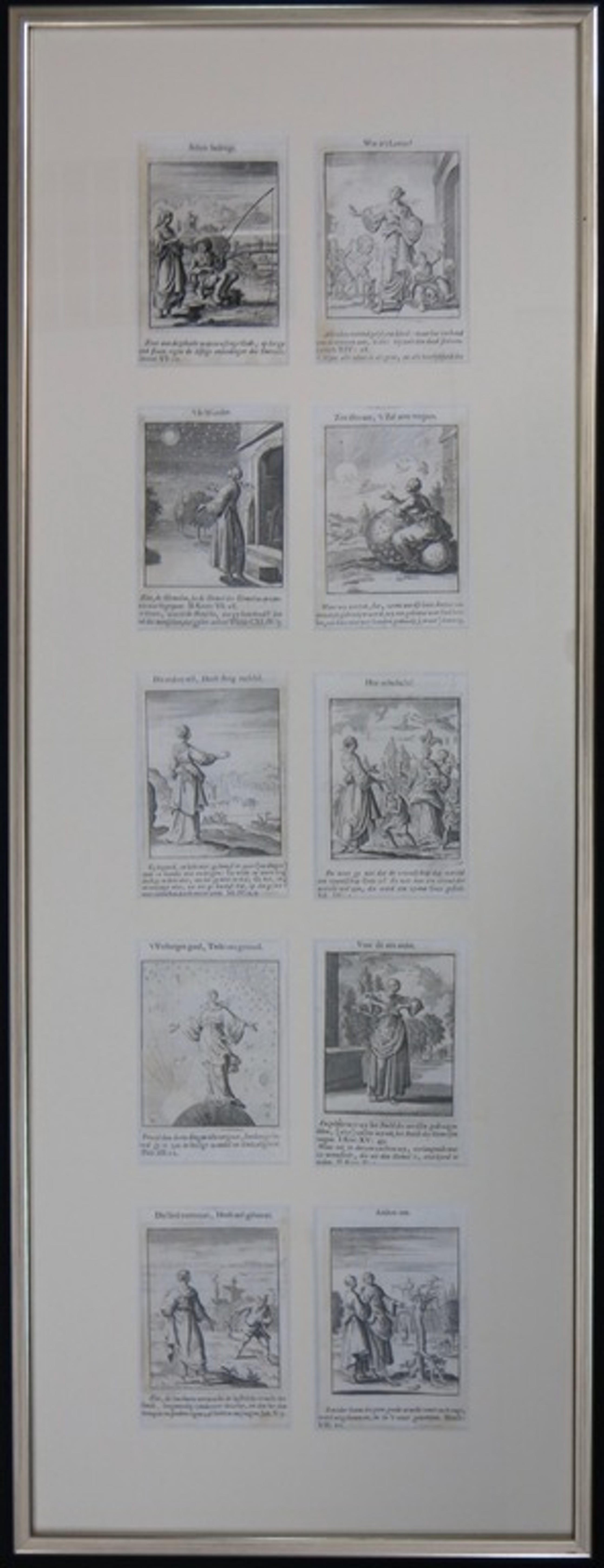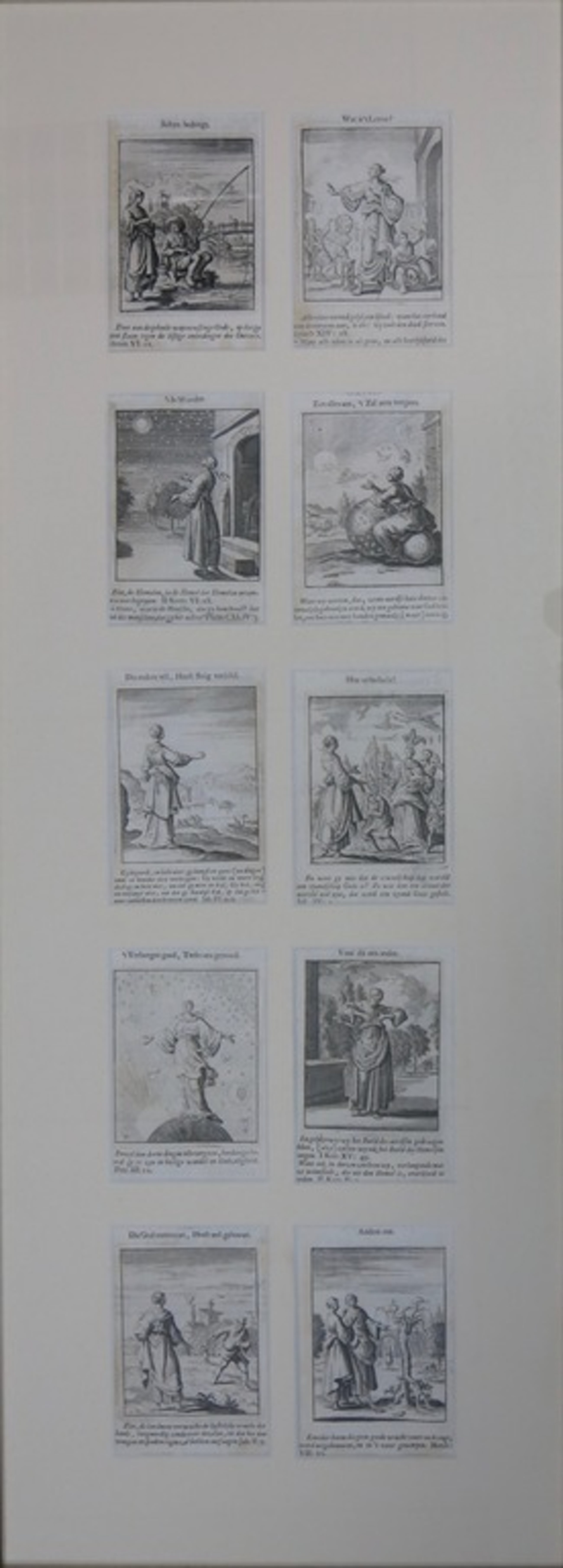 Tien mooi ingelijste losse prentjes uit Vonken der Liefde Jezus, van Jan Luyken. De prentjes zijn gegarandeerd vam de hand van Jan Luyken, onbekend is welke druk het betreft. Het boek is oorspronkelijk uitgebracht in 1687, en tot begin 18e eeuw herdrukt.