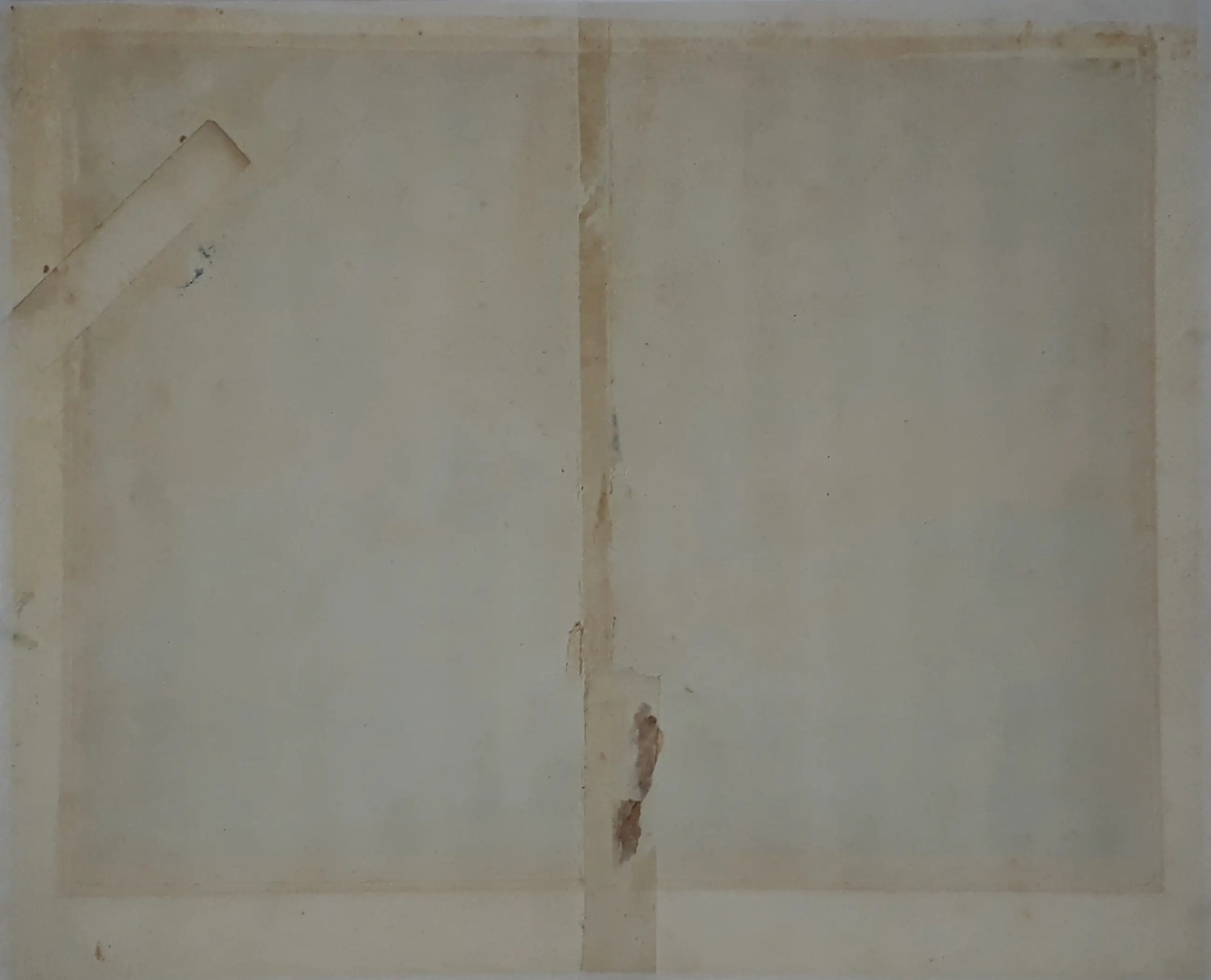 Conditie: Reparatie. Rechtsboven beschadigd. Resten van vroegere inlijsting. Mooi, zacht gekleurd.