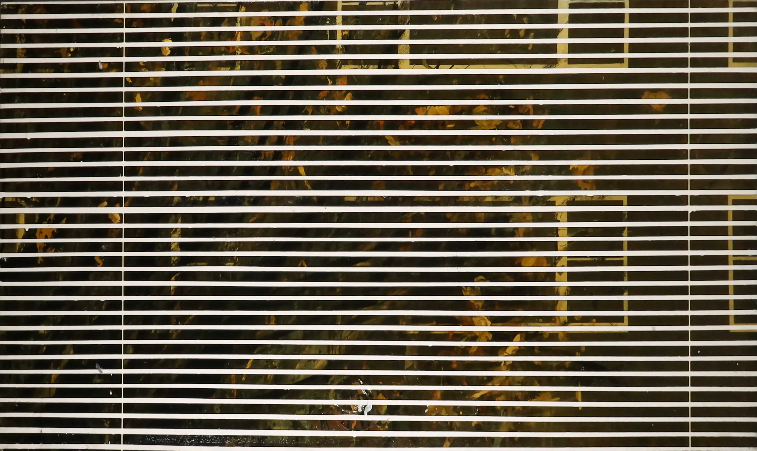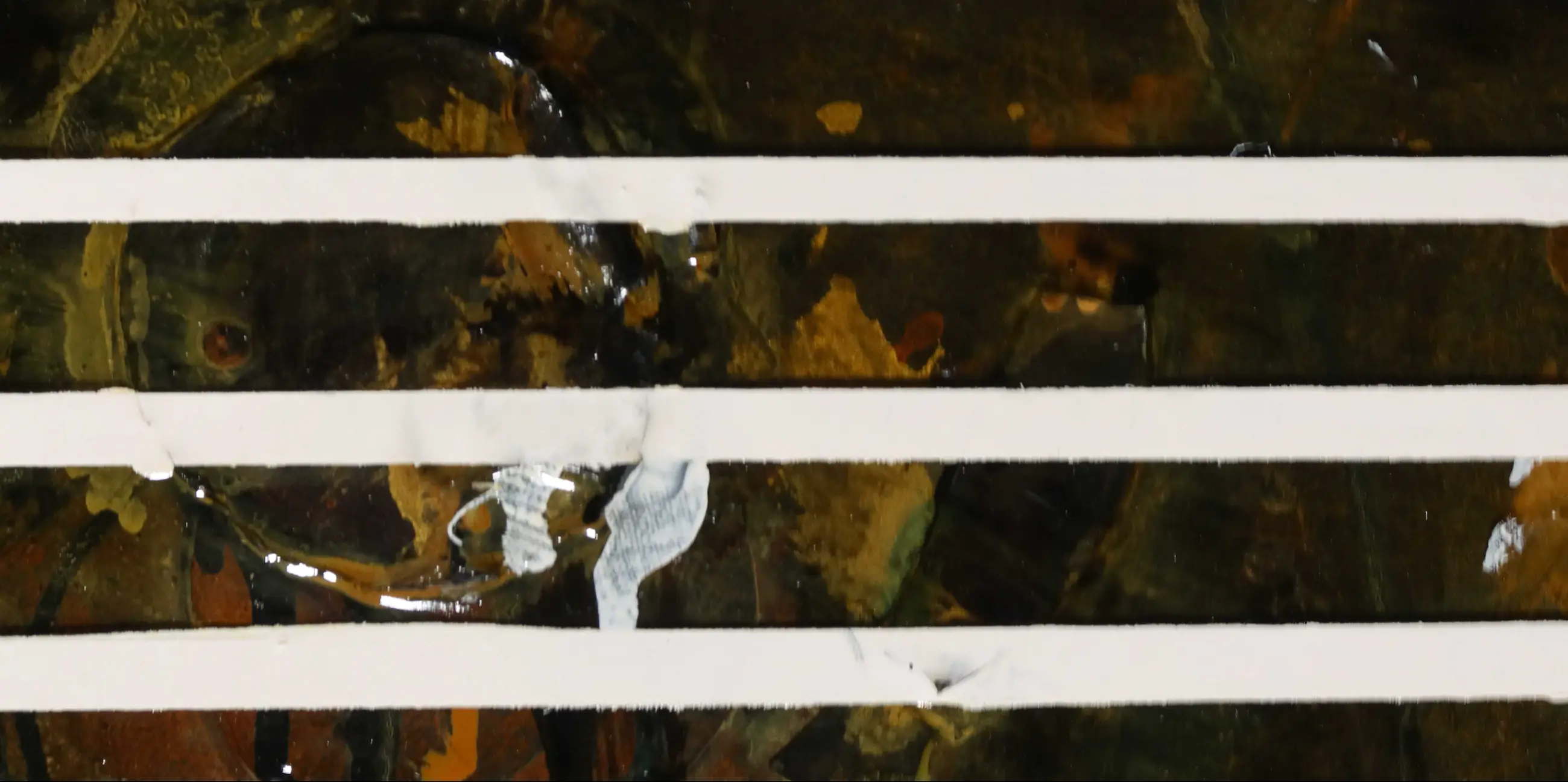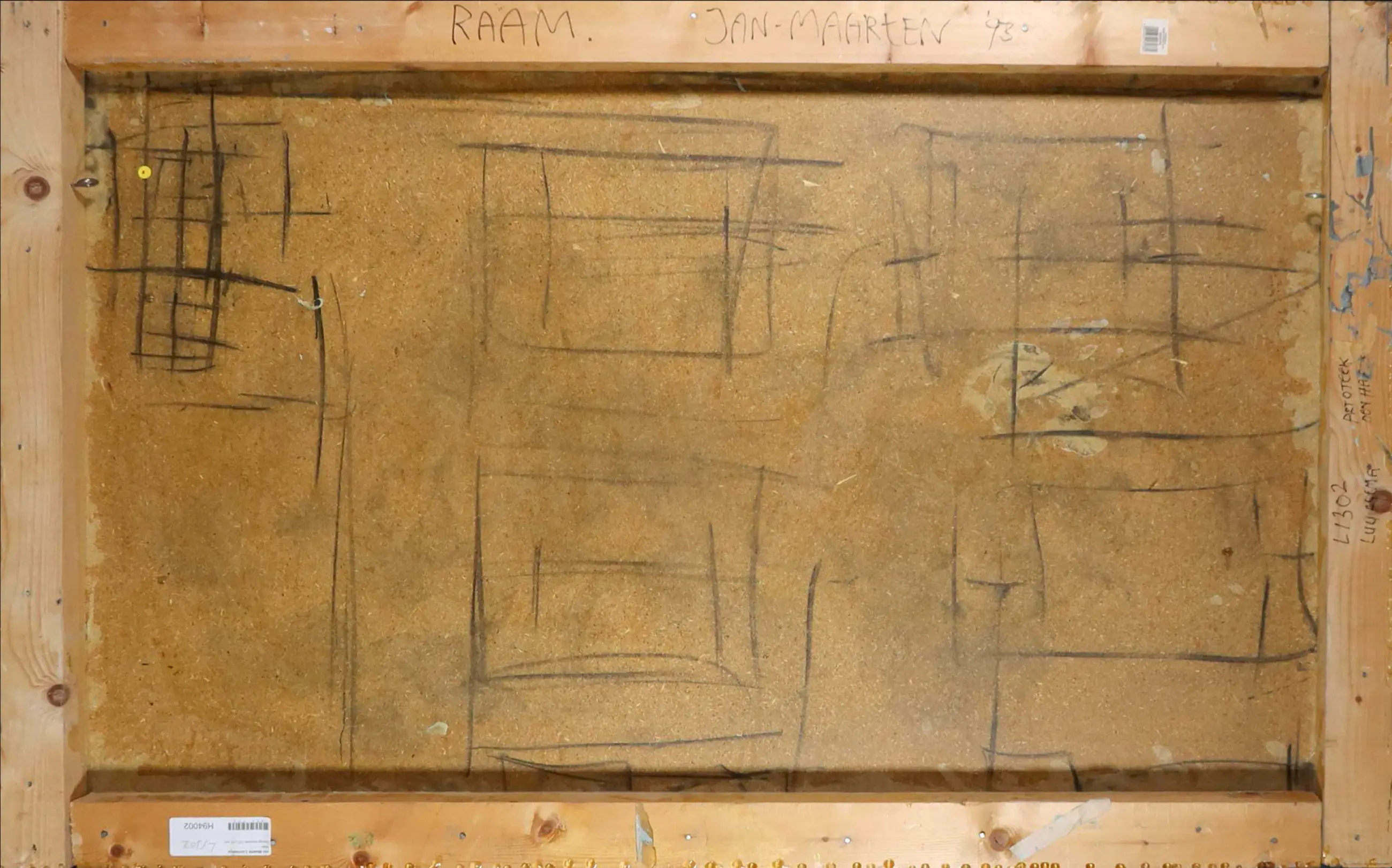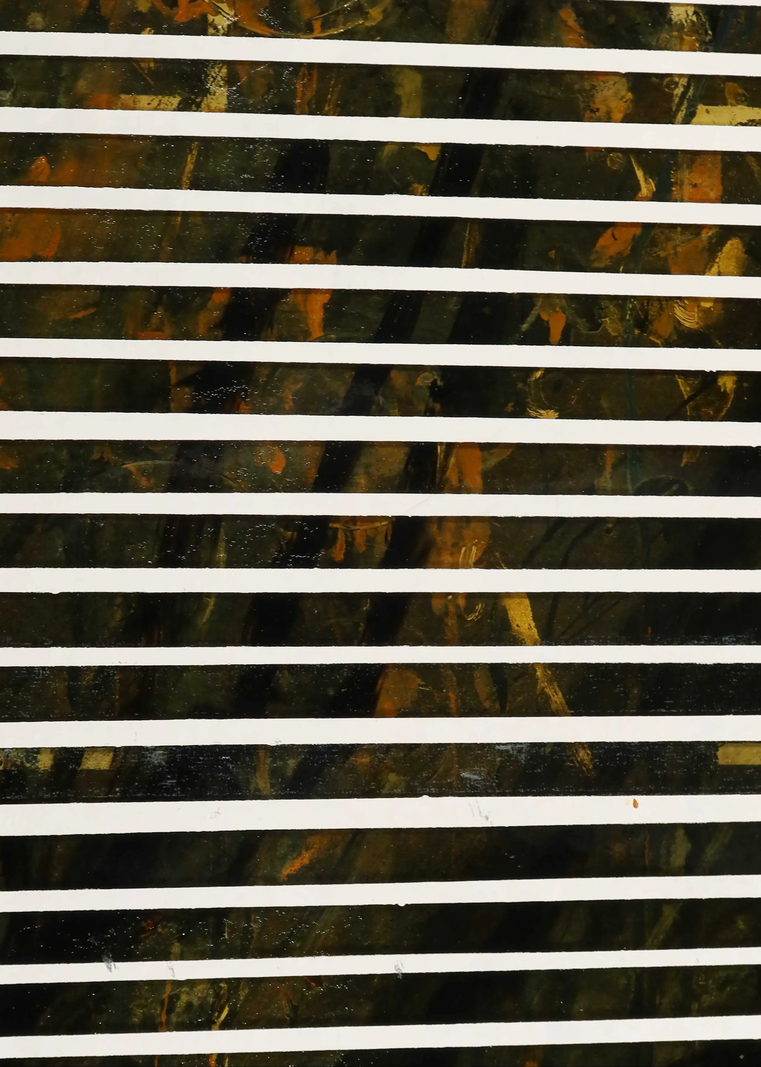 | Het werk heeft wat oppervlakte schade, zoals ook op de detailfoto's is te zien. Uit het oog springend is een onregelmatigheid aan de onderzijde van de compositie, onduidelijk of dit de intentie van de kunstenaar is geweest. Er lijkt in ieder geval overheen geschilderd. | |