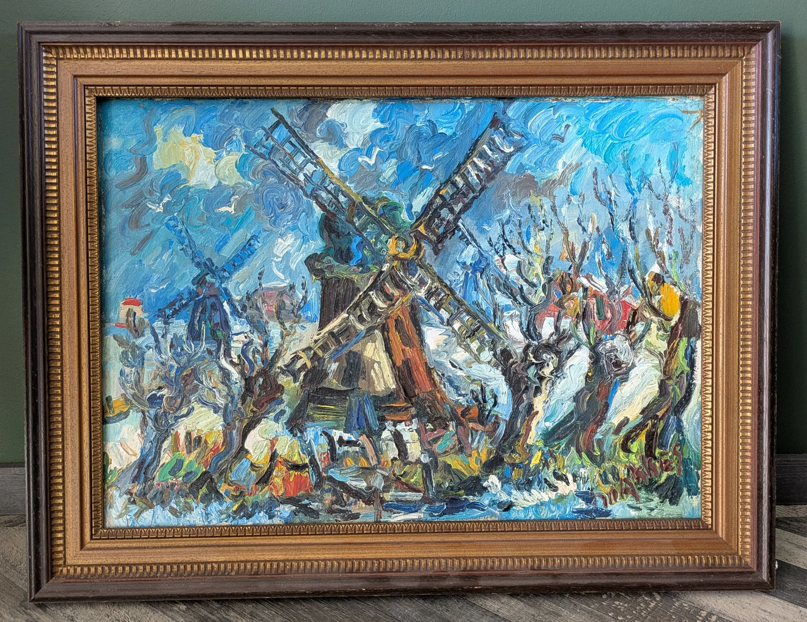 Jan Makkes (20e eeuw) – Windmolen in expressief landschap Origineel schilderij – olieverf op doek Afmetingen doek: ca. 50 x 70 cm Ingelijst: ca. 65 x 85 cm Gesigneerd rechtsonder: “J. Makkes” Krachtige penseelvoering en levendige kleuren in post-impressionistische stijl Klassiek Hollands landschap met windmolen en knotwilgen In originele houten lijst Herkomst: particuliere verzameling Conditie: zeer goed, klaar om op te hangen