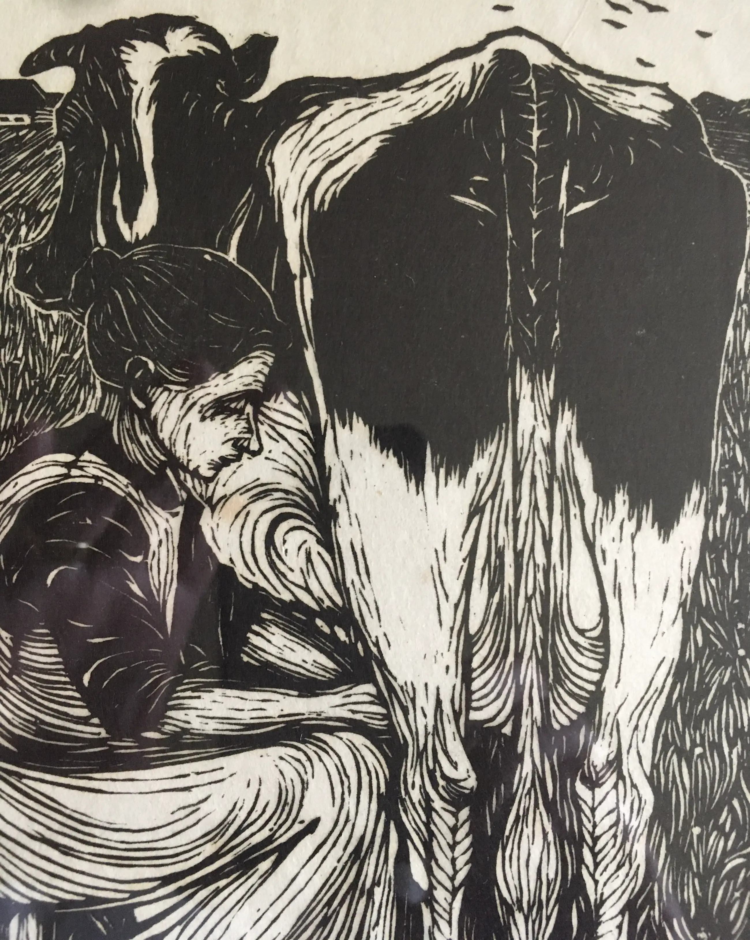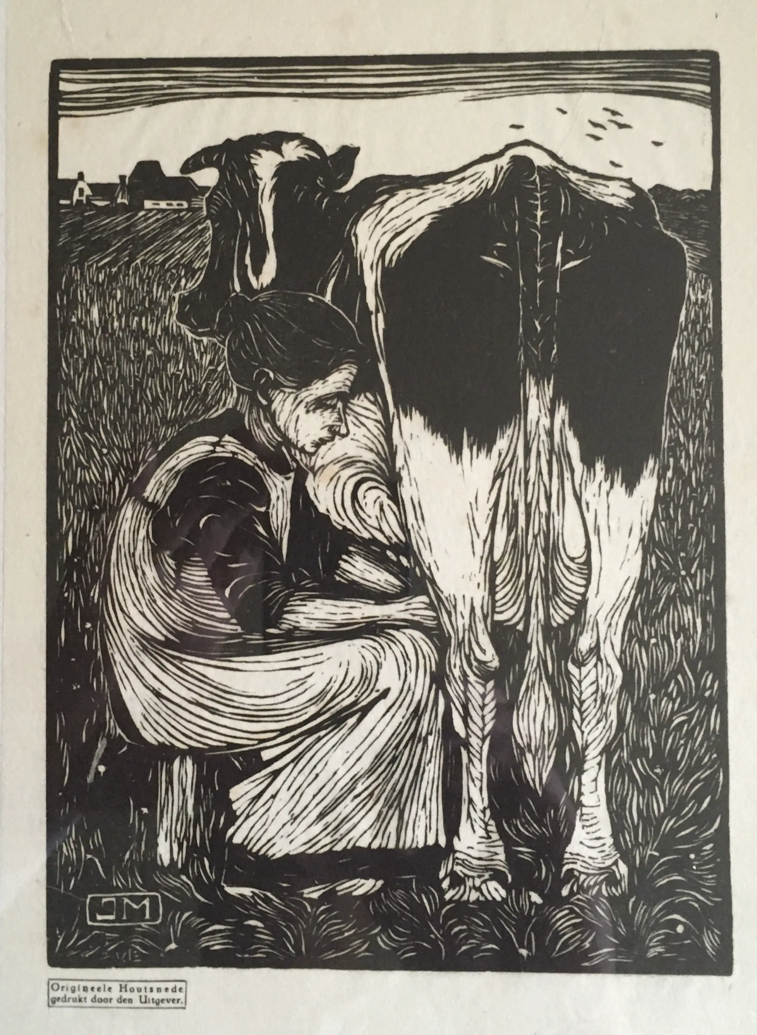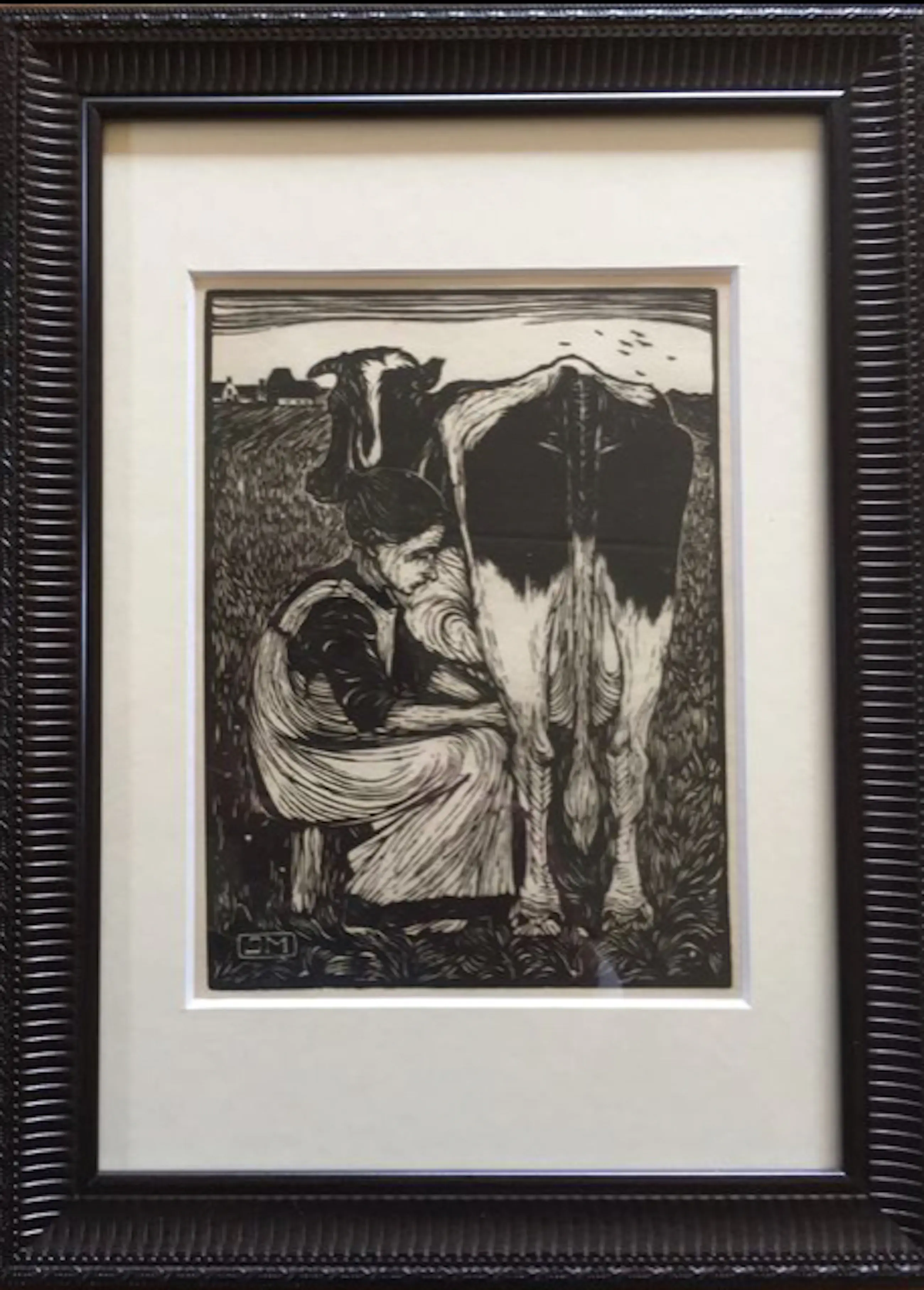 Originele Jan Mankes houtsnede Koemelkster, gesneden in 1914 en afgedrukt op dun Japans papier in 1927. Deze houtsnede zit in de lijst op het oorspronkelijke vel, waardoor deze zeer mooi is gebleven.